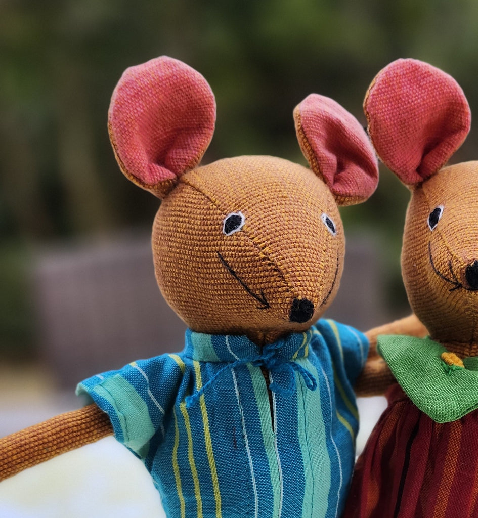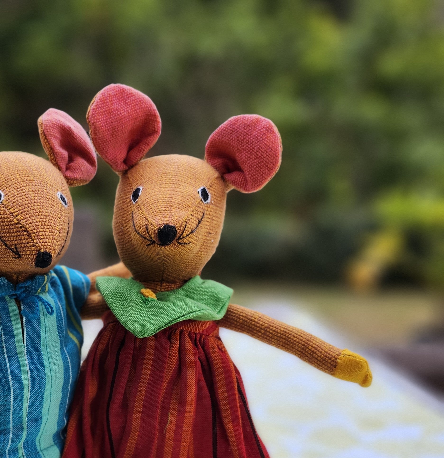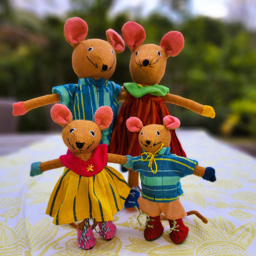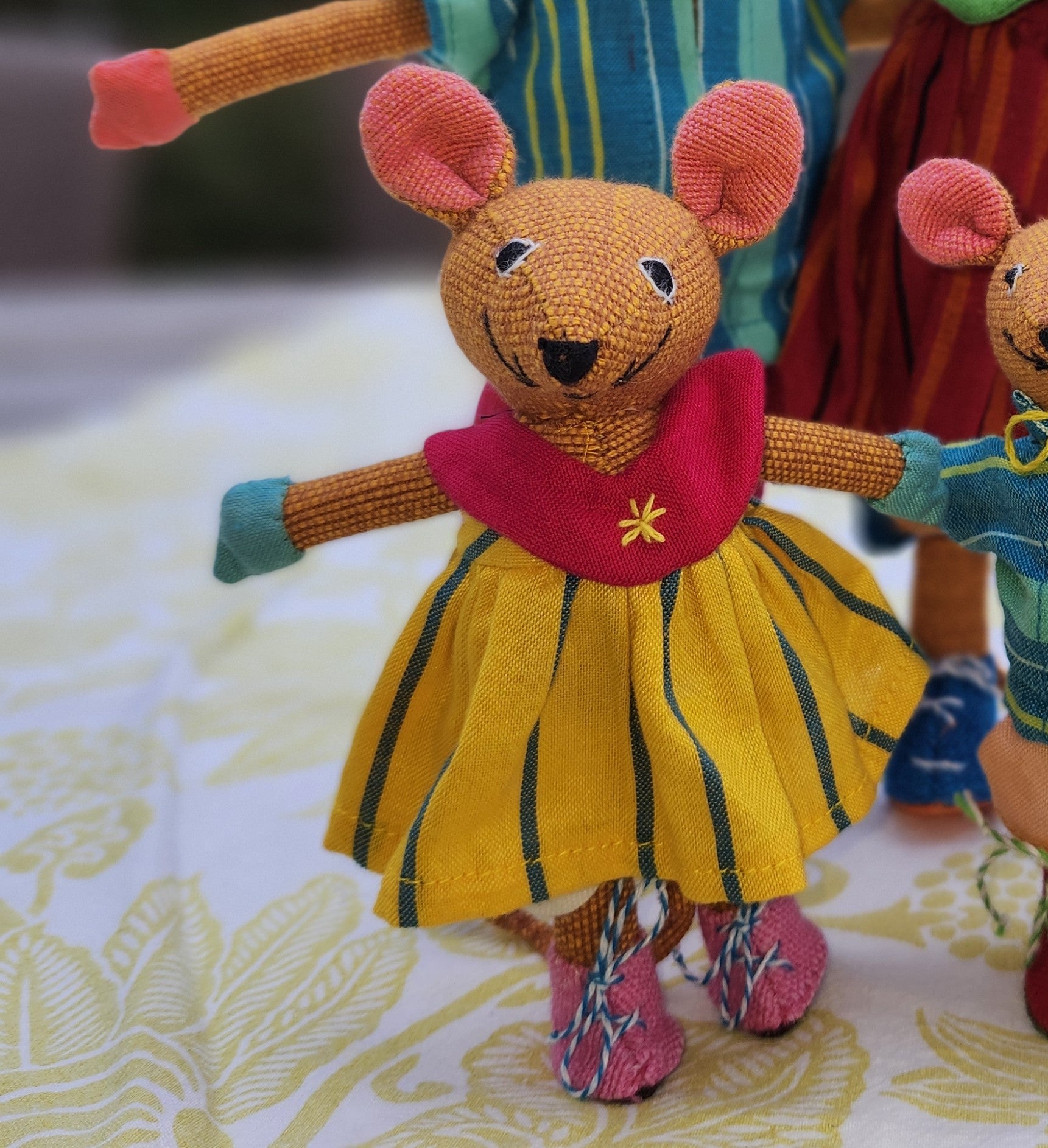 These adorable mice are all made by hand from handwoven fabric. Each one is different, and all of them are wearing colourful clothes and boots, giving them their own charm and character. No artificial fibres.