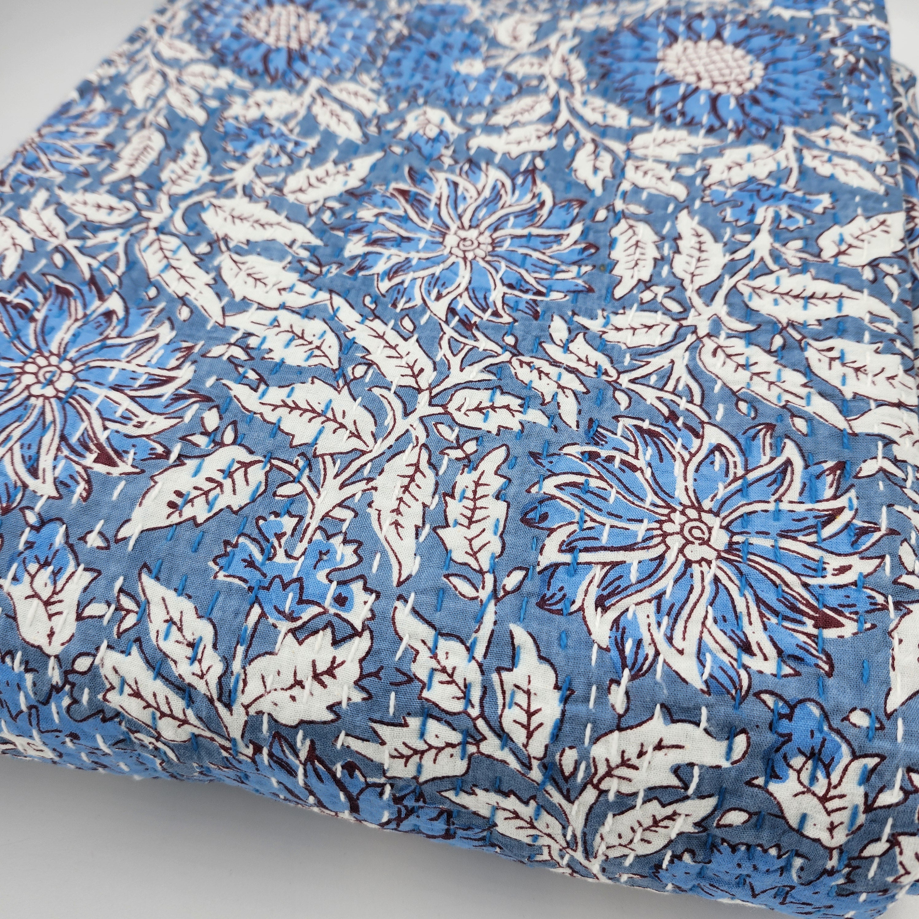 This contemporary take on vintage kanthas uses new block print fabric with hand stitching to create a light weight quilt, bedspread or throw. We have also used them as dramatic tablecloths or curtains. There's a classic blue and white floral pattern on one side, and the other side is a pale blue plain fabric with stitching in two colours.