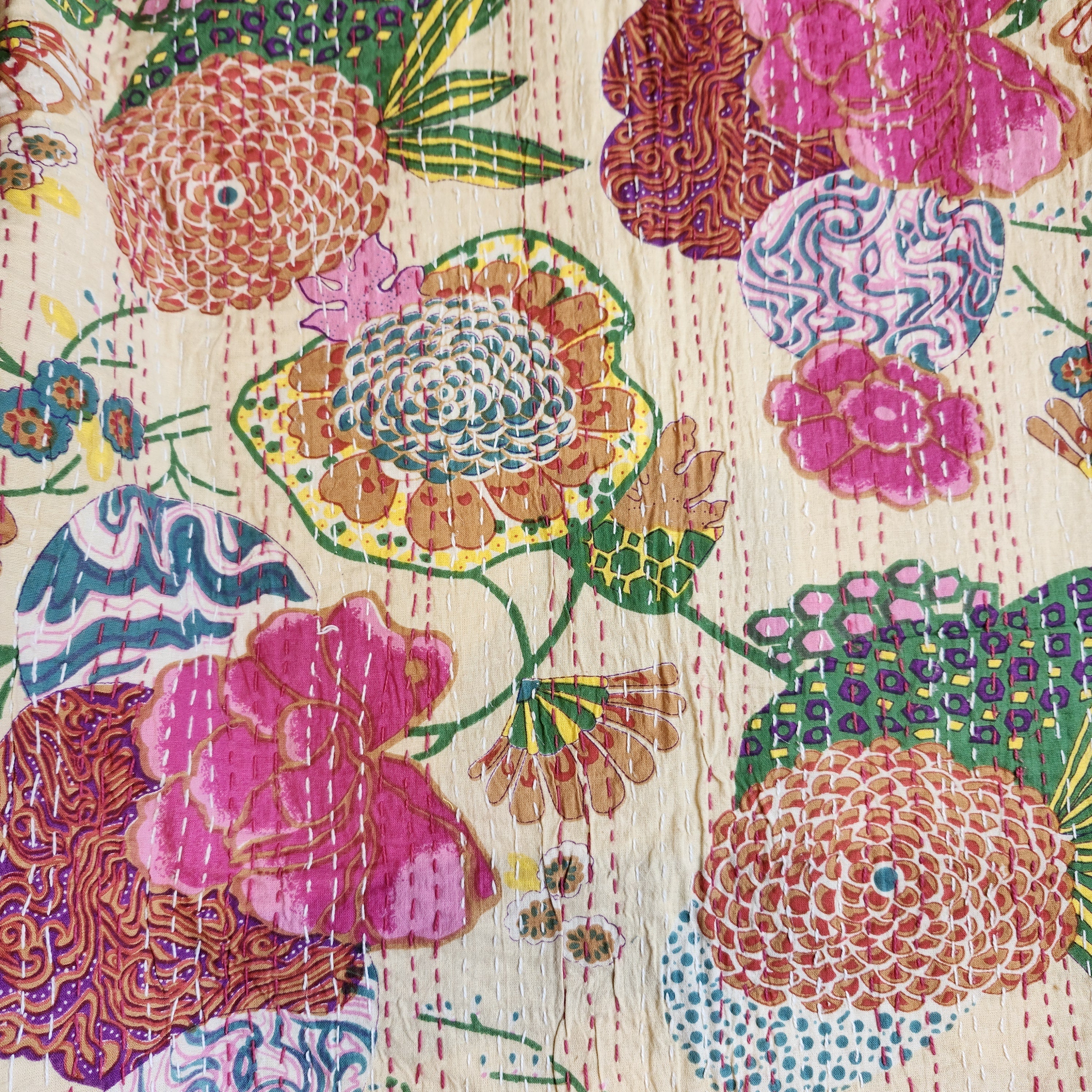 This contemporary take on vintage kanthas uses new block print fabric with hand stitching to create a light weight quilt, bedspread or throw. We have also used them as dramatic tablecloths or curtains. The colourful Java pattern in cream is on one side, and the other side is plain white fabric with stitching in two colours.