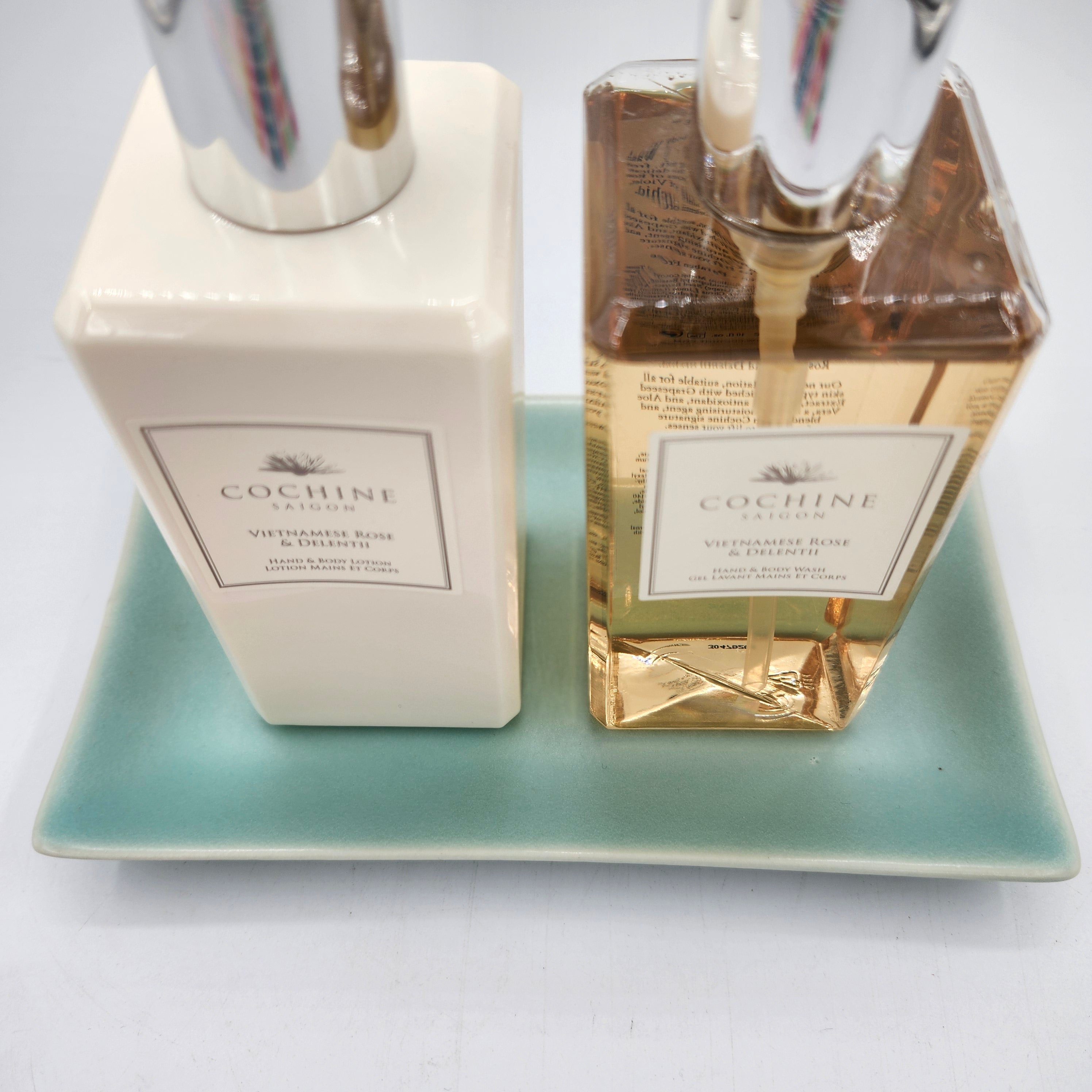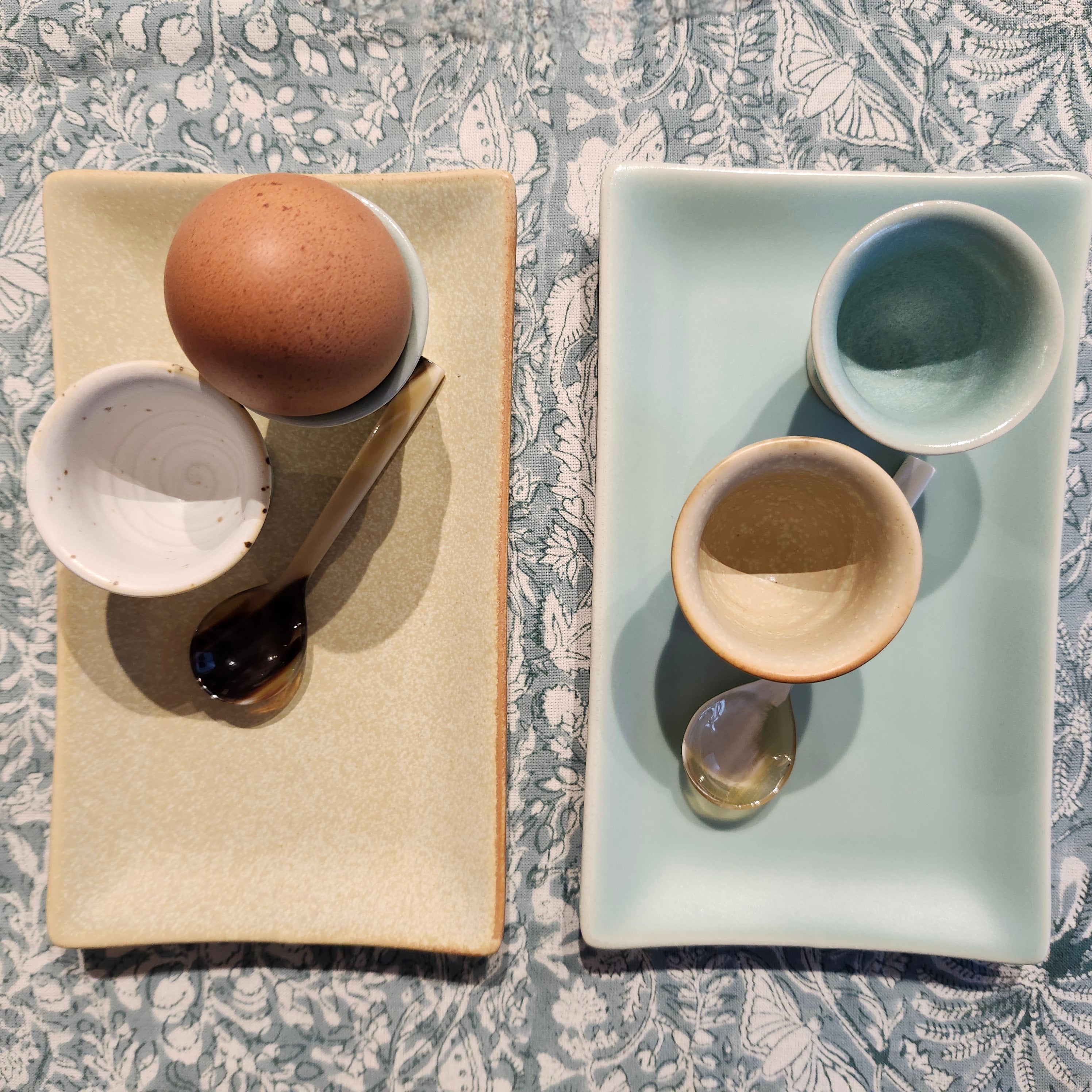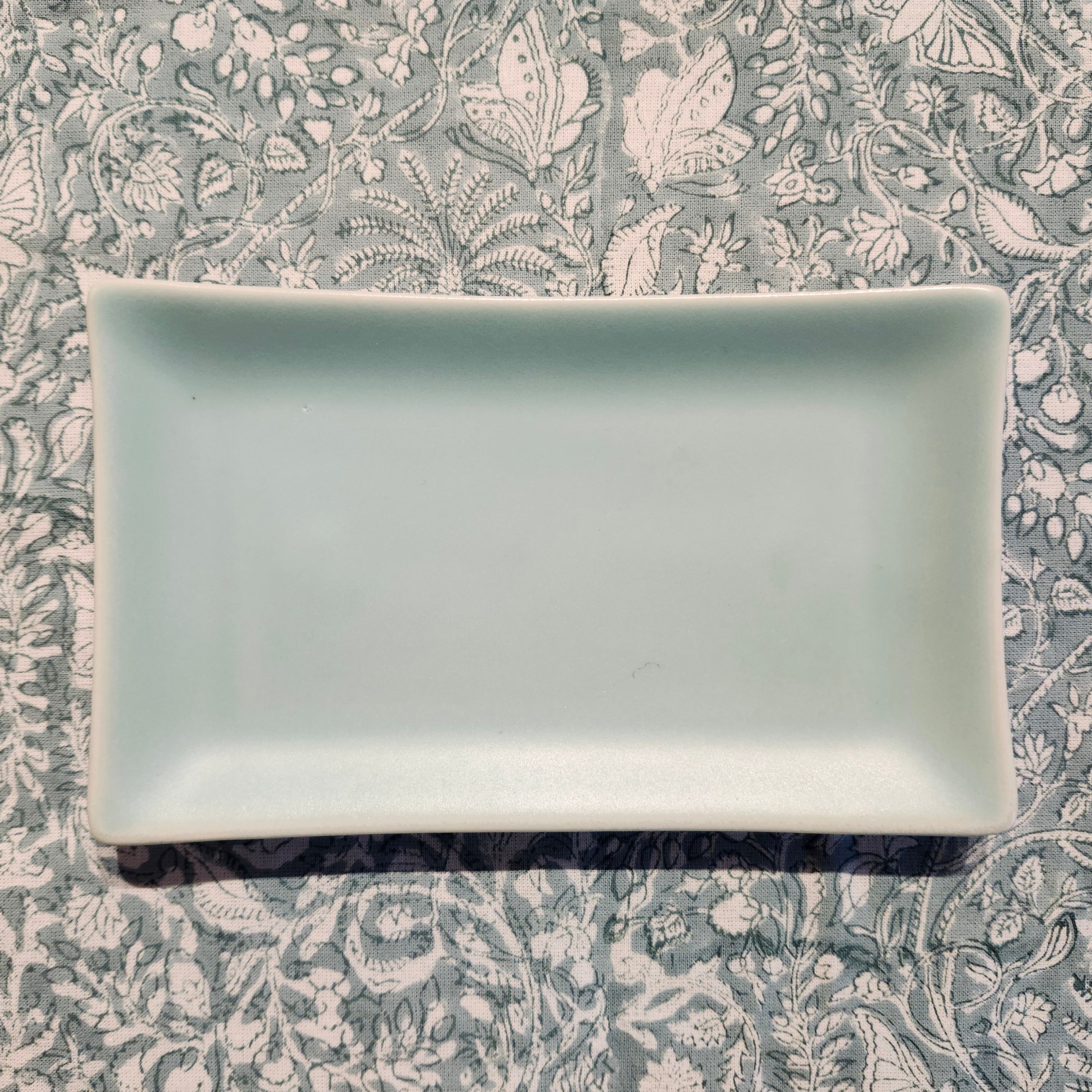 A versatile ceramic rectangular dish with a matte finish, in teal or taupe. Use in a bathroom as a soap dish or small tray, or on the table as a small platter, perhaps with matching egg cups in teal or taupe.