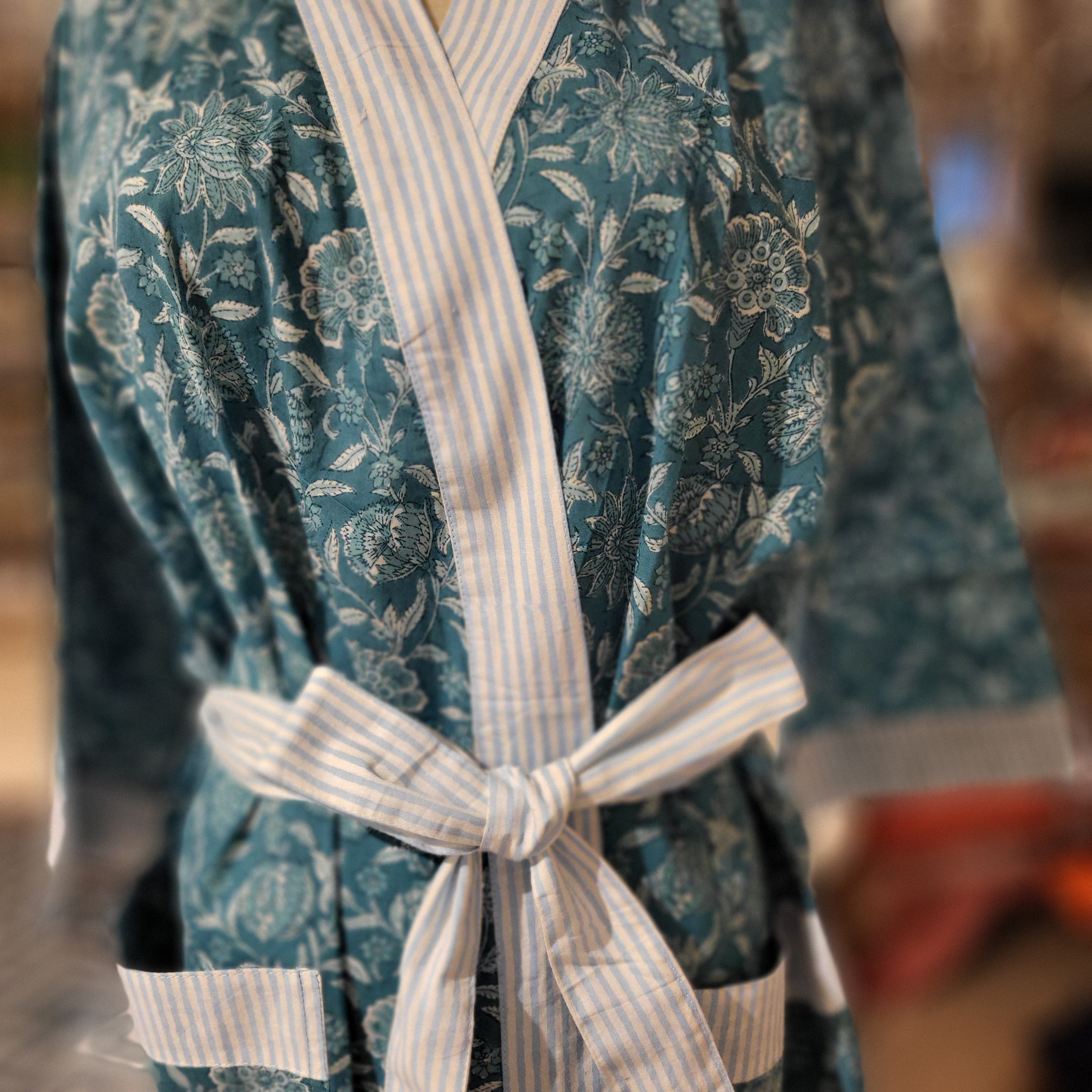 In contrast to some of our more exuberantly coloured block print robes, we have a calm and understated floral print in the most lovely shade of teal, with a pale blue and white stripe contrast trim, for a relaxing bed and bath experience.
