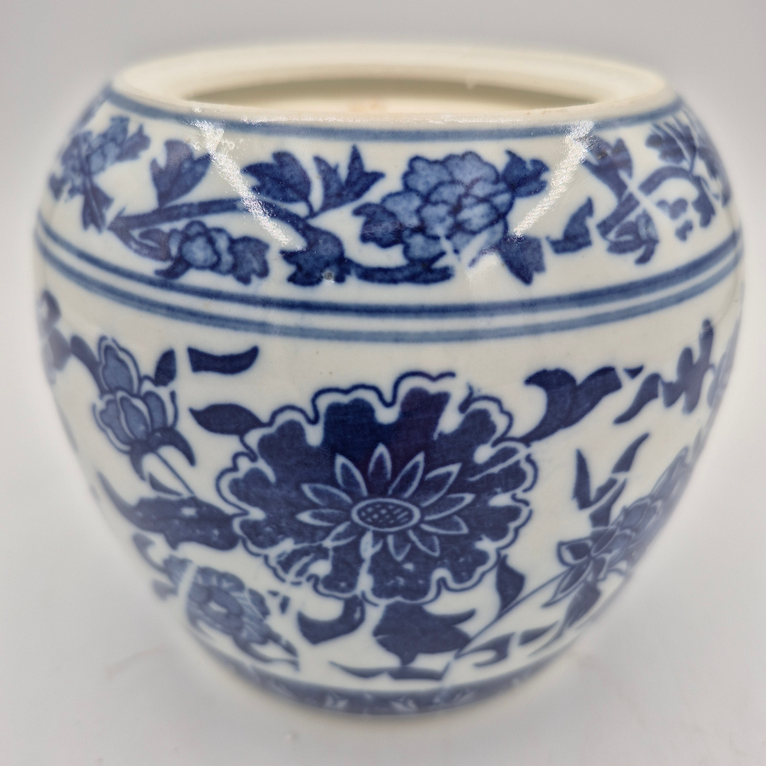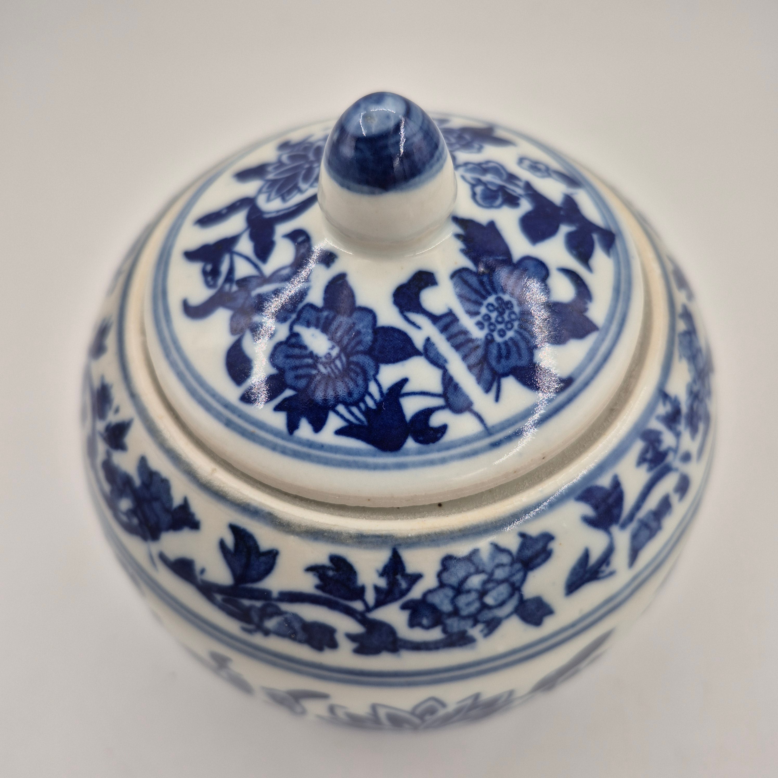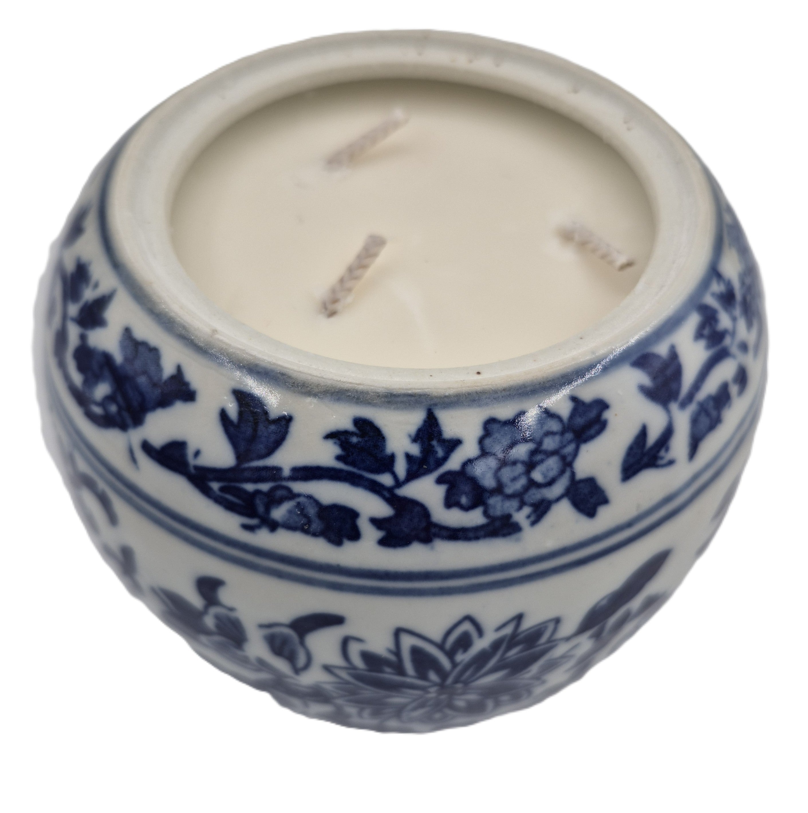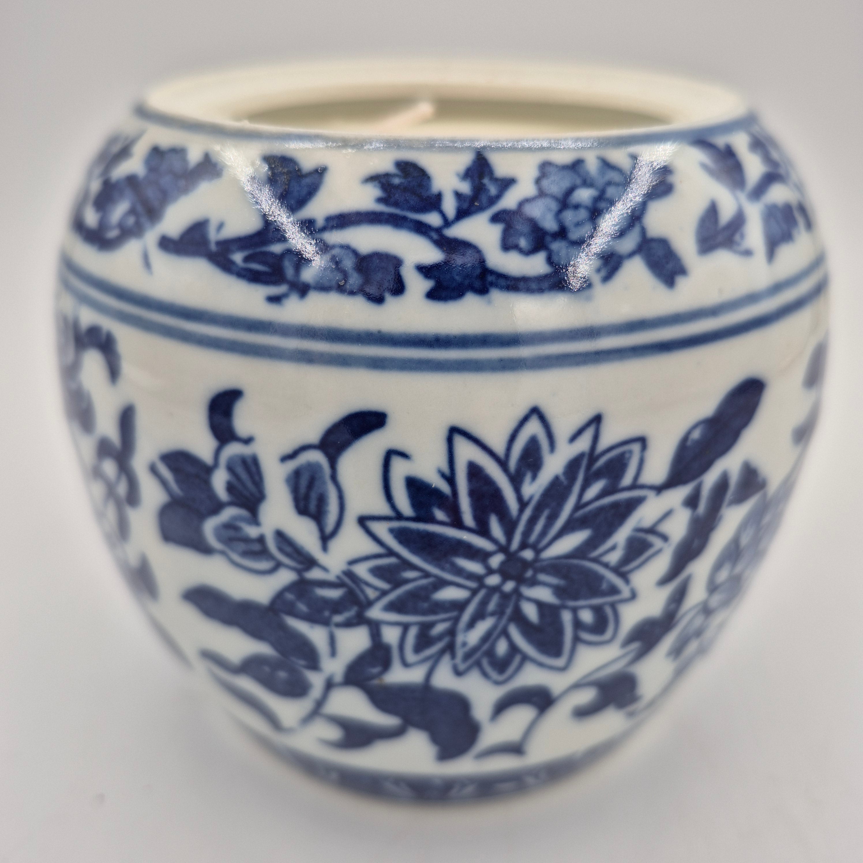 A classic blue & white jar with a lid, filled with the 'Big Wave Bay' Scent. It has wicks.