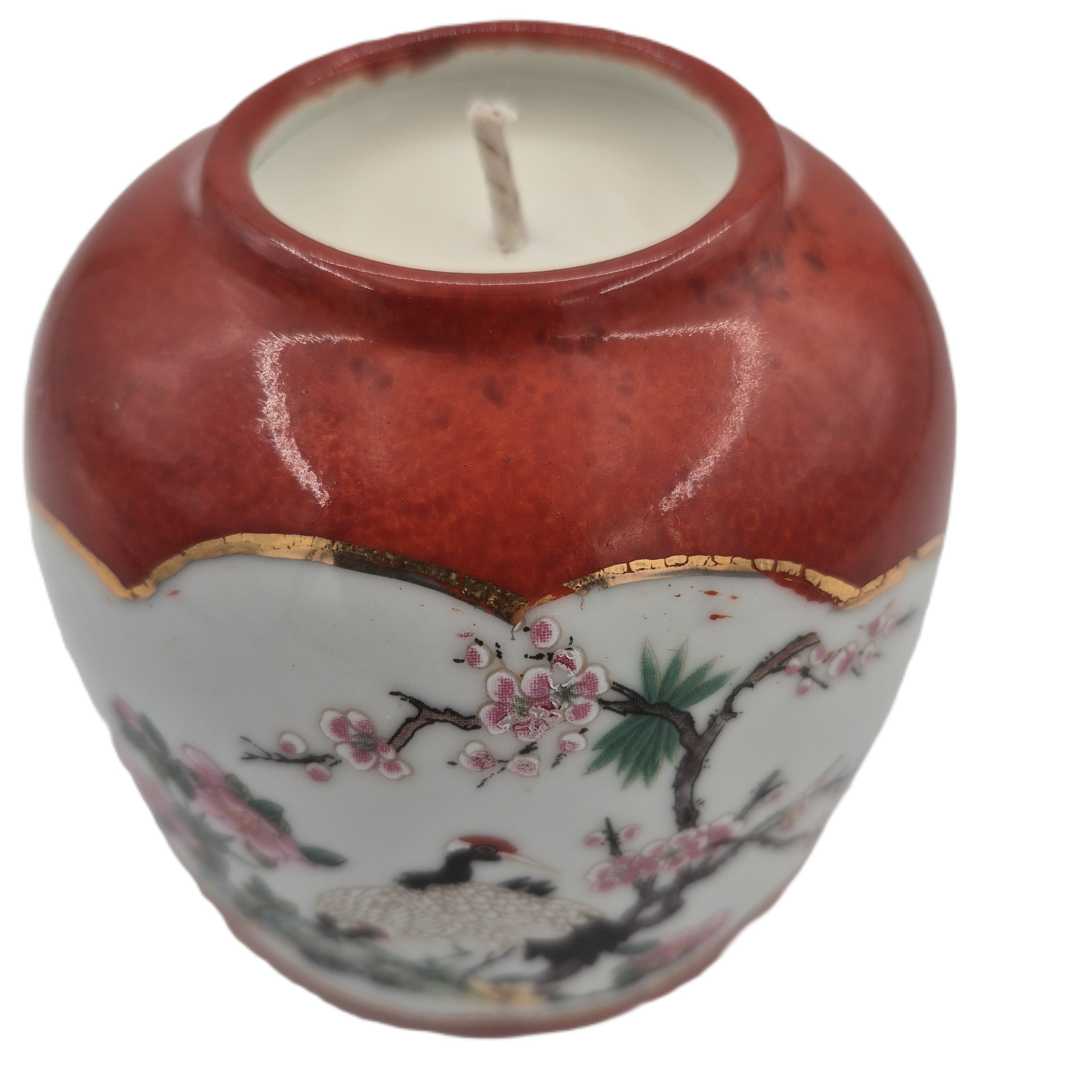 A beautiful vase in burgundy ceramic, with a painted panel featuring cranes (the bird!) and blossoms. Available in two scents, and packaged in a simple, elegant box.