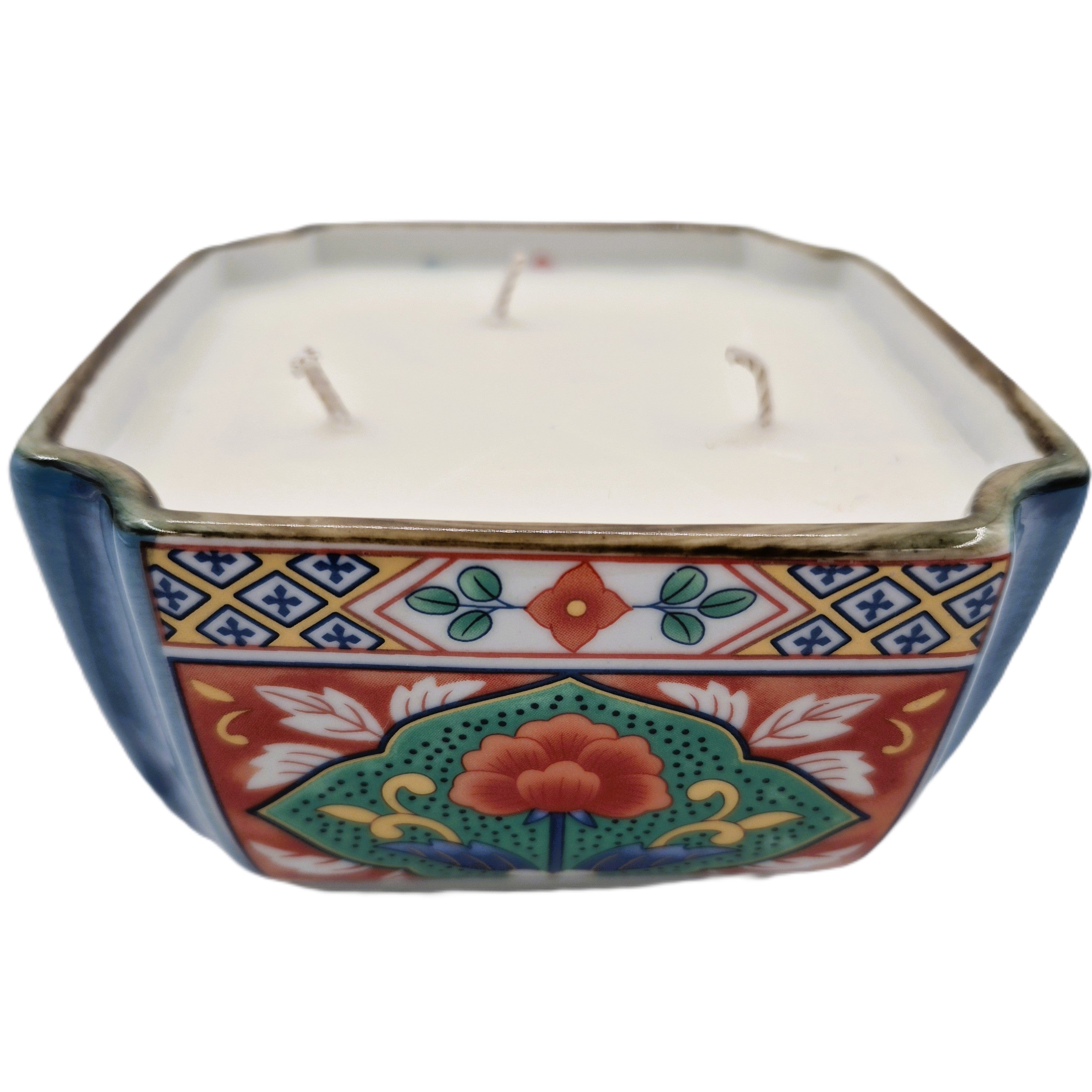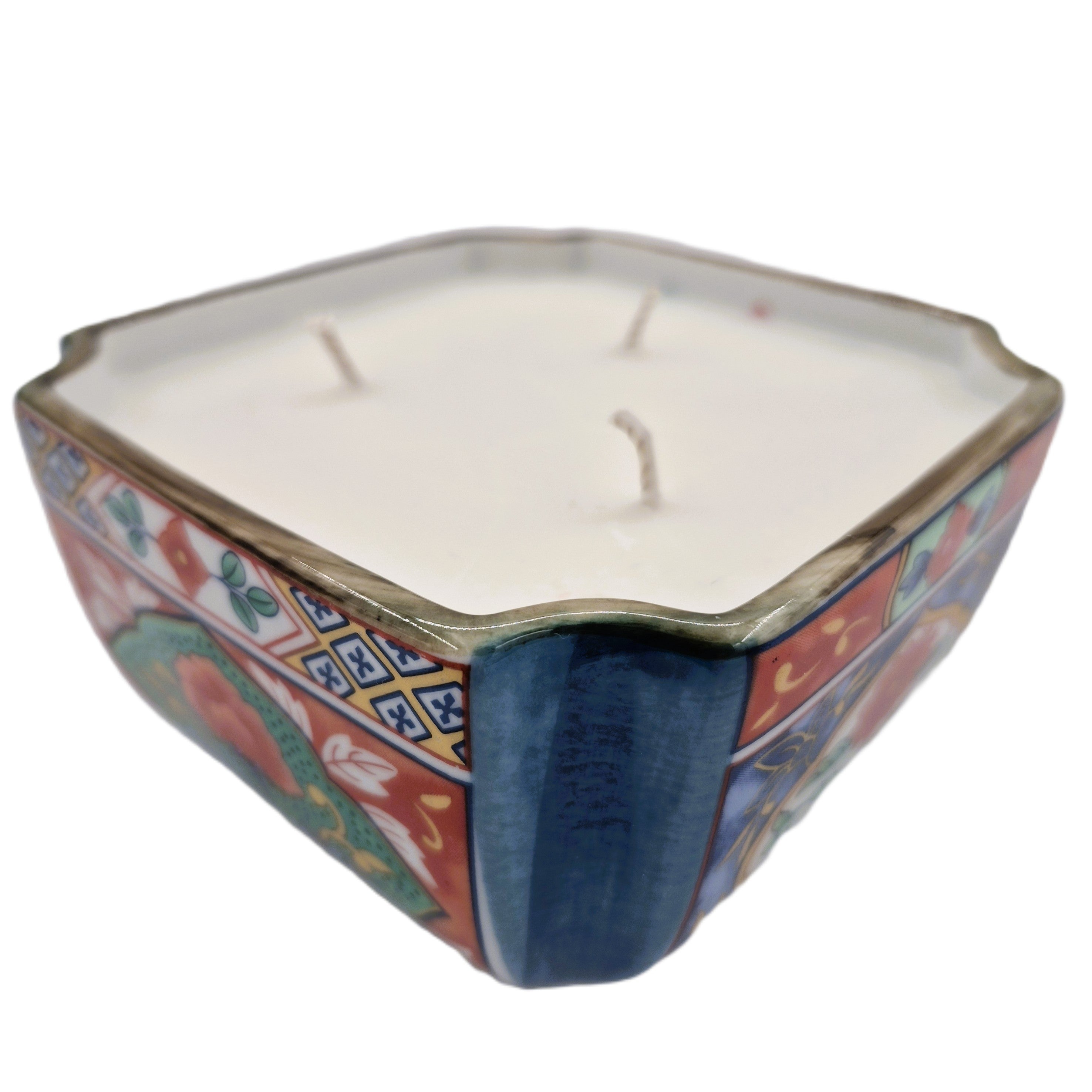 A porcelain square dish painted in the 'Imari' style. The candle comes in a gift box.