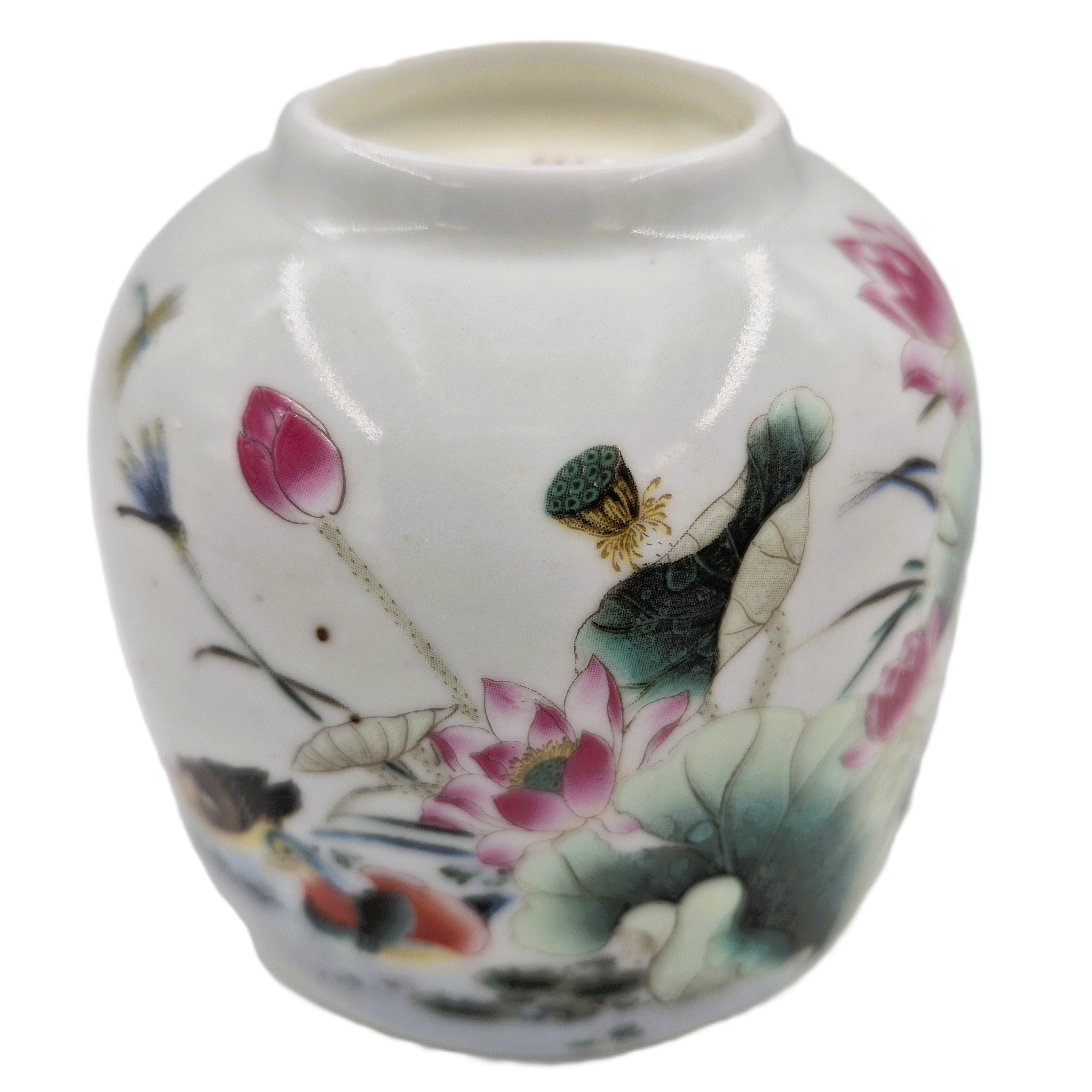 A small vintage pot, painted with lotus leaves and flowers.