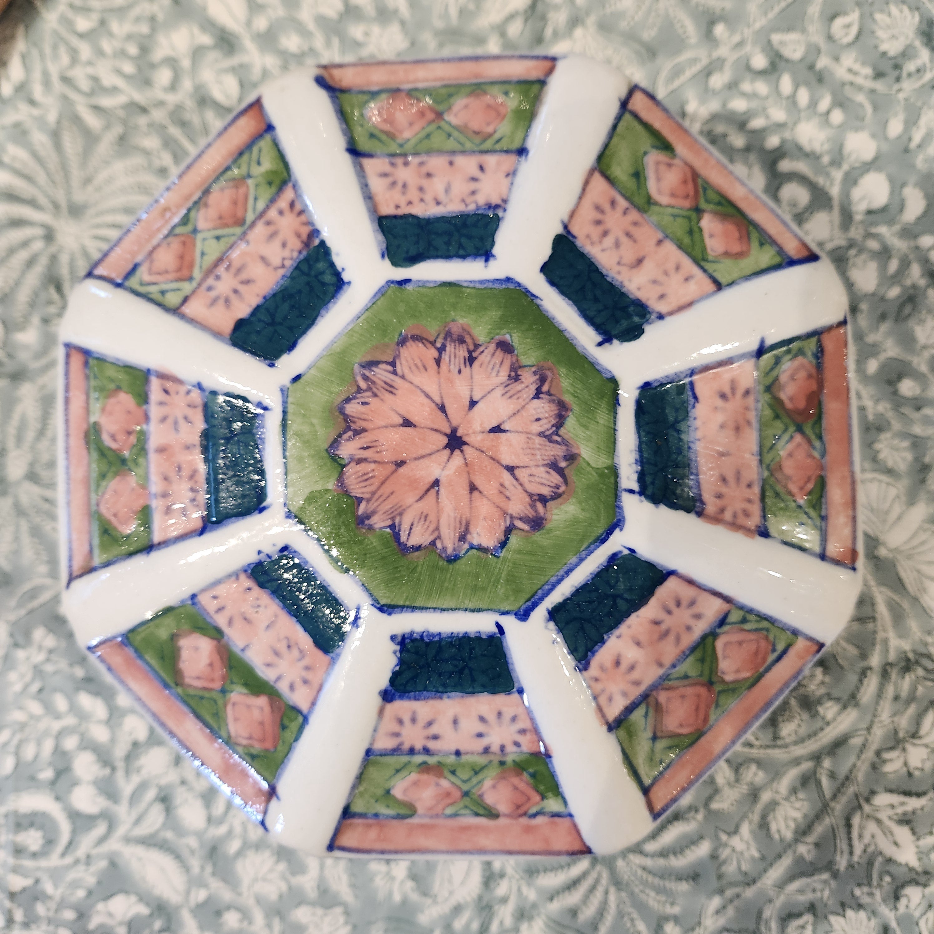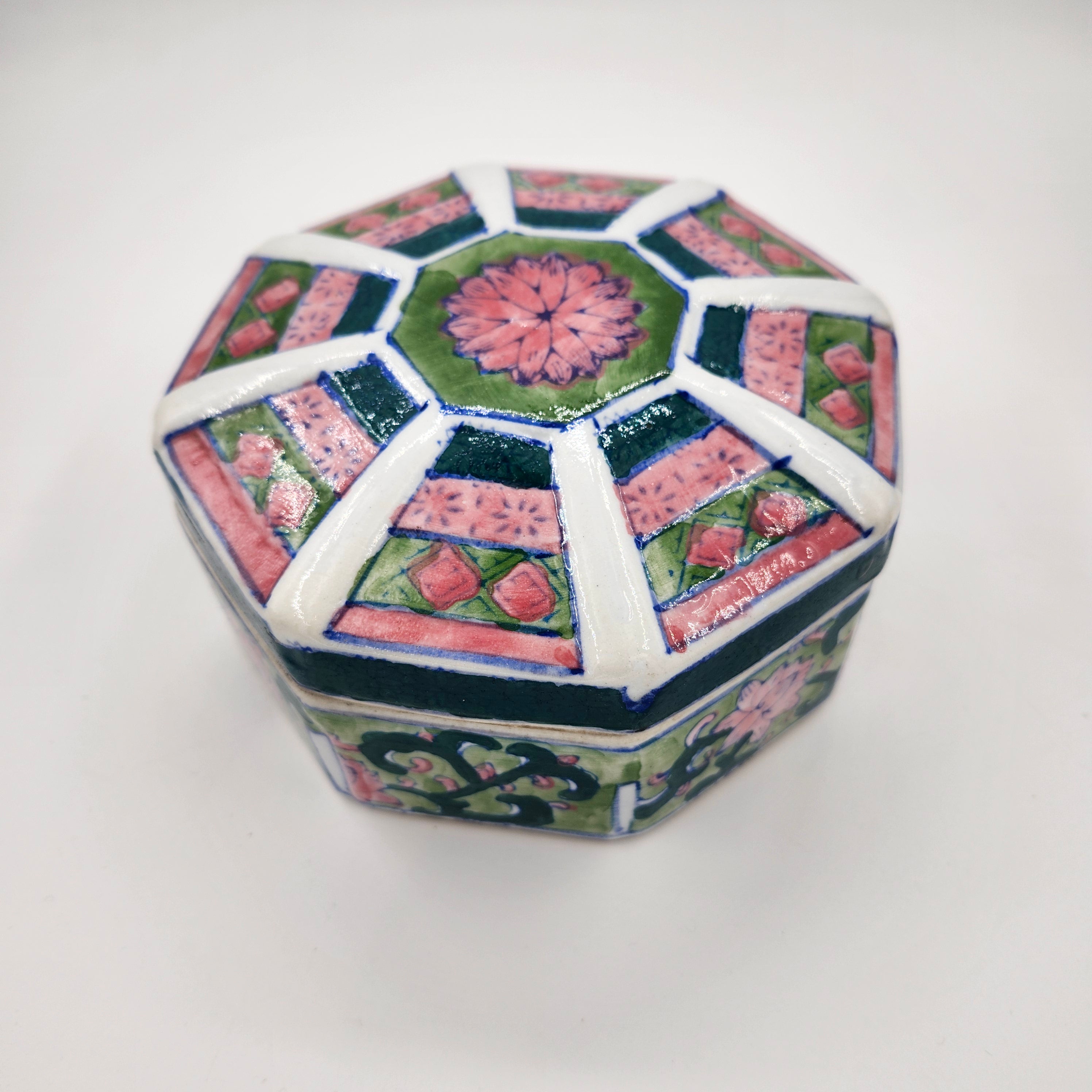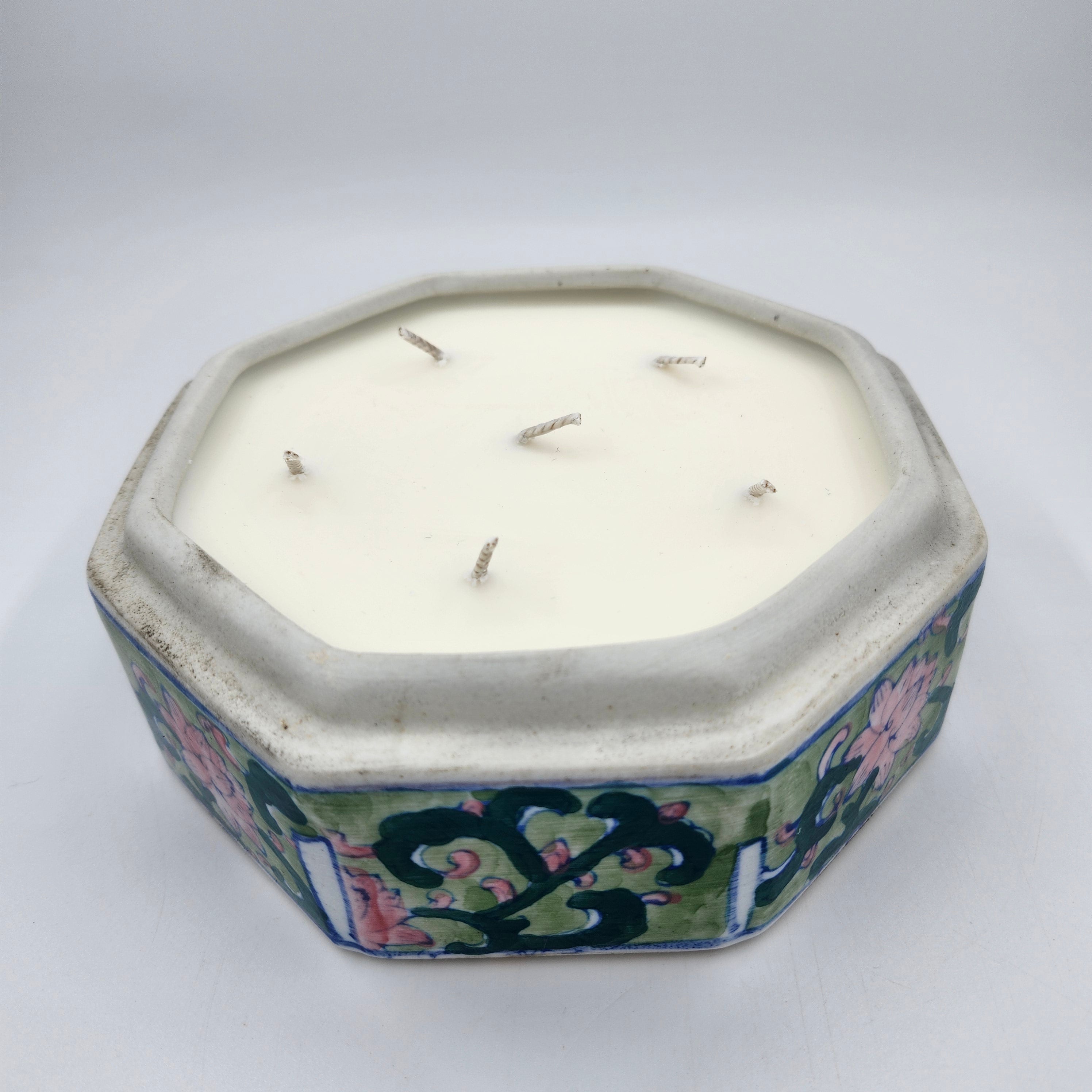 A 'Stanley' scented candle in an upcycled octagonal ceramic box, with a lid. It is painted with a floral design in shades of pink, green and blue, and comes in an elegant but simple gift box.