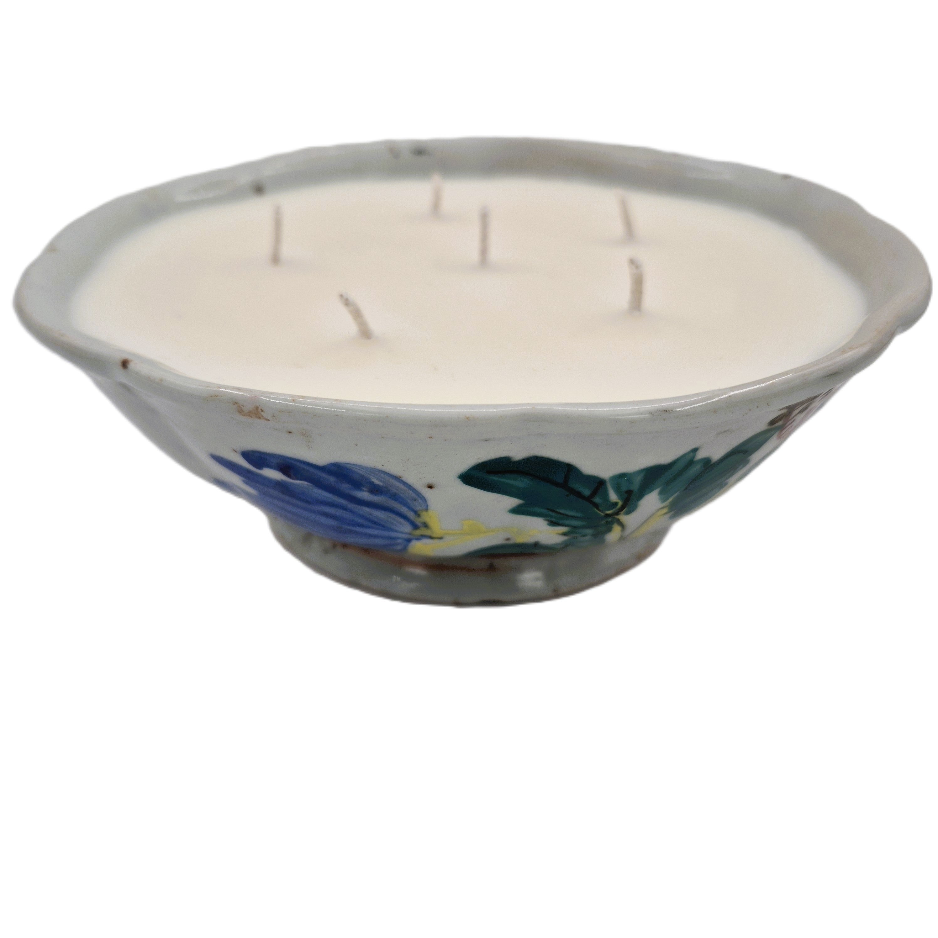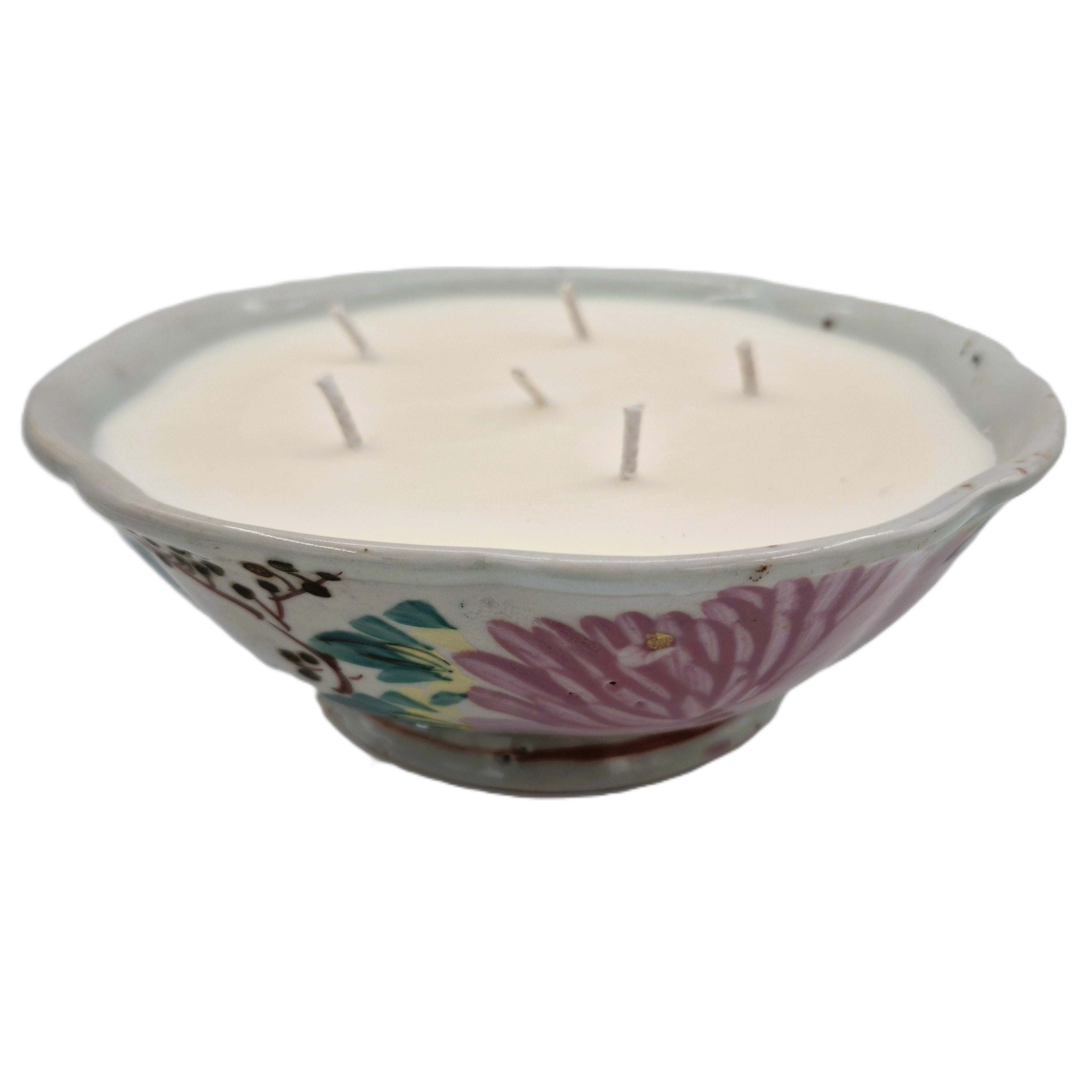 A large 'Stanley' scented candle in a ceramic bowl, which features a painted pink crysanthemum and other flowers. It comes in an elegant but simple gift box.