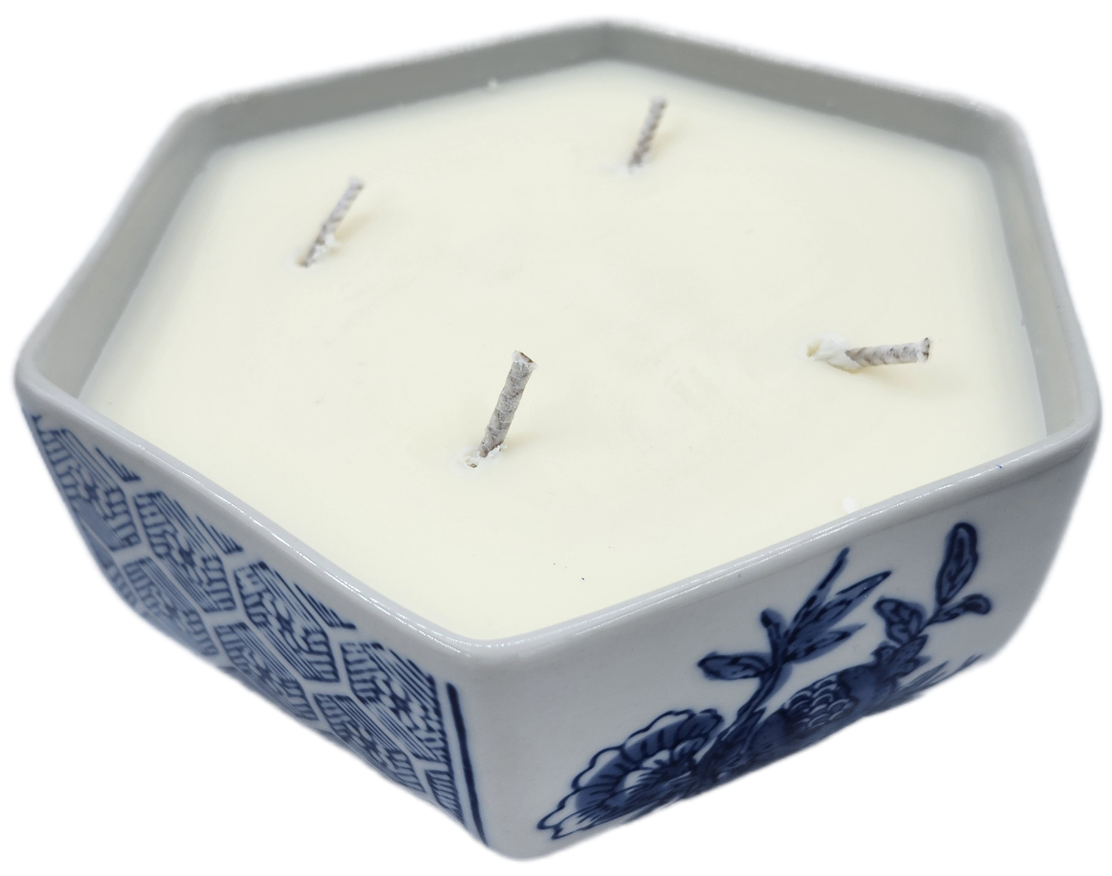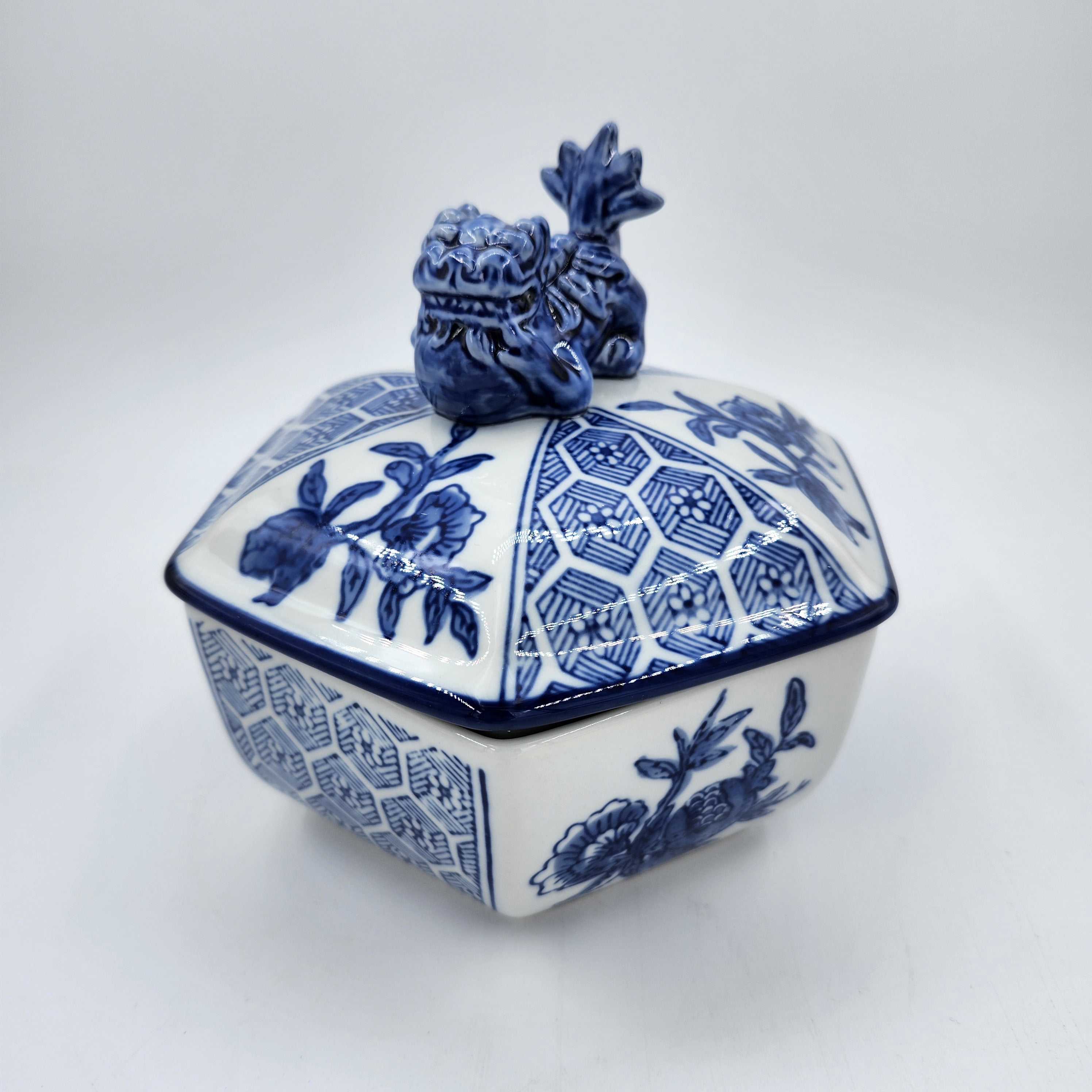 A handsome Qilin (or Chinese unicorn) sits atop the lid of this gorgous scented candle, in a six-sided dish.