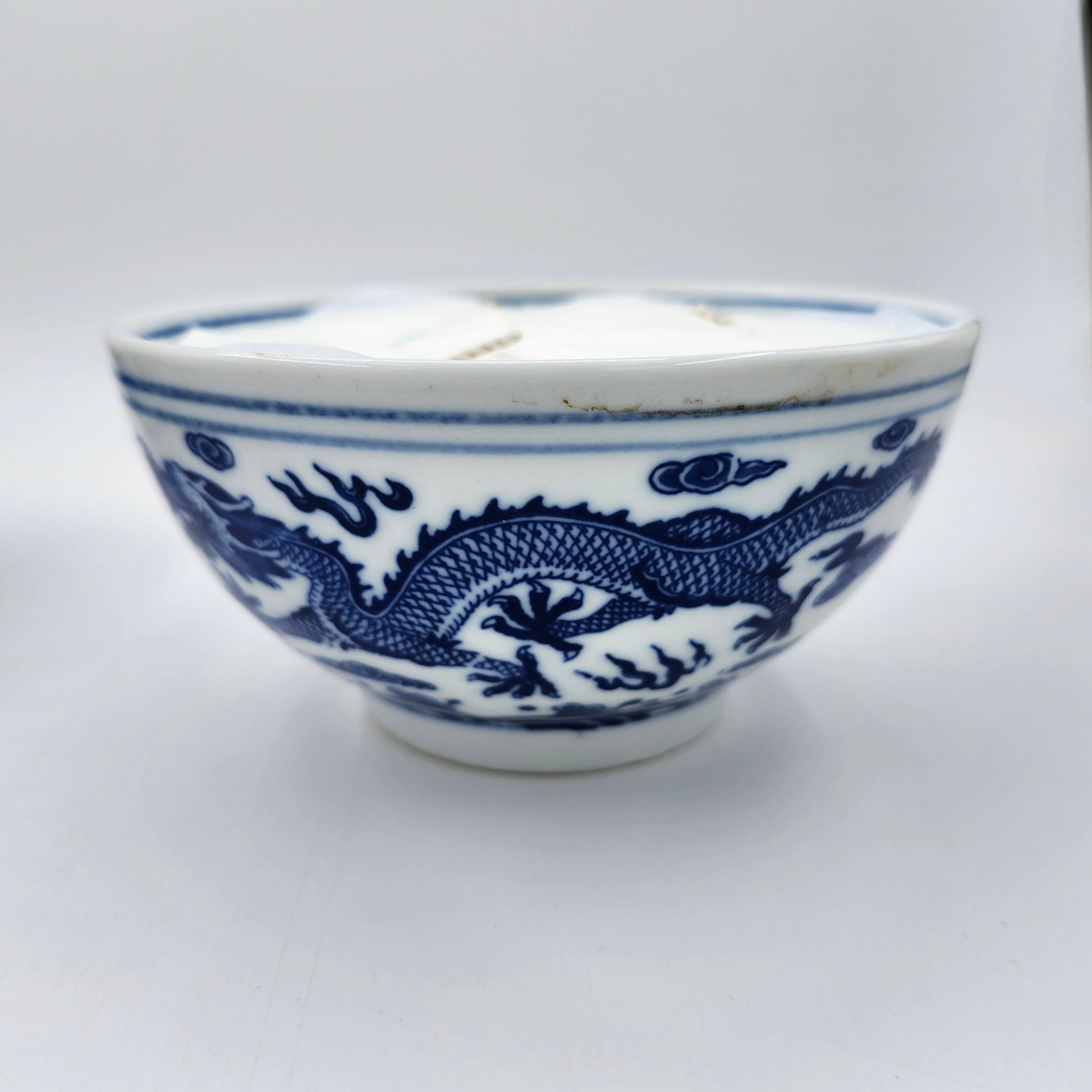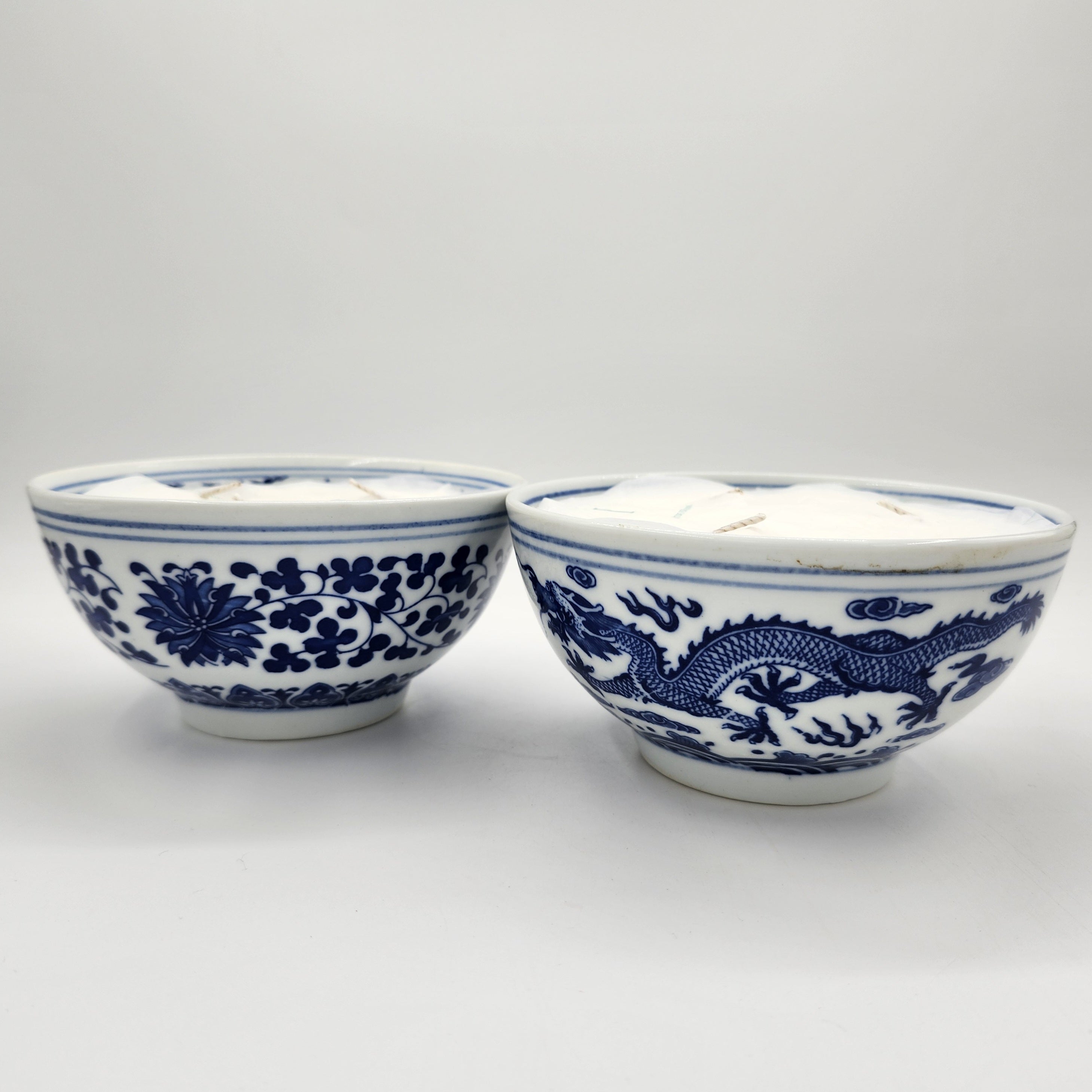 A set of 2 scented candles in small bowls, painted in classic blue & white, with one featuring dragons and one featuring blue flowers. The Dragon is scented with Mui Wo, and the Flowers with Happy Valley.