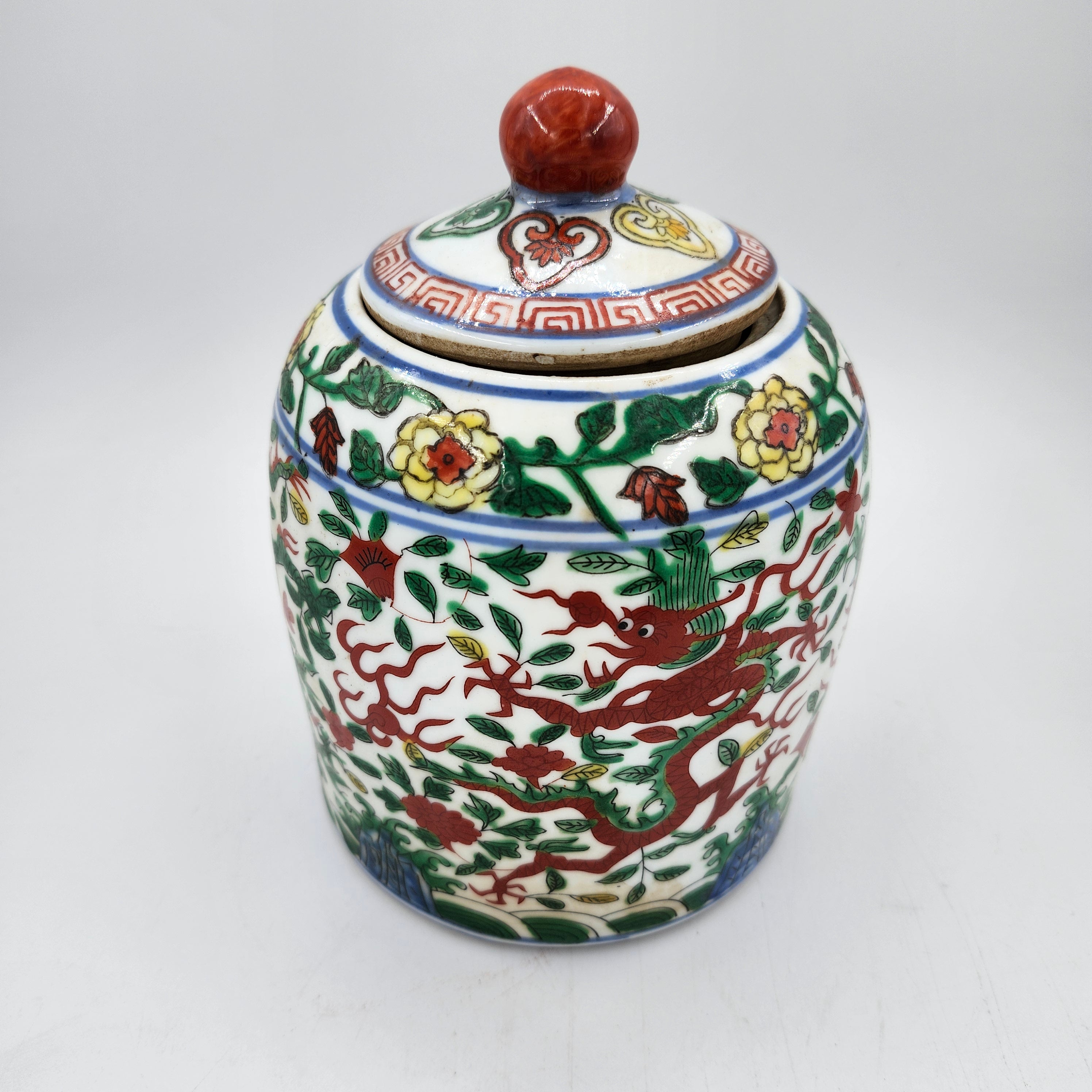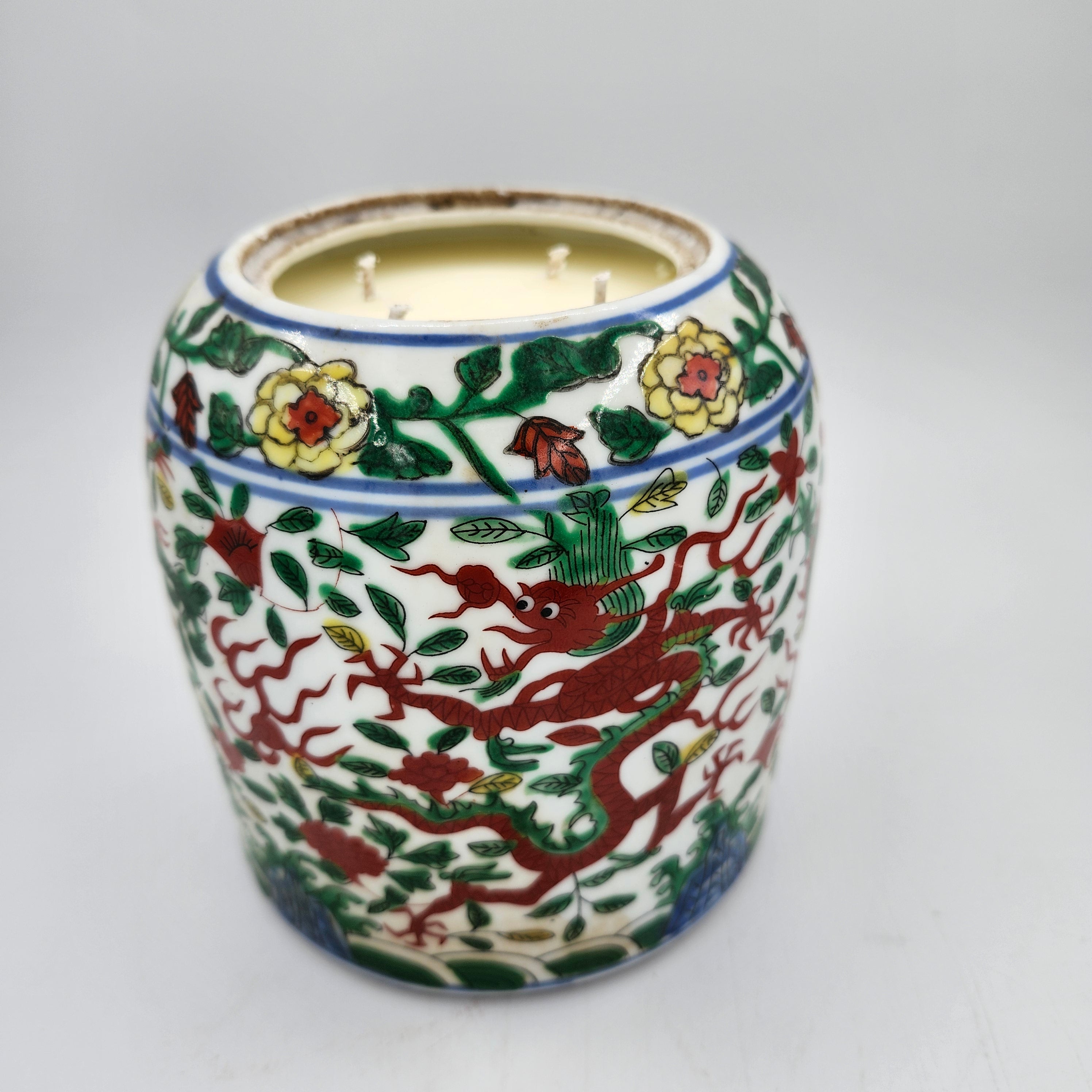 A charming scented candle in a large upcycled ceramic jar with a lid, decorated with foliage and green and brown dragons.  Packaged in a simple, elegant box.