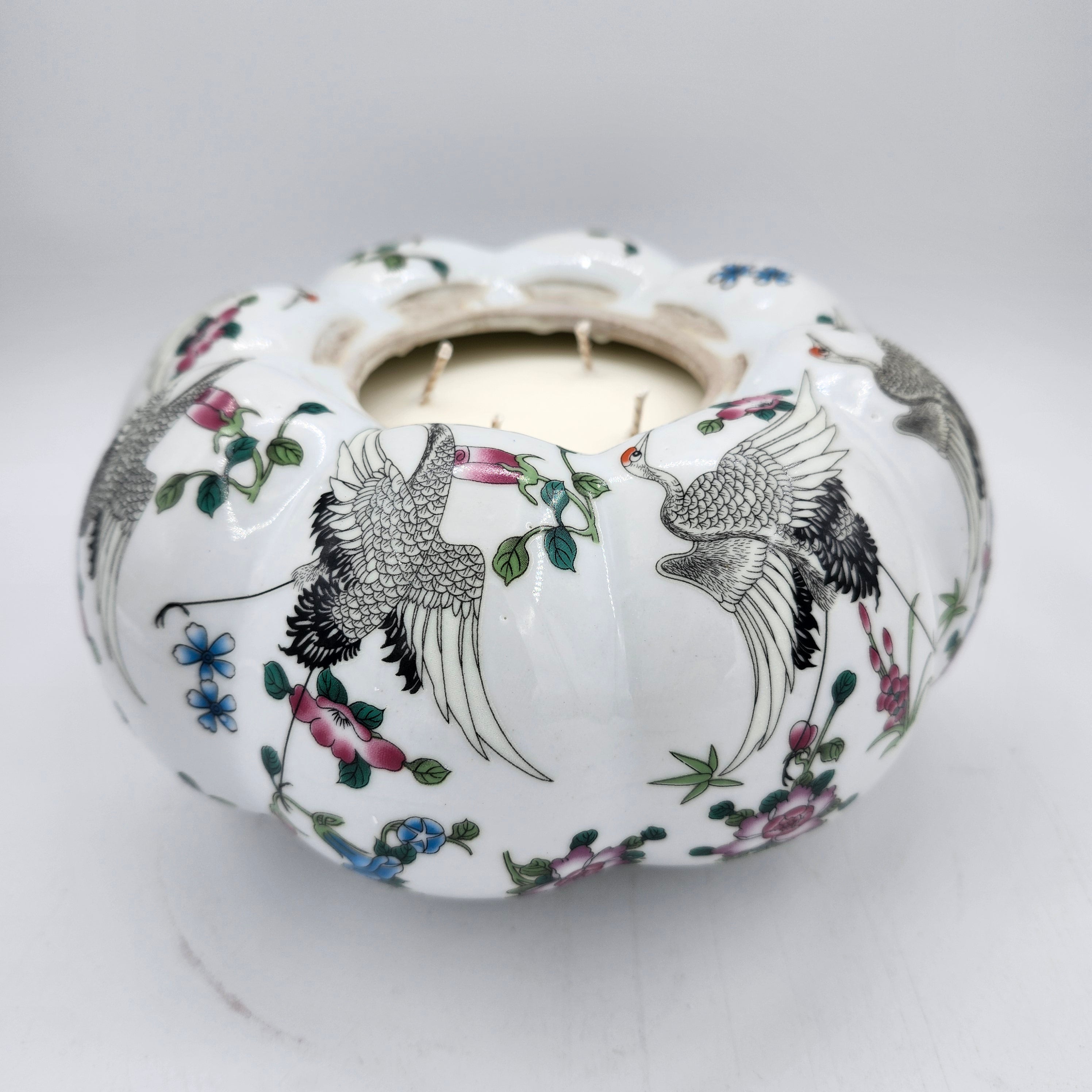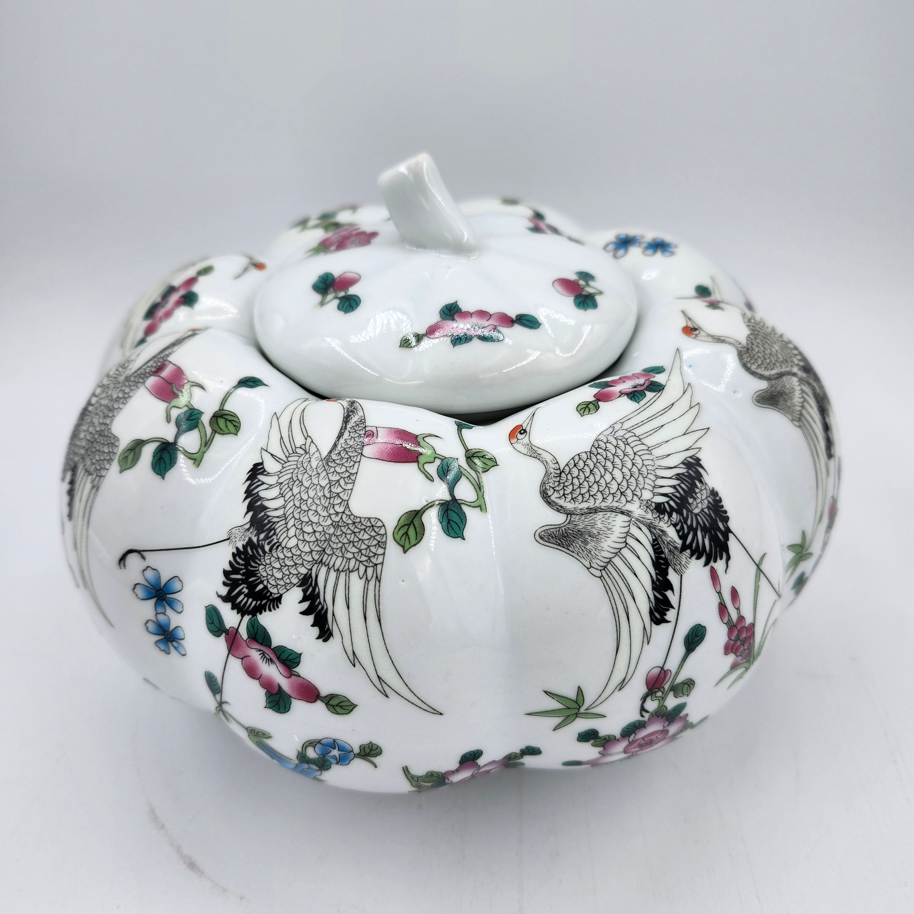 A large 'Stanley' scented candle in a pumpkin shaped ceramic pot with a lid. The pot is decorated with cranes against a white background. It comes in an elegant but simple gift box.