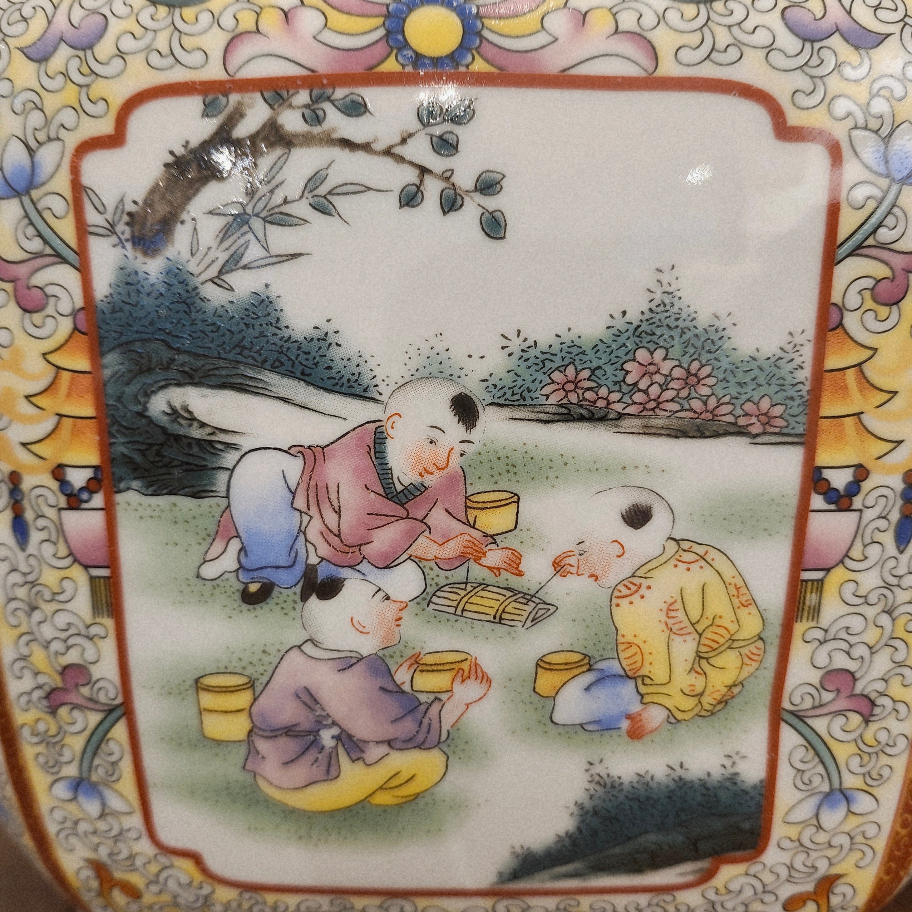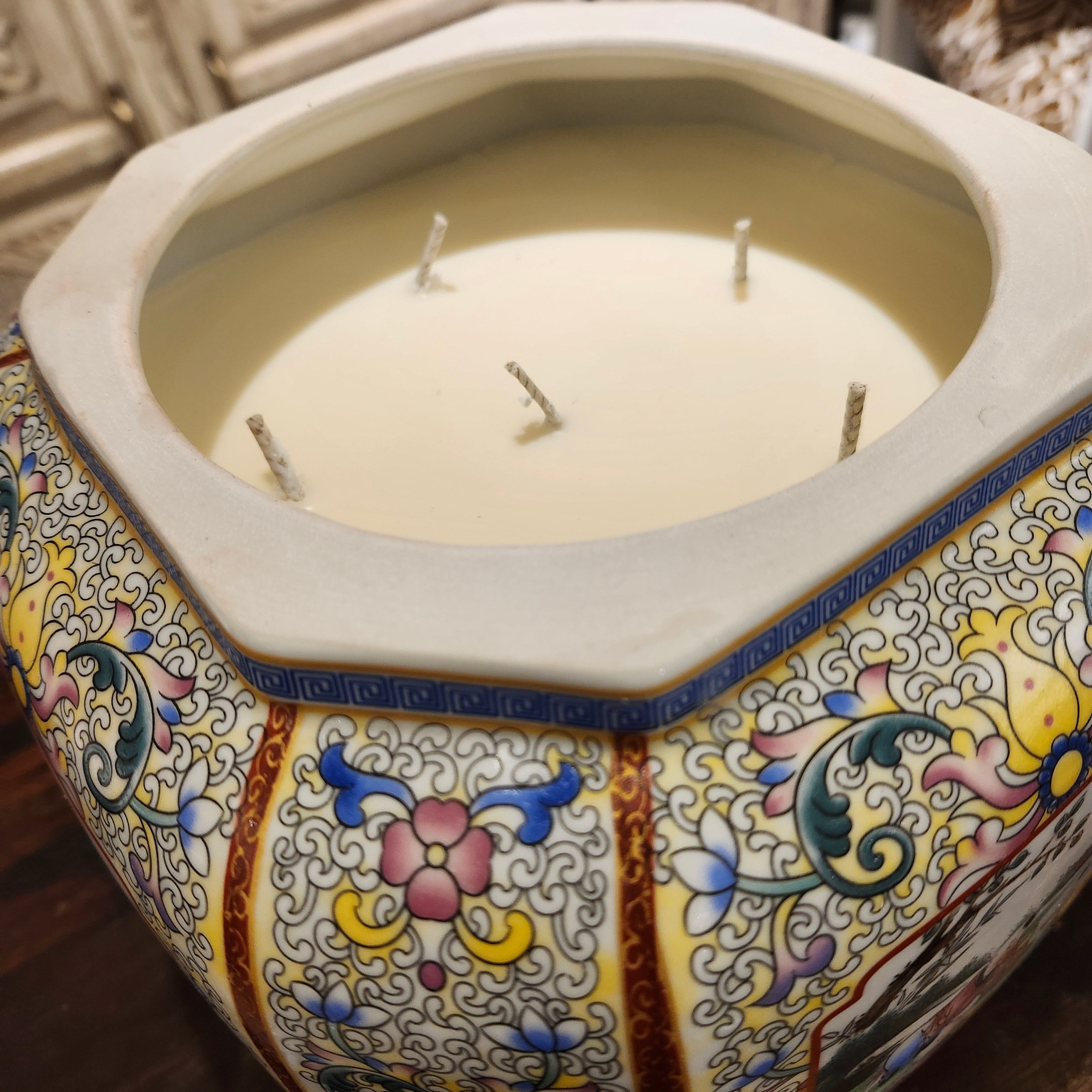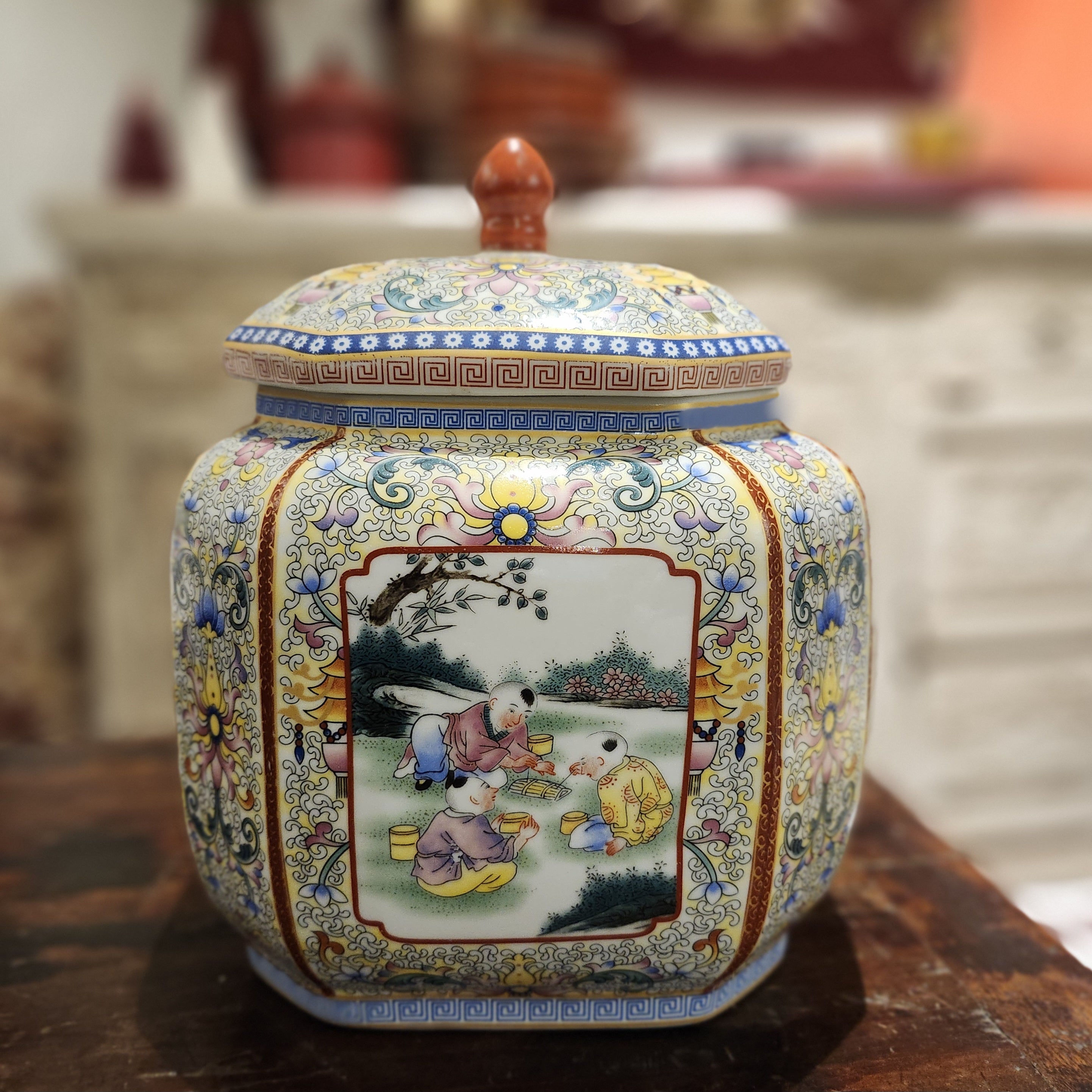 This fabulous scented candle is a truly special statement piece, and features the 'Happy Valley' scent. It is in a hand-painted vintage square pot with a domed lid. Each of the four sides has a panel, painted in the classic style with scenes of children at play or eating.