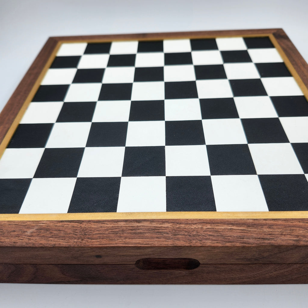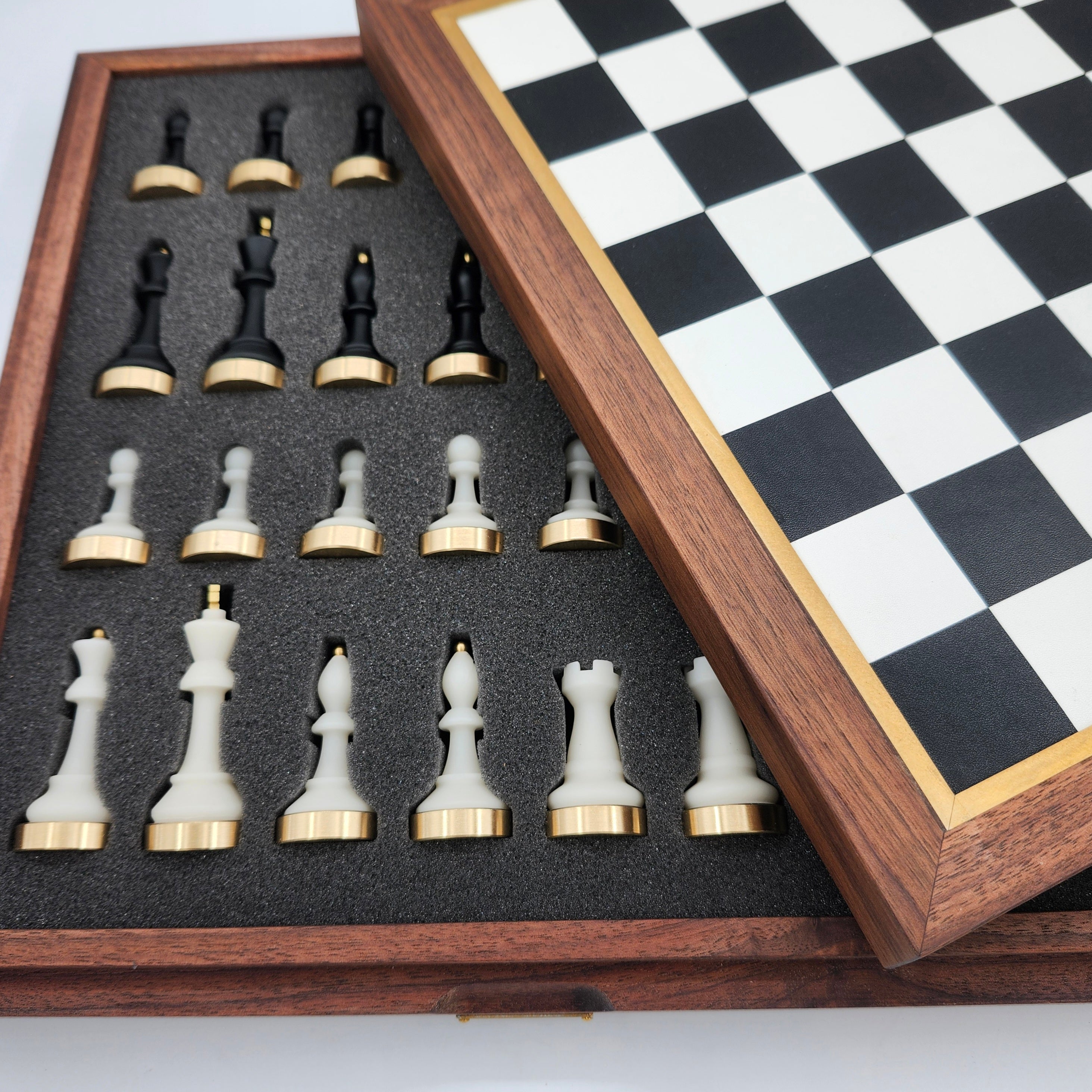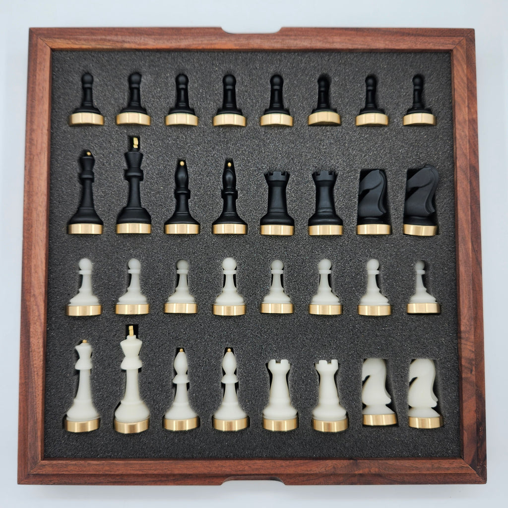 - Unique resin-concrete chess pieces for durability and distinction, with brass bases