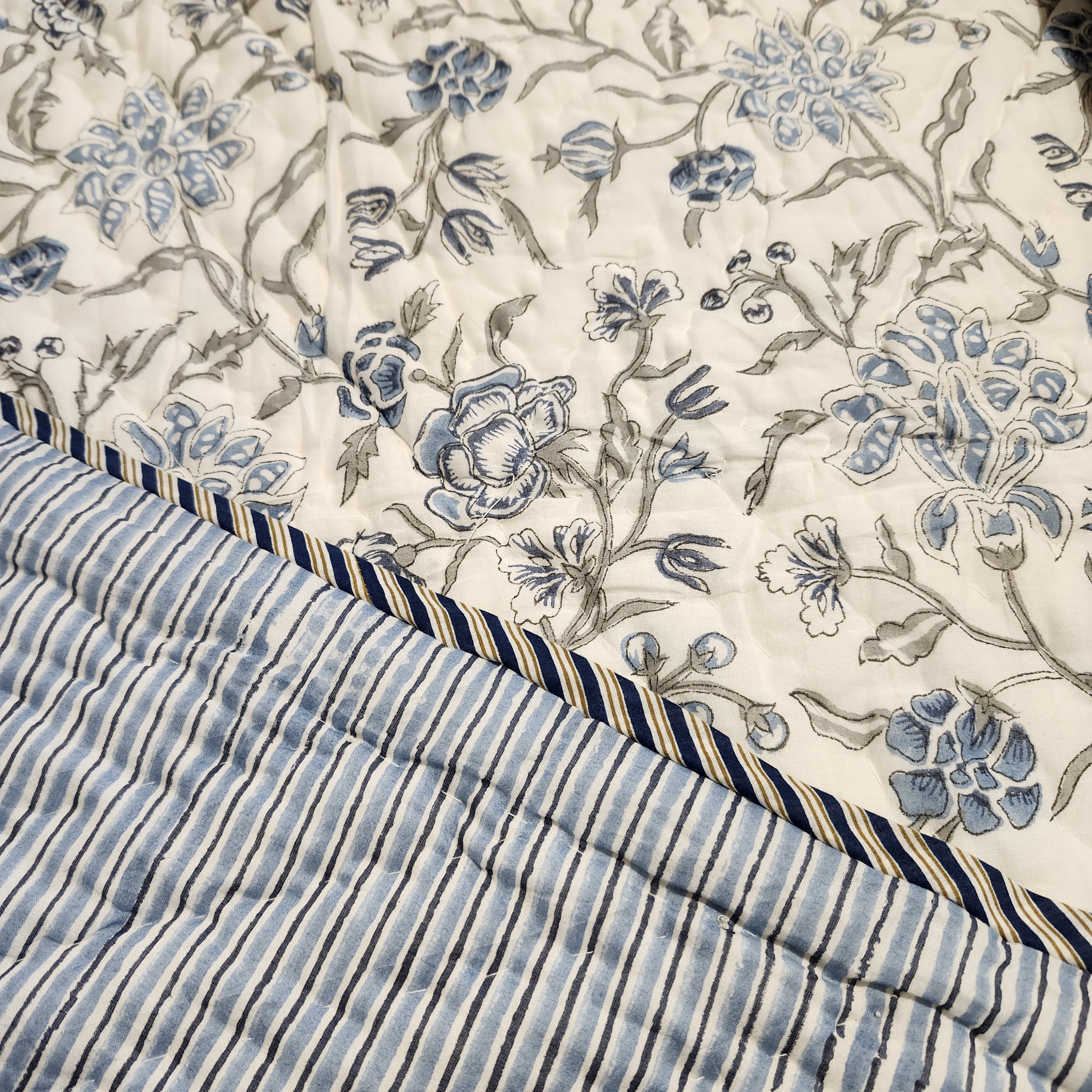 This single bed size block print quilt is in a lovely blue floral pattern with a striped reverse side. Soft, lightweight and reversible, which allows you to change your bedroom look with ease.