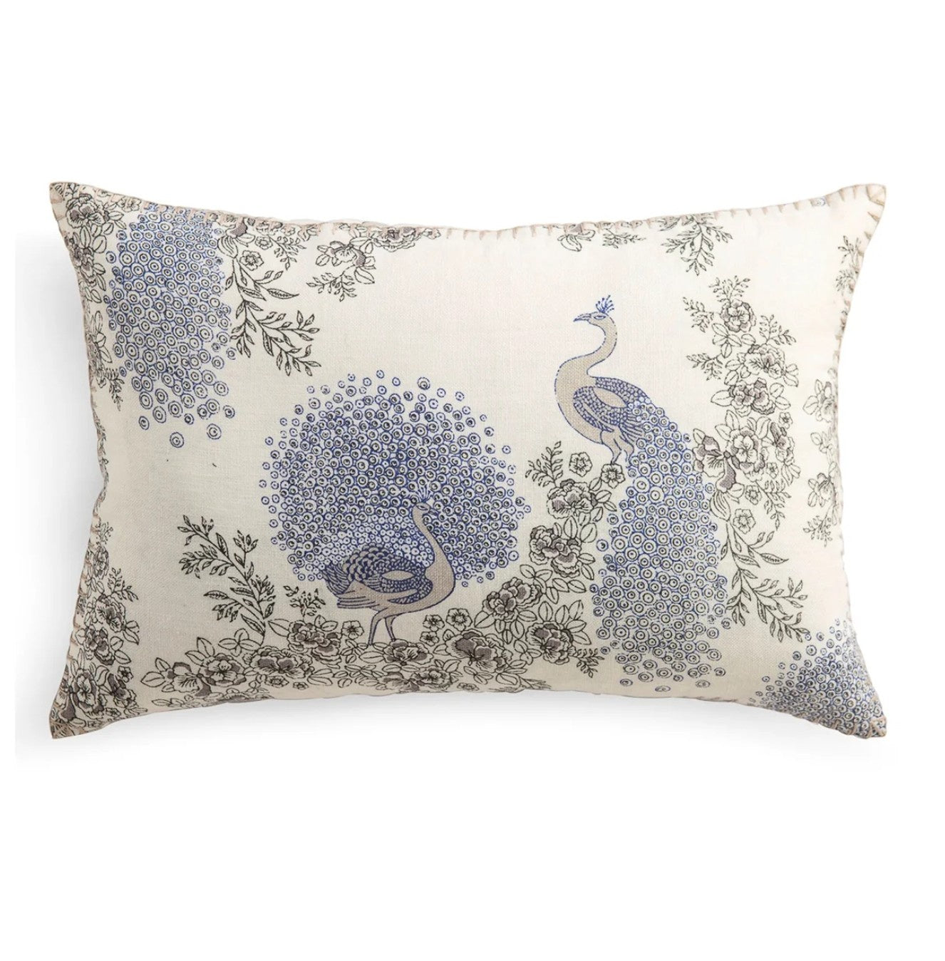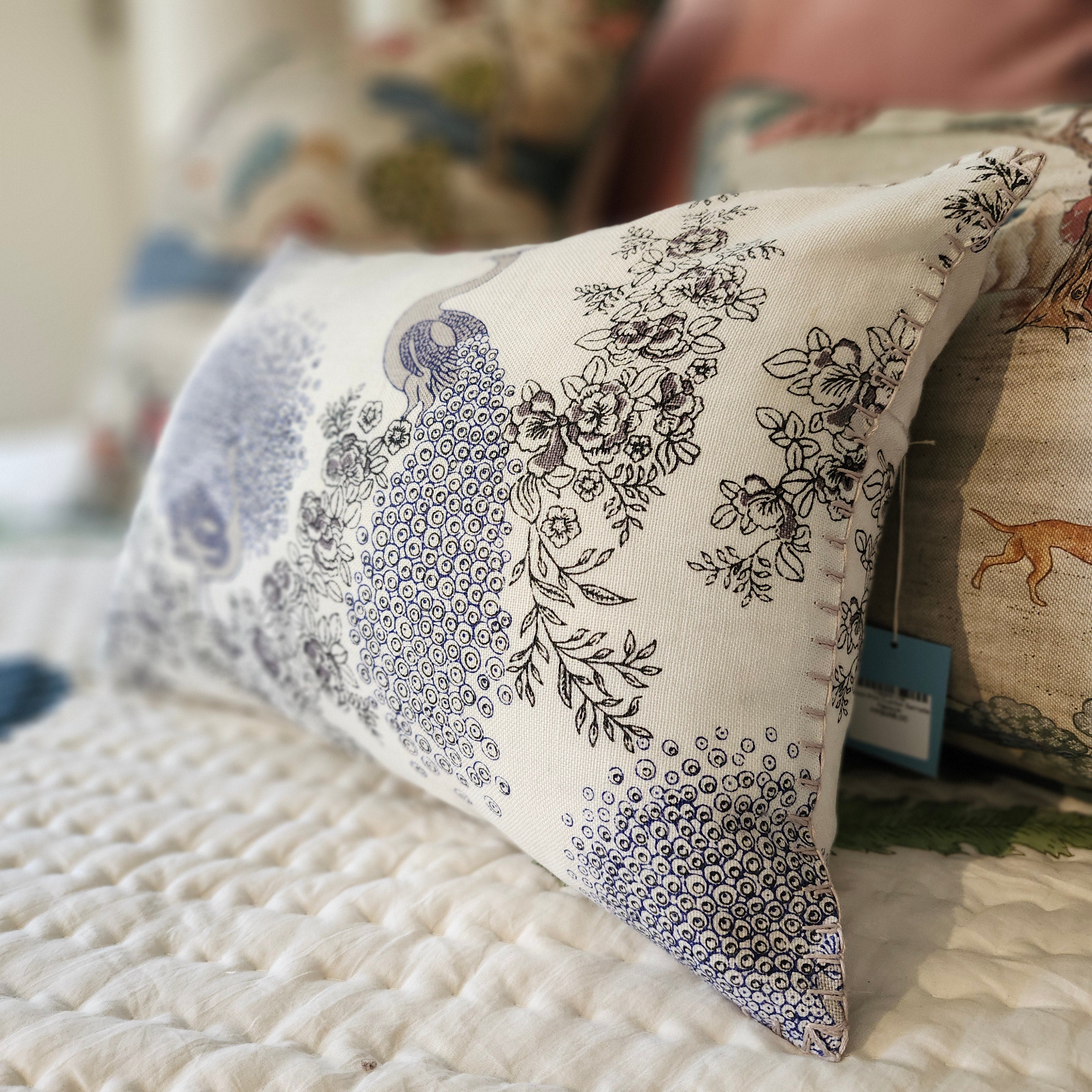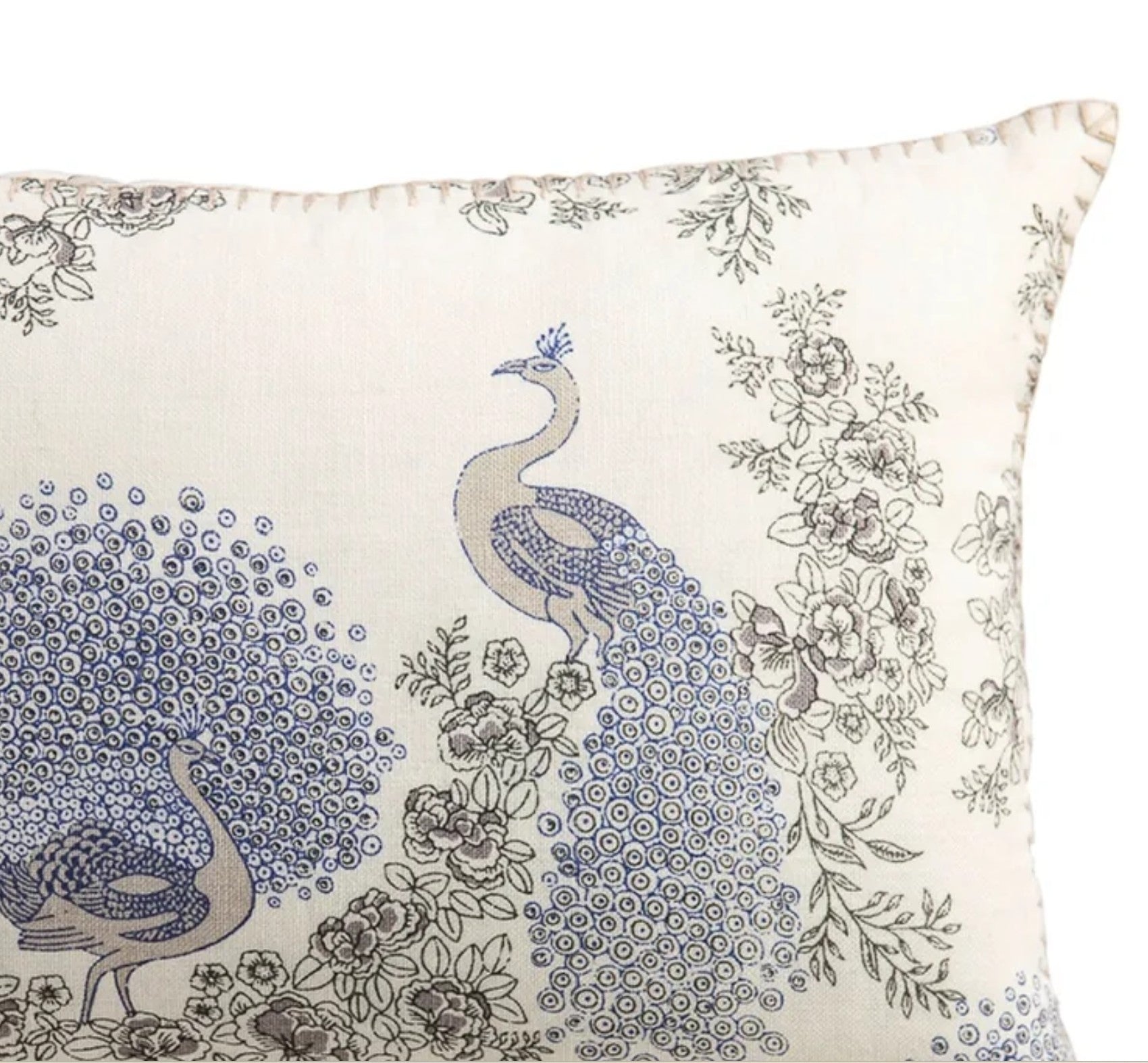 A fine and delicate block print featuring peacocks in blue and white, on a linen background. The cushion has been edged by hand in blanket stitch. A match for the Samode Peacock Quilt or just a lovely addition to white bed linens or on a white sofa.