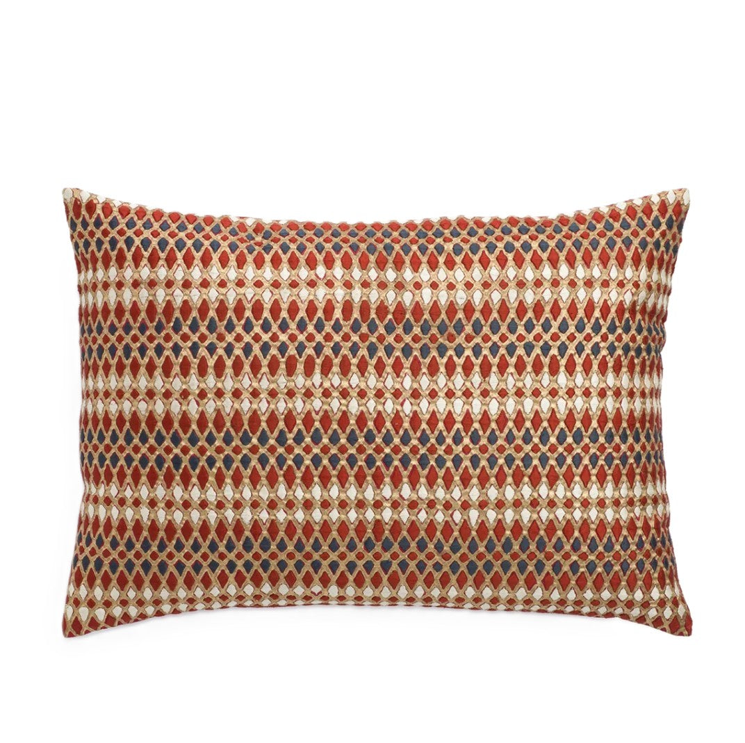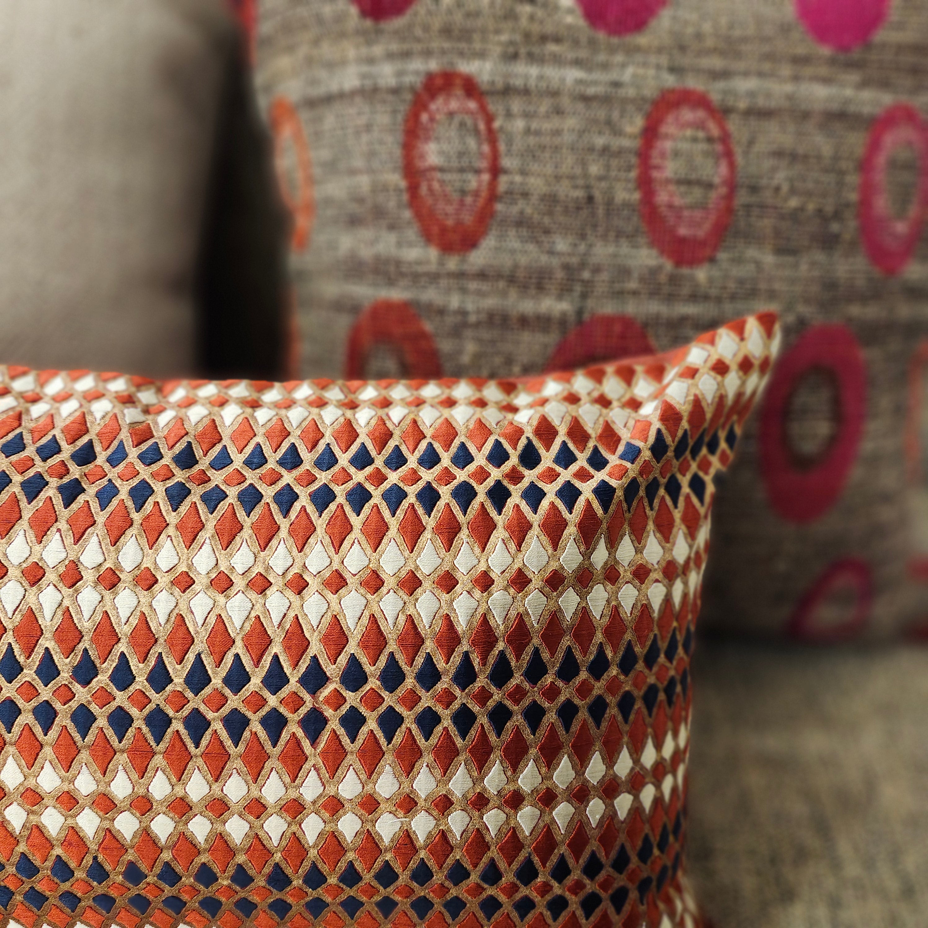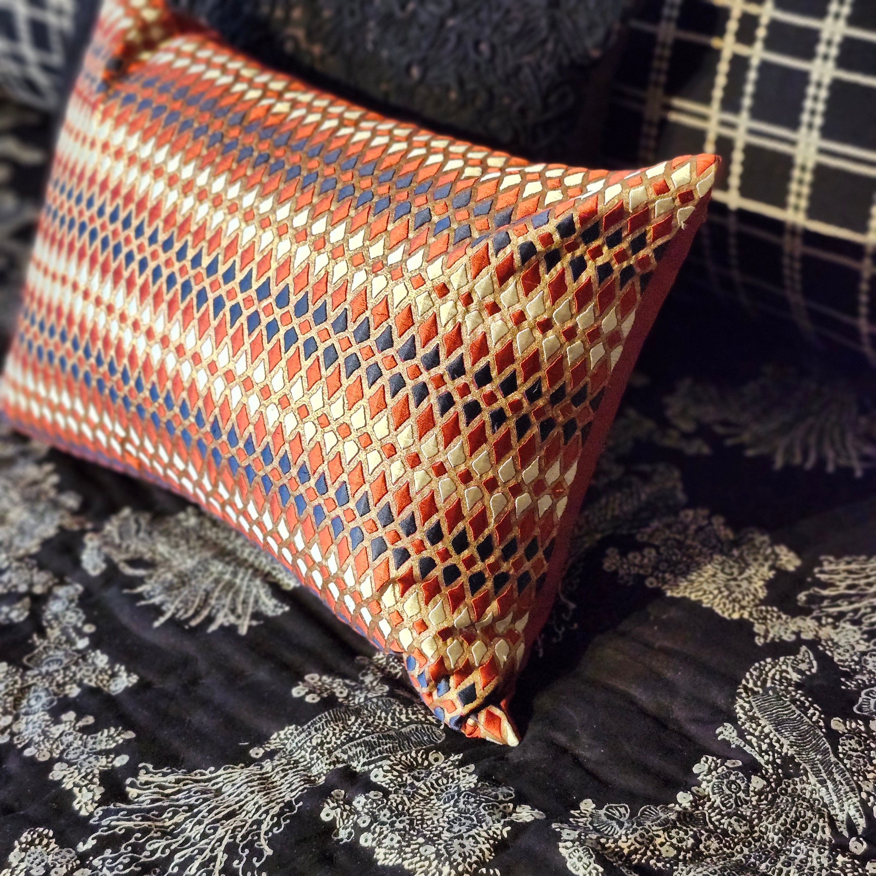 Crafted entirely by hand, this cushion has been individually block printed, but the work is further enhanced by hand embroidery over the block print - the ultimate in understated luxury. This beautiful and timeless diamond design has been created in red and gold, with black accents. Closes with a zipper.