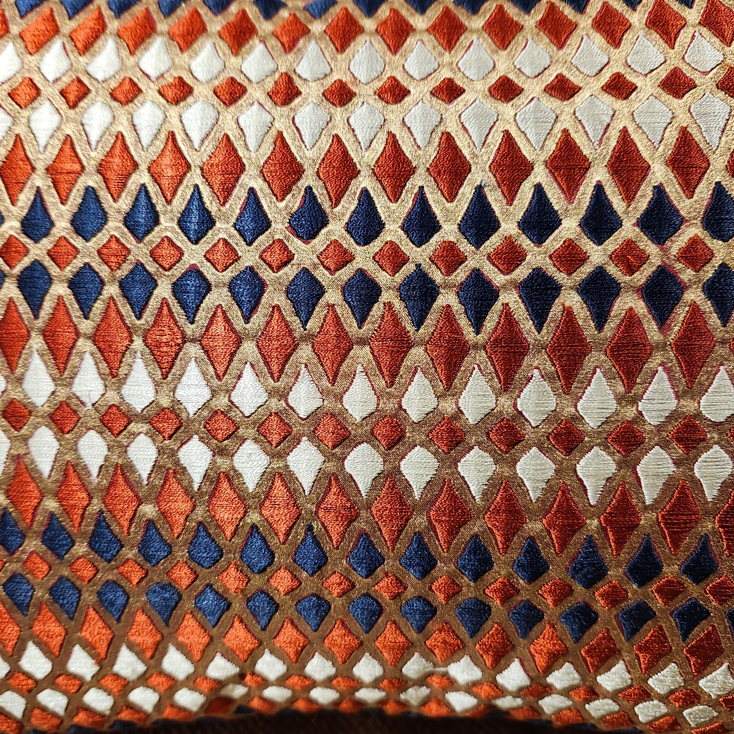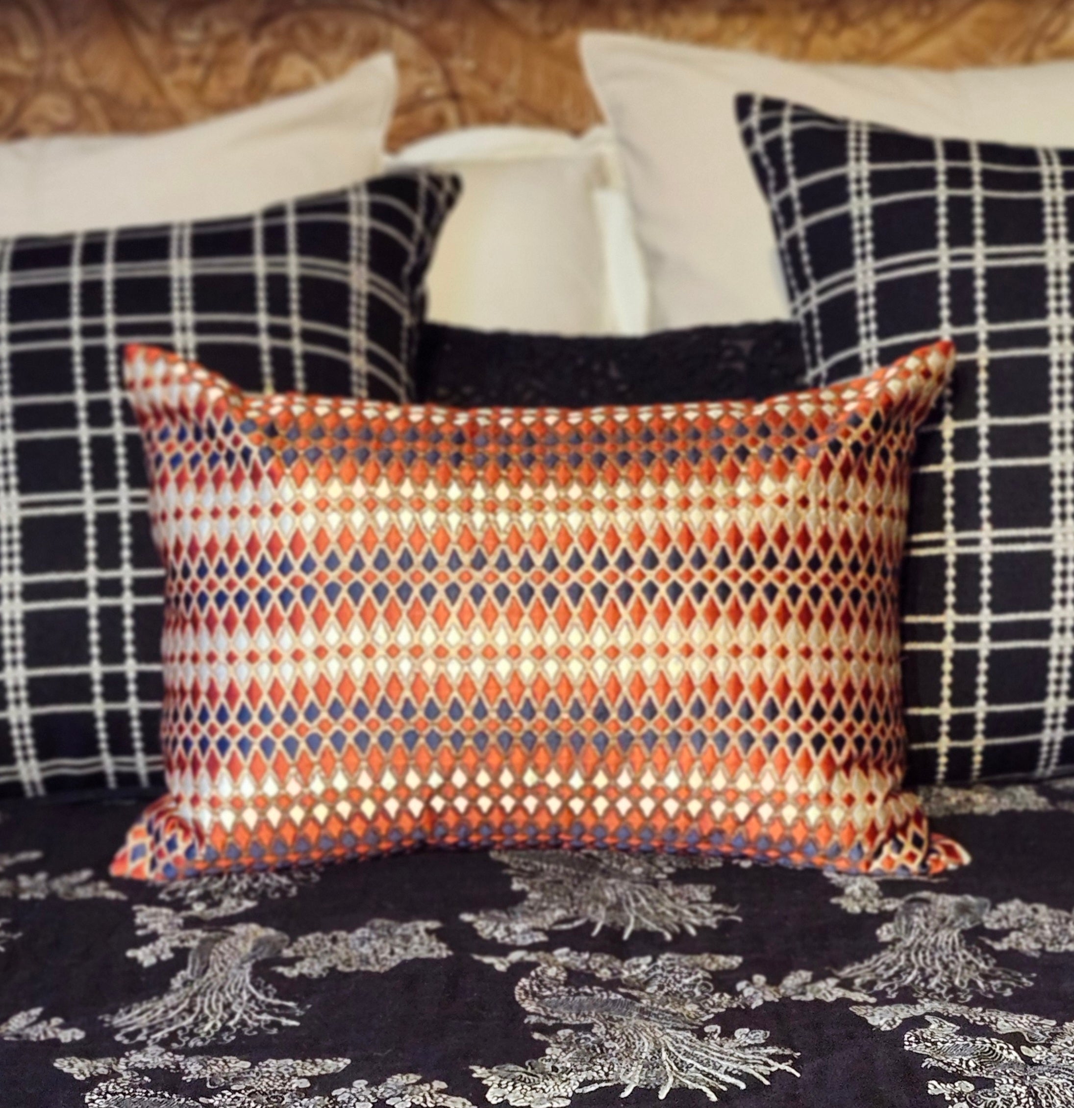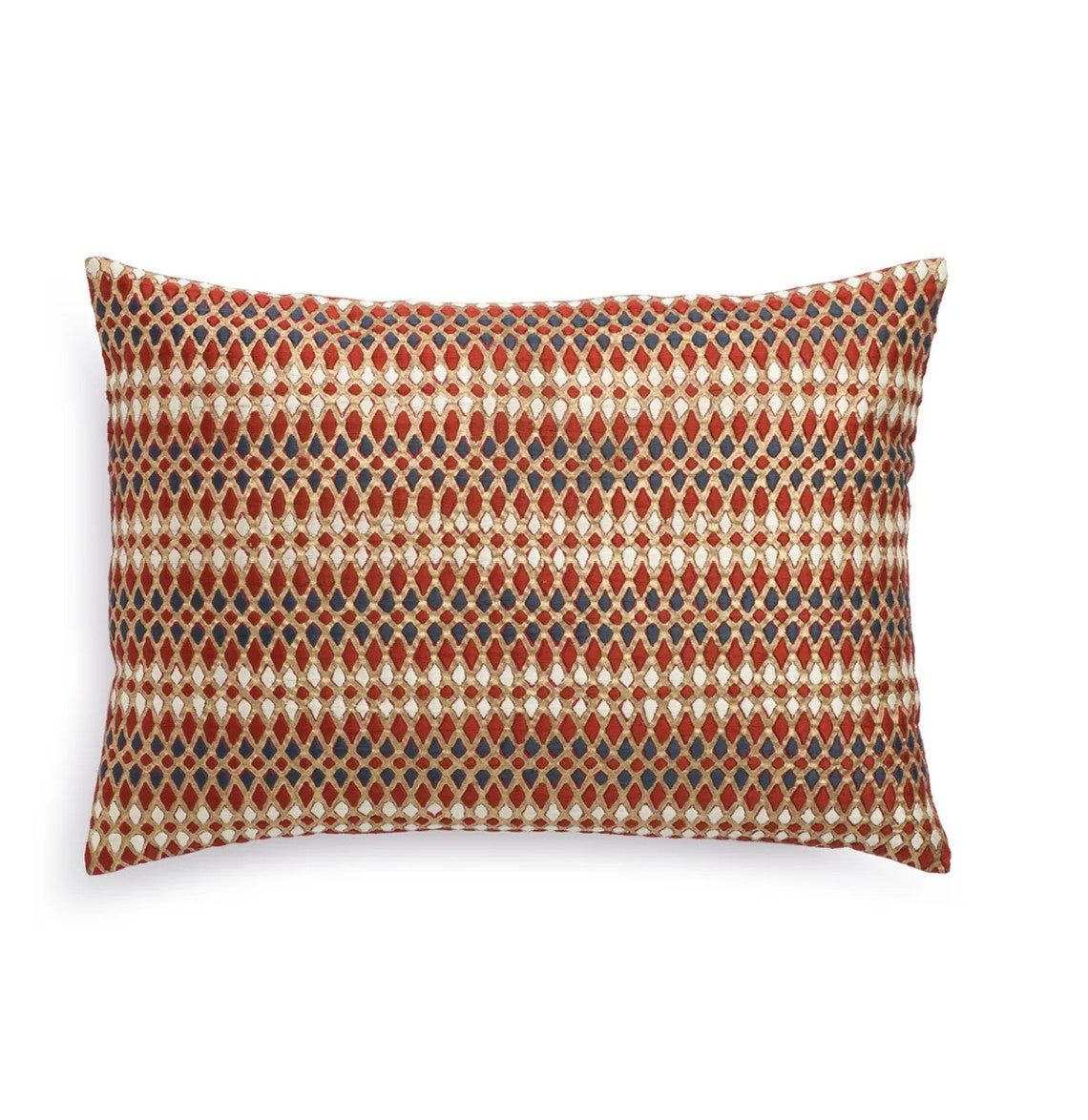 Crafted entirely by hand, this cushion has been individually block printed, but the work is further enhanced by hand embroidery over the block print - the ultimate in understated luxury. This beautiful and timeless diamond design has been created in red and gold, with black accents. Closes with a zipper.