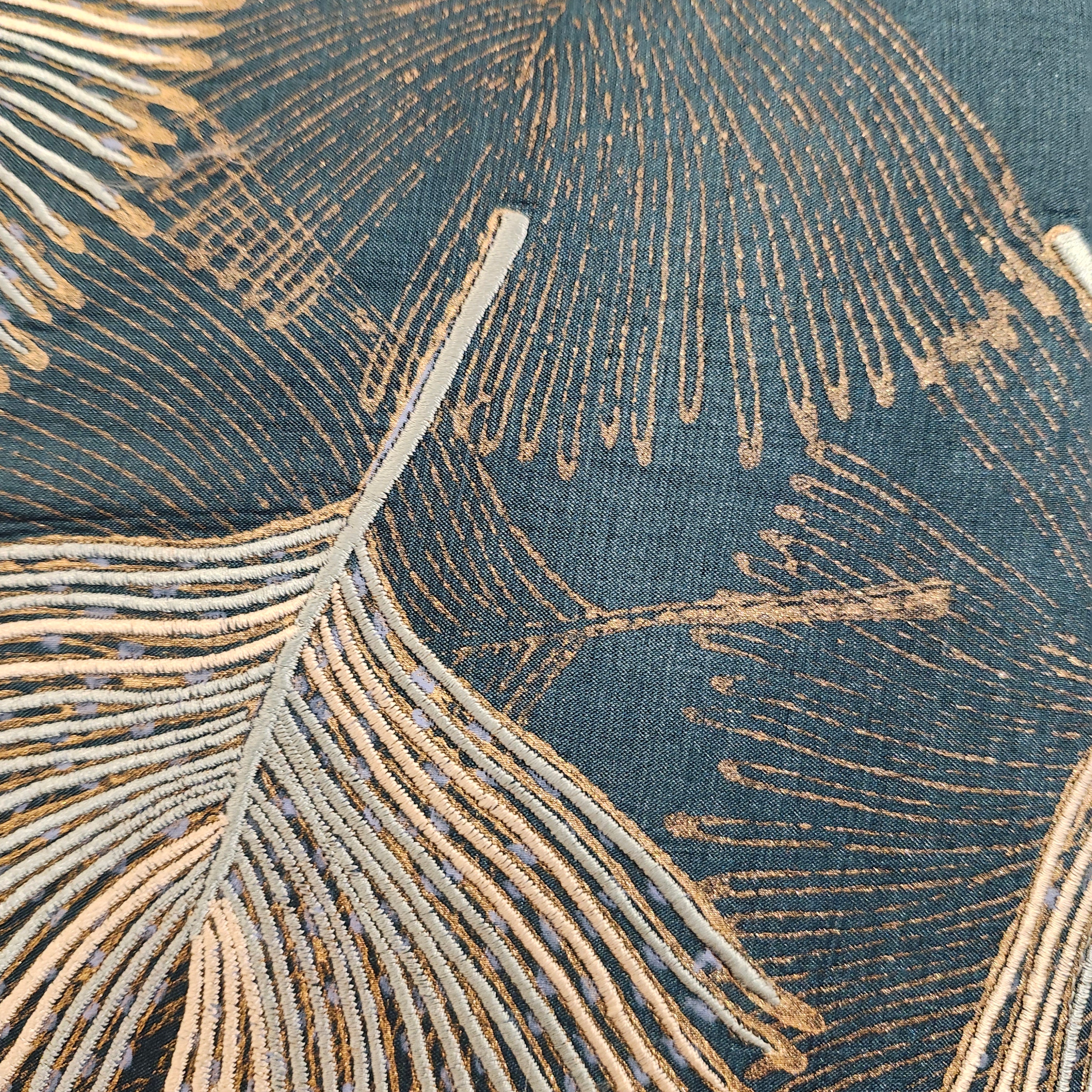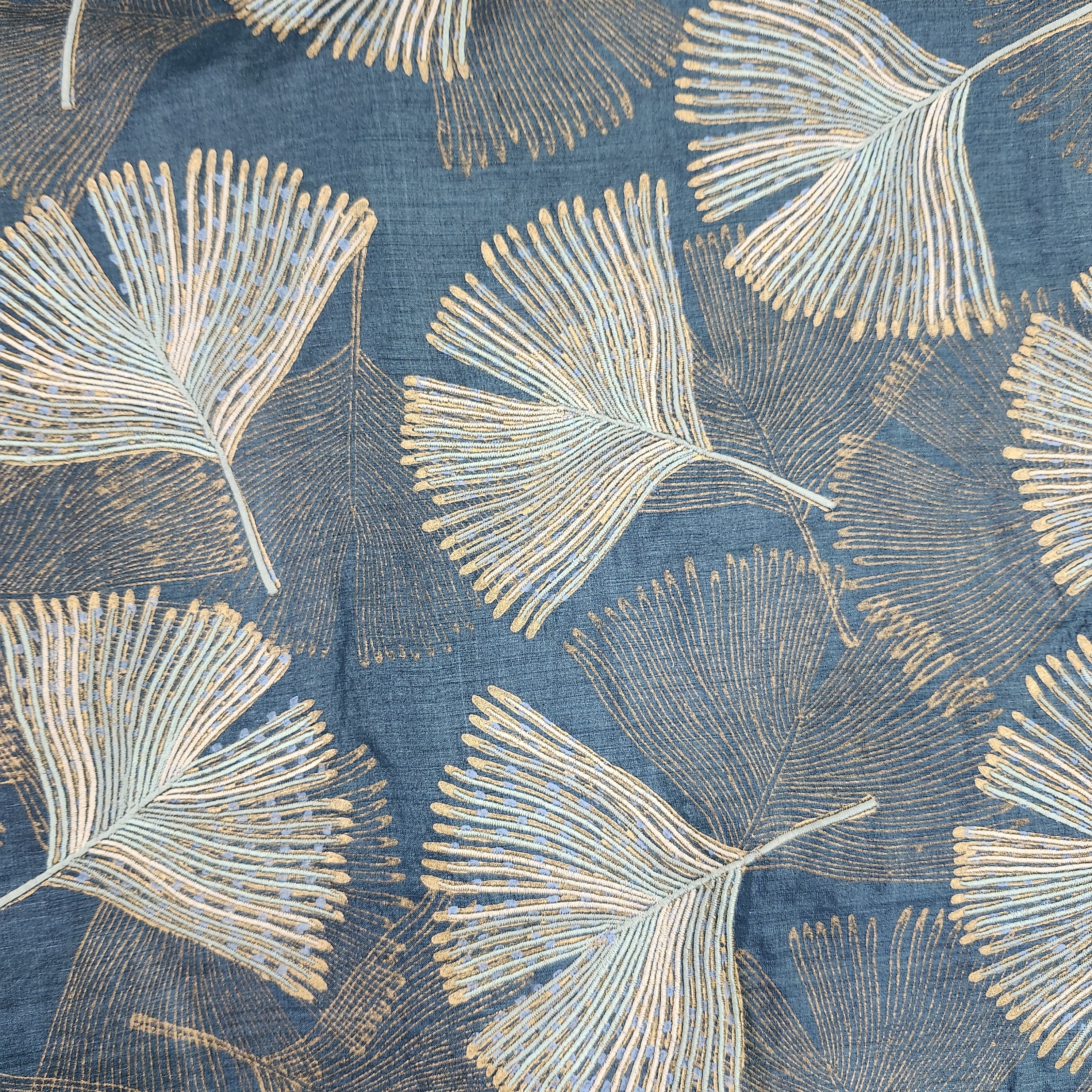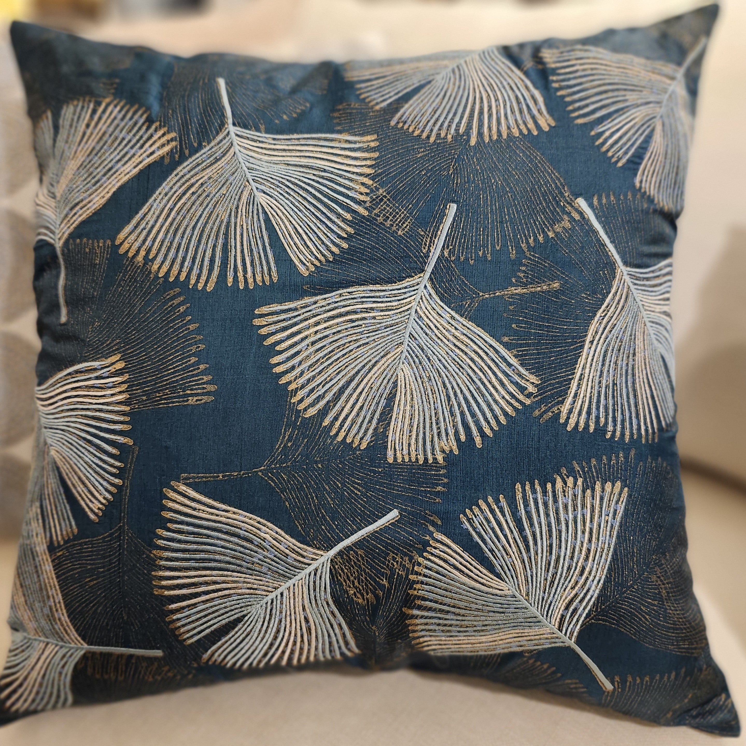 A fabulous blue silk cushion featuring a cluster of large gingko leaves, with their distinctive fan shape, overlaid with intricate embroidery in shades of teal, grey and gold to give texture and life to the design.