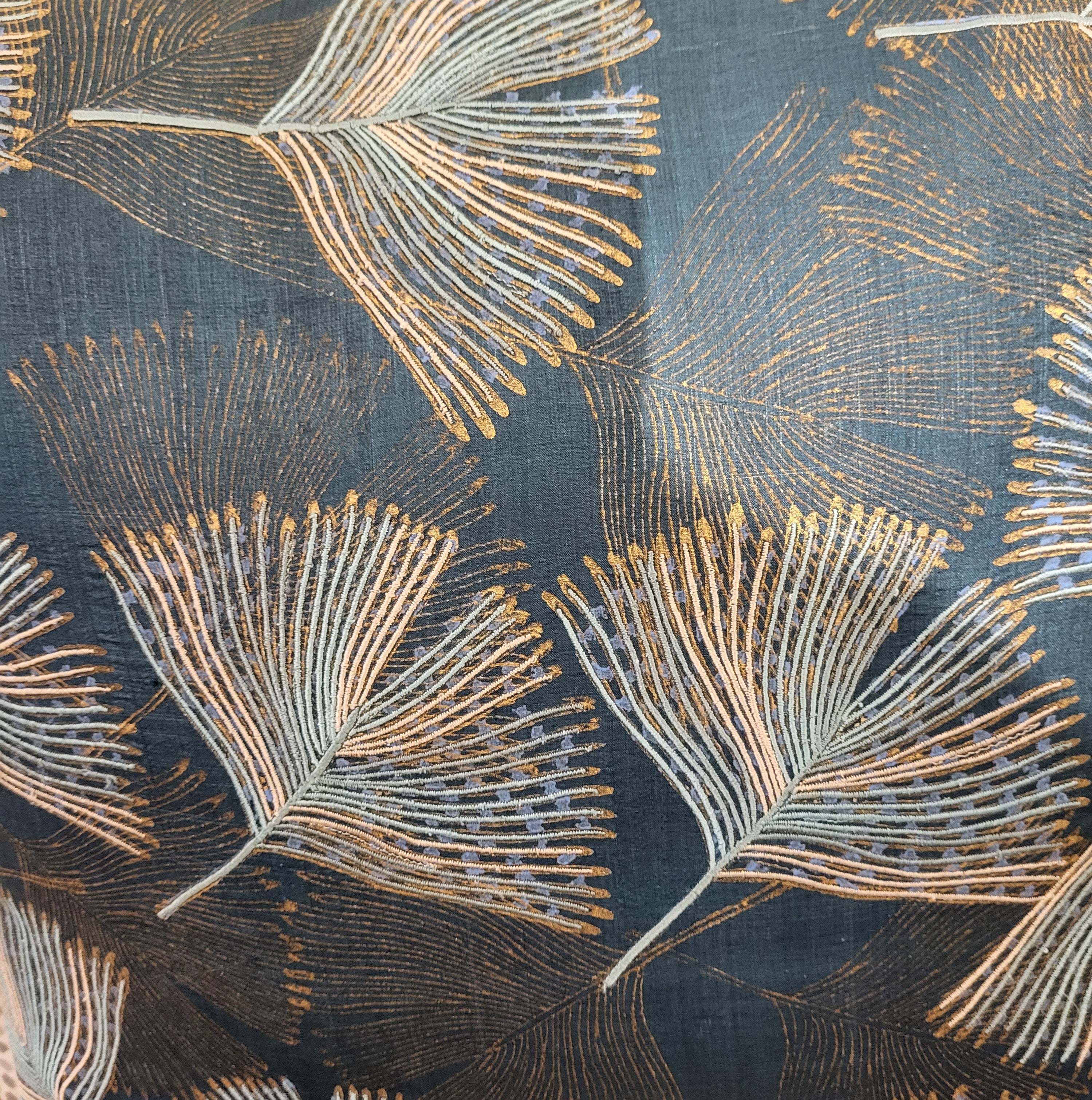 Each cushion is block printed individually, and once off the printing table, it is embroidered by hand.  Elegantly finished with a coordinating linen/cotton back and a zip closure.