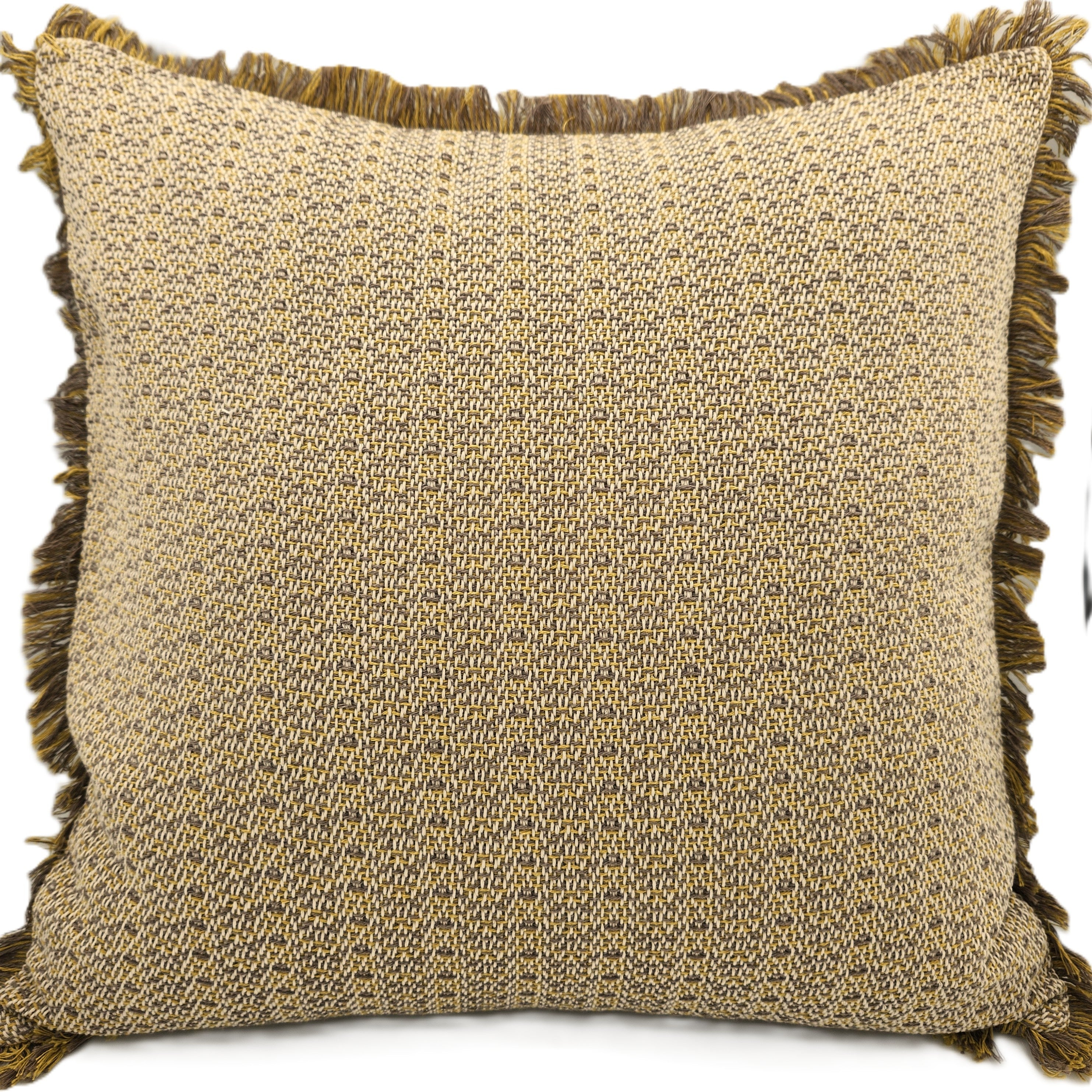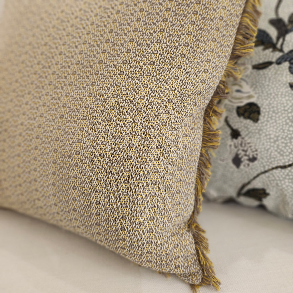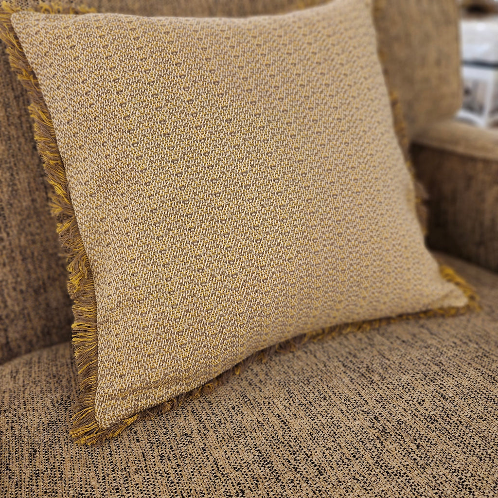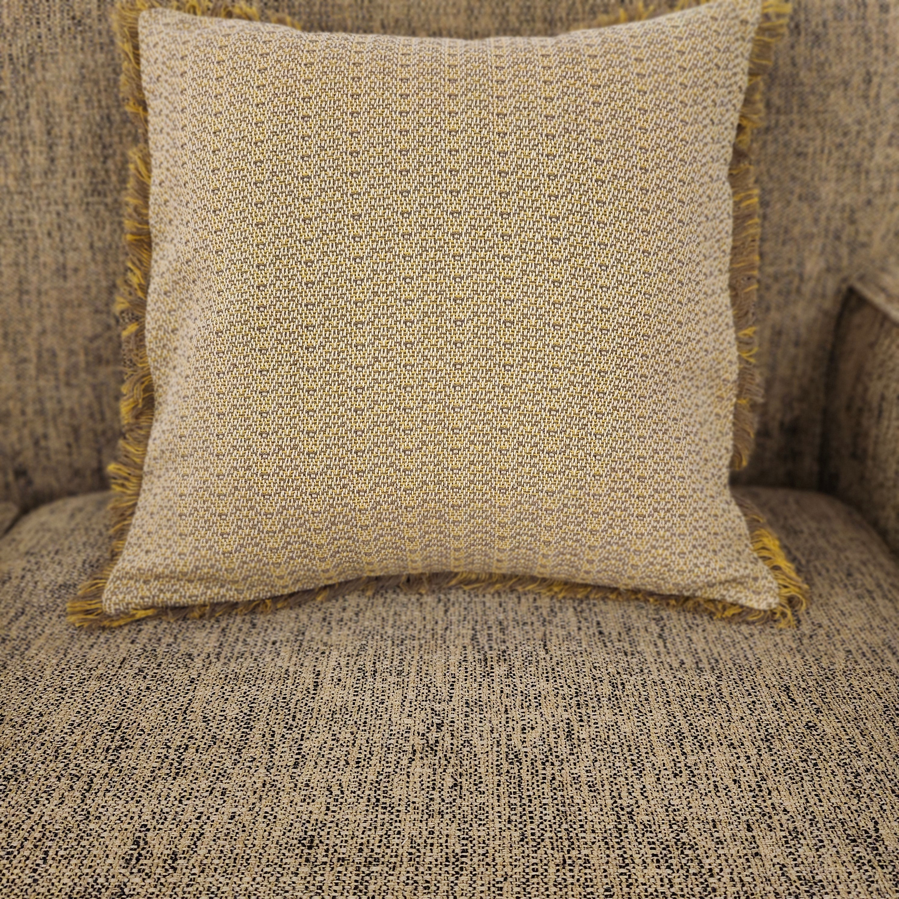 This cushion is made from woven recycled cotton, in shades of grey, yellow and white, with a fringe.