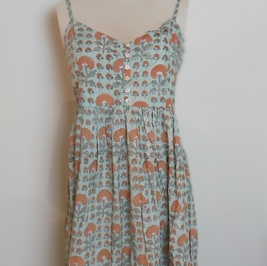 Our block print calf-length sundresses are available in a variety of floral block print patterns.  Easy and comfortable to wear, with adjustable straps and an elasticated back.  The bodice features six mother of pearl buttons.