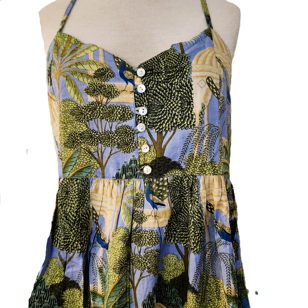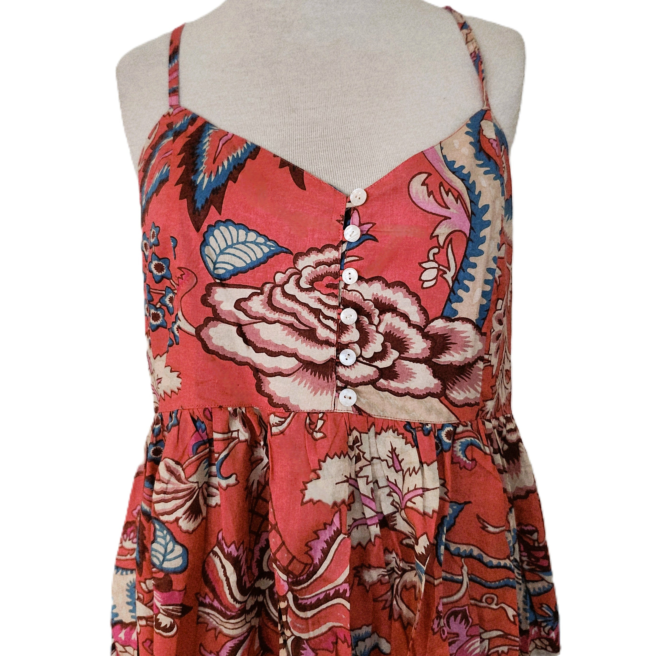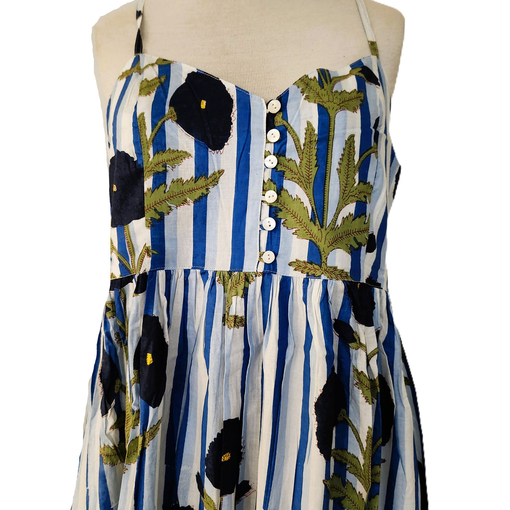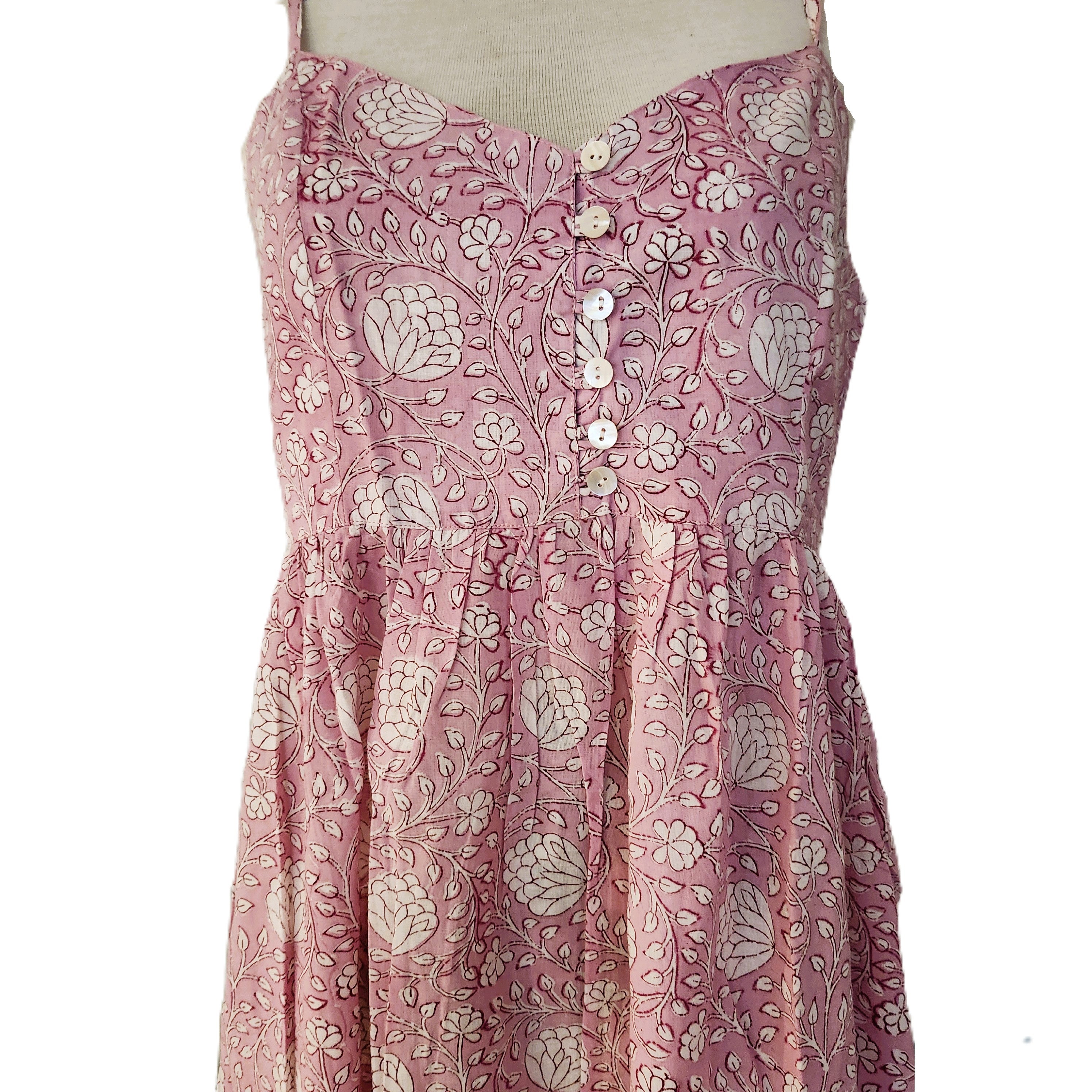 Stay cool and stylish with our block printed sundresses, in assorted patterns. Made from soft cambric cotton, the bodice features six mother of pearl buttons at the front, adjustable straps and an elasticated panel at the back for a snug and comfortable fit, and a loose calf-length skirt.
