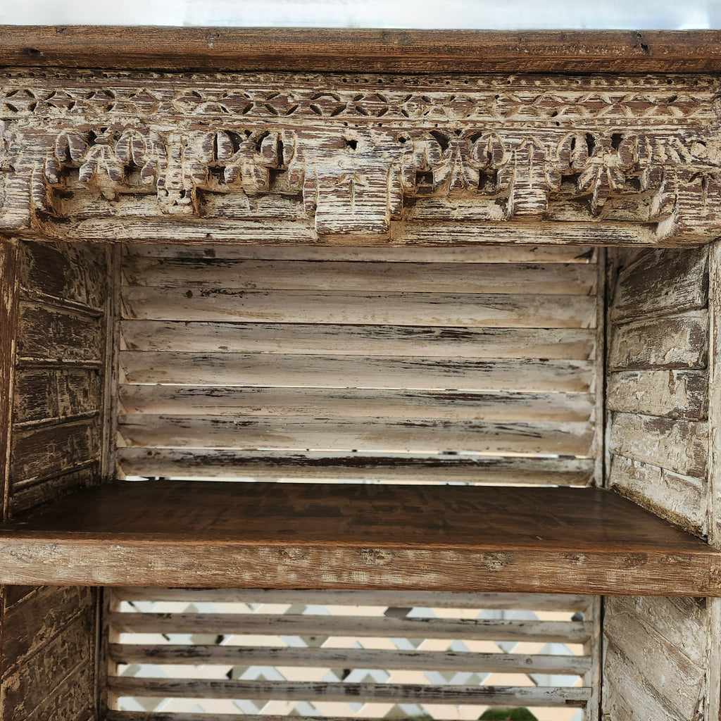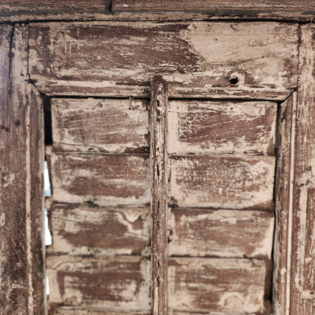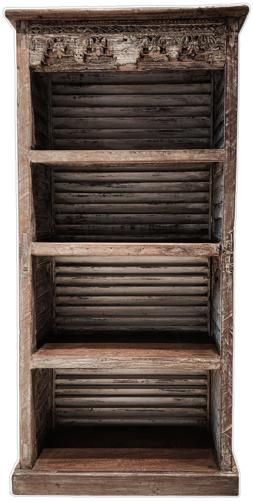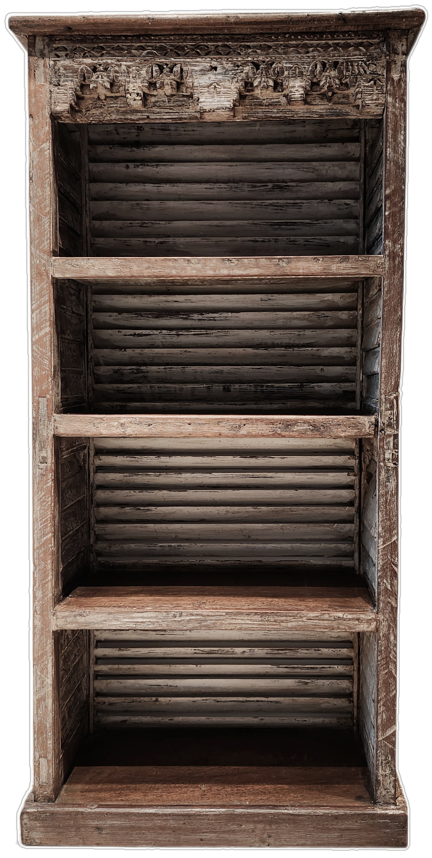 Old louvred shutters have been repurposed to create a book shelf or shelving unit.  The finish is a combination of distressed white paint and natural wax.