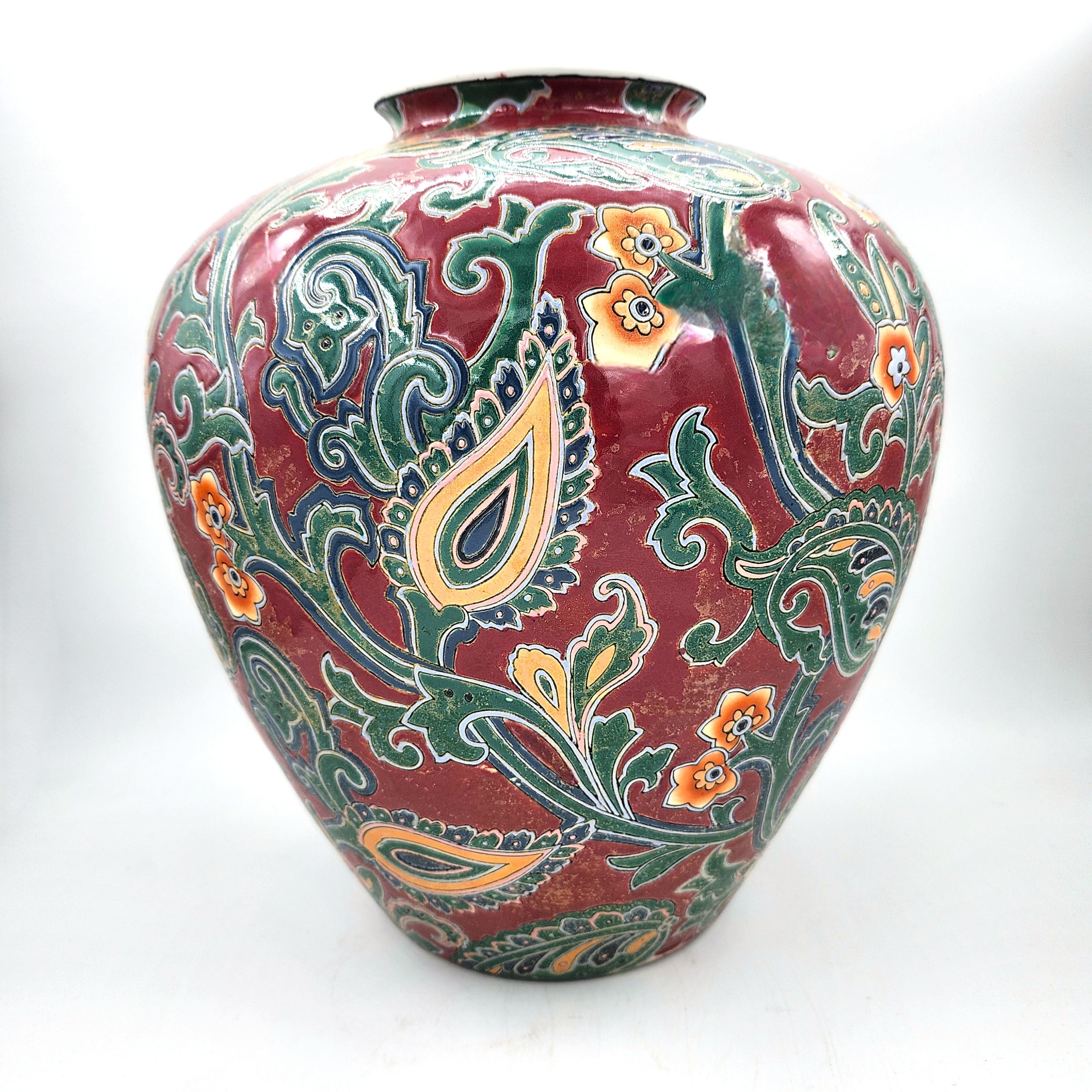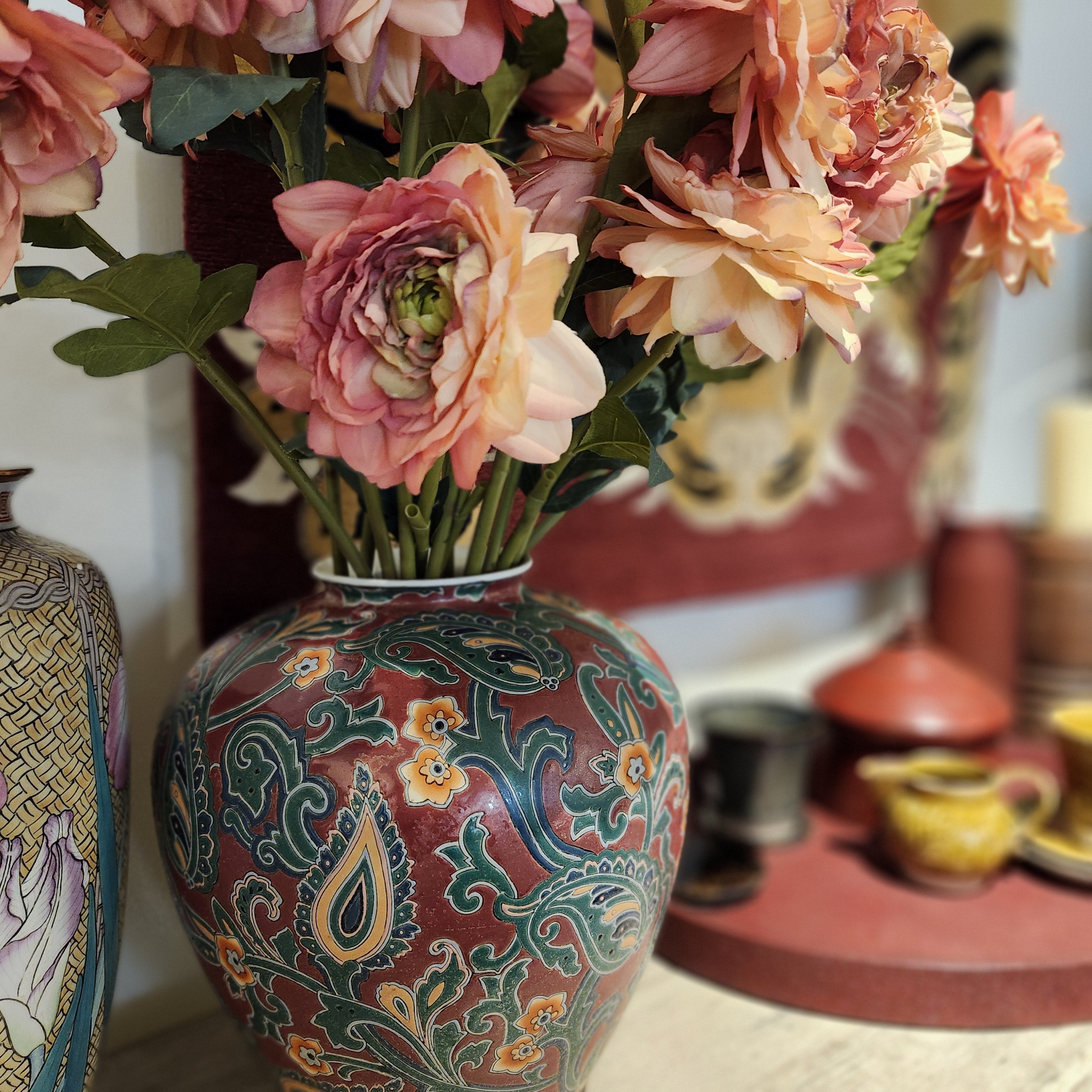 A vintage Famille Rose vase in a design reminiscent of paisley.  The vase has a lovely deep red background, with the design predominantly in blue and orange.