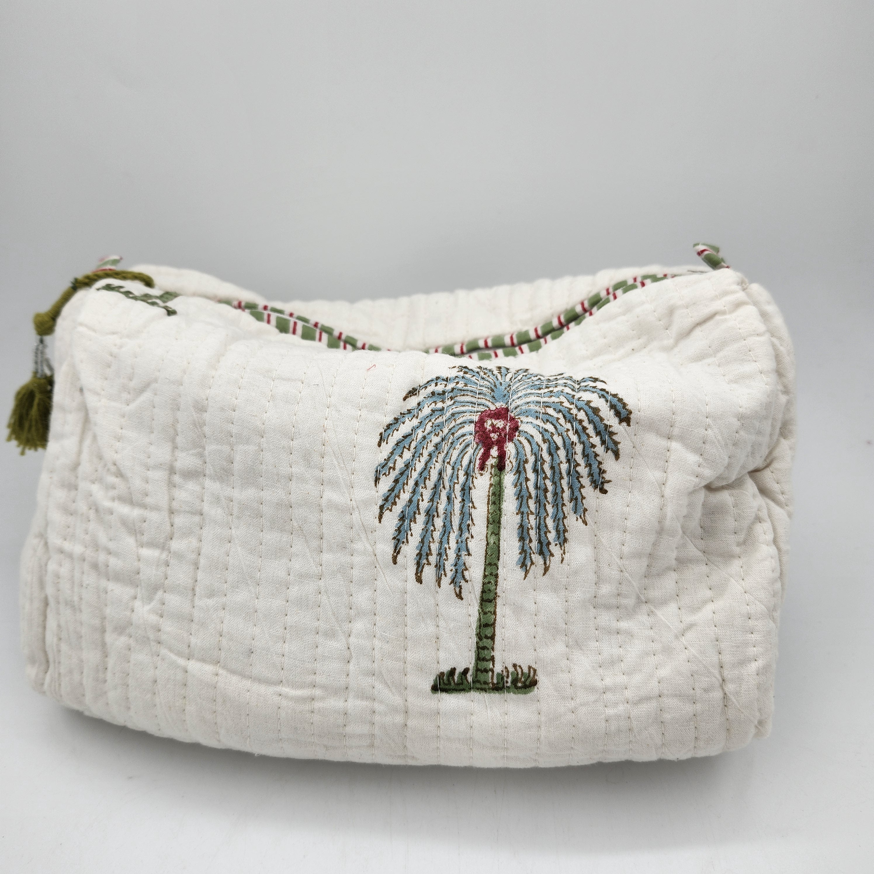 Presenting our block printed wash bags – a fusion of artistry and utility. Handcrafted with care, this wash bag features blue palm trees on a cream background, that adds a tasteful touch to your travel and daily routines. With a spacious lined interior with four internal pockets, and a sturdy zipper closure, it effortlessly holds your toiletries, cosmetics, and essentials in style