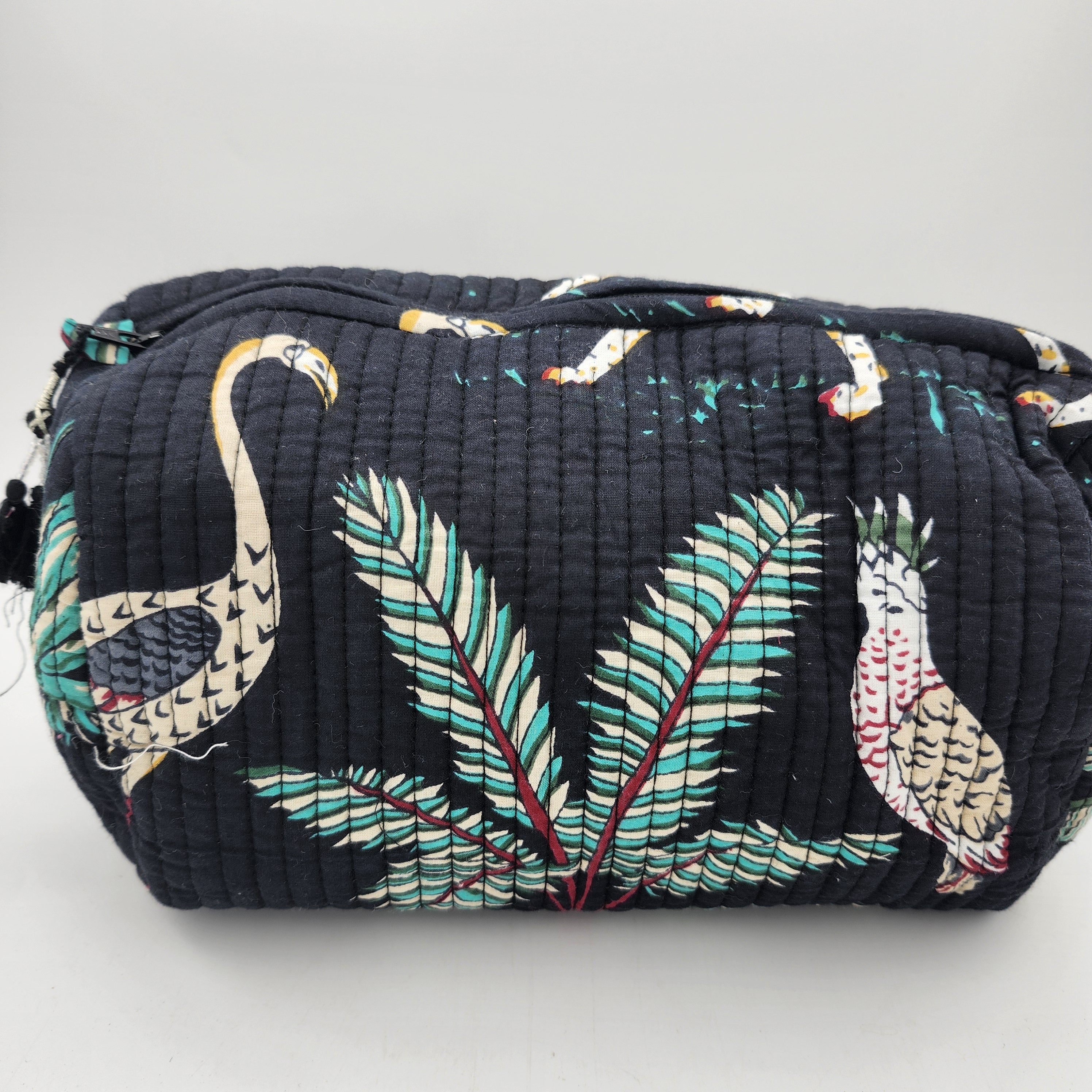 Introducing our block printed wash bags – a fusion of artistry and utility. Handcrafted with care, the safari pattern features zebras, birds, cheetahs, monkeys and palms, adding a touch of fun to your travel and daily routines. With a spacious interior and sturdy zipper closure, including a gorgeous tassel, it effortlessly holds your toiletries, cosmetics, and essentials in style.