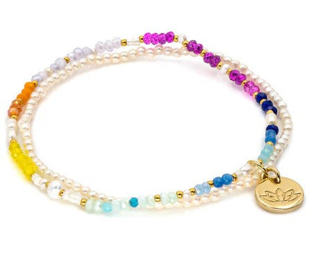 Double-strand, multi-coloured beaded stretch bracelet with small pearls. Measures 17cm.