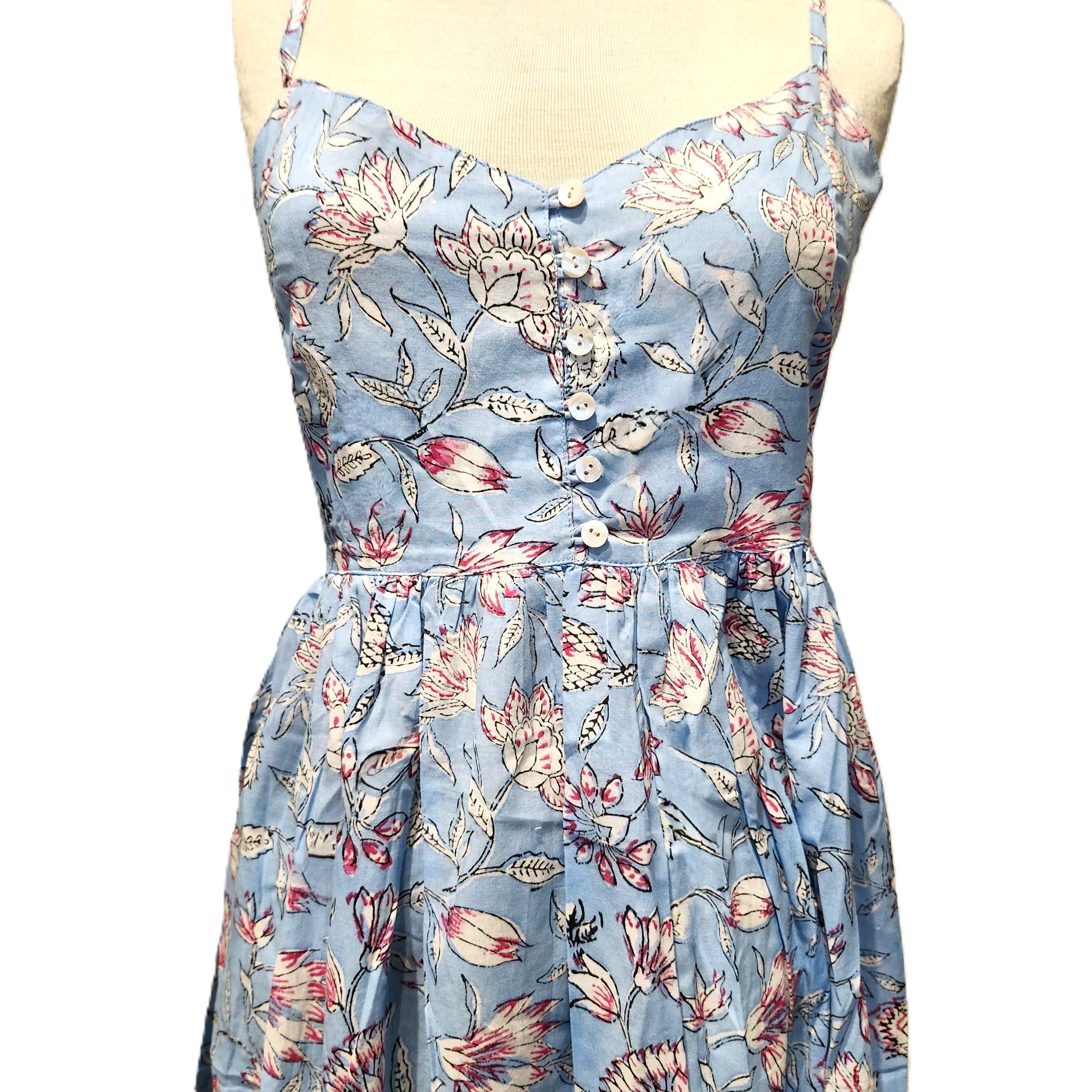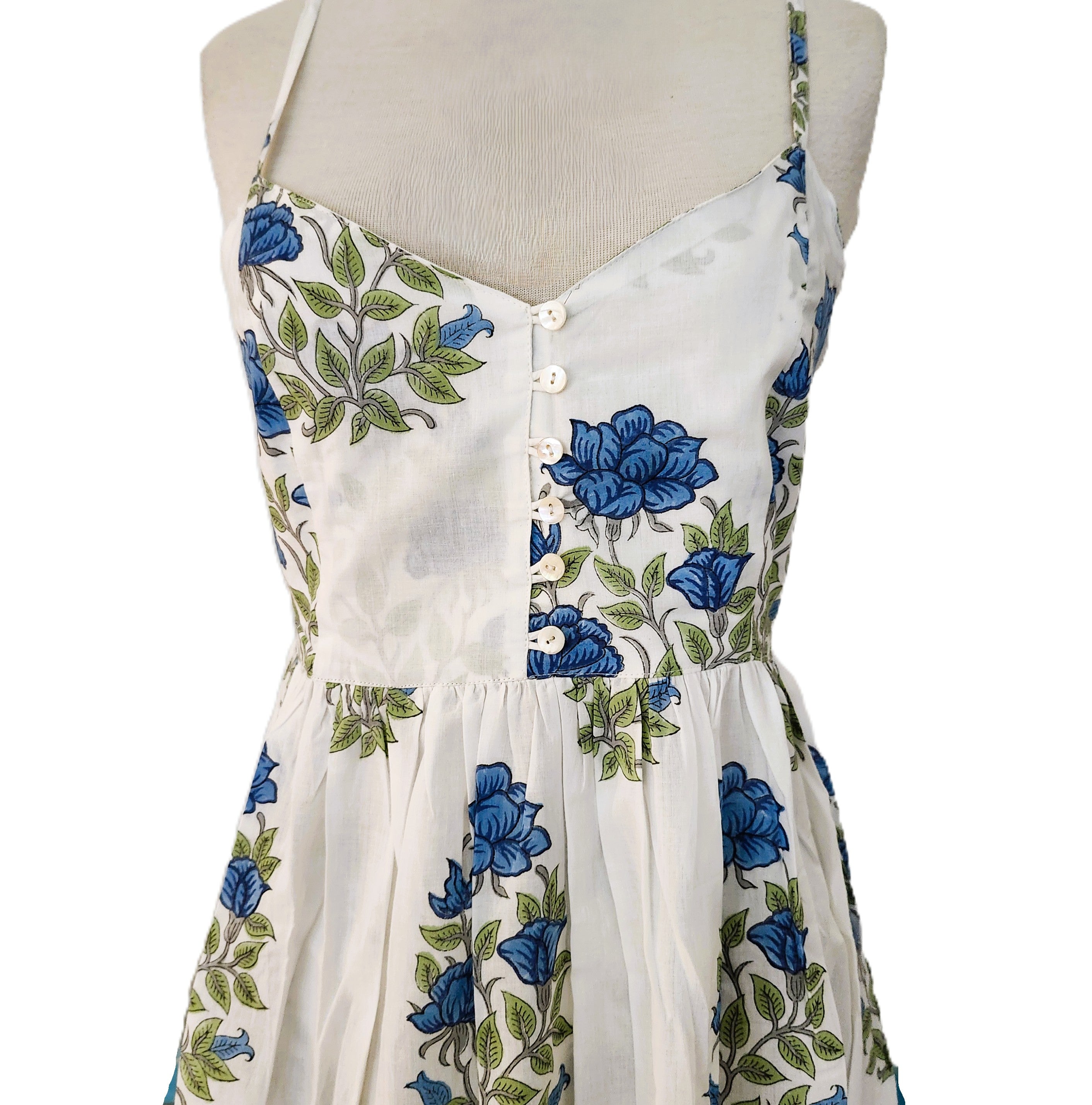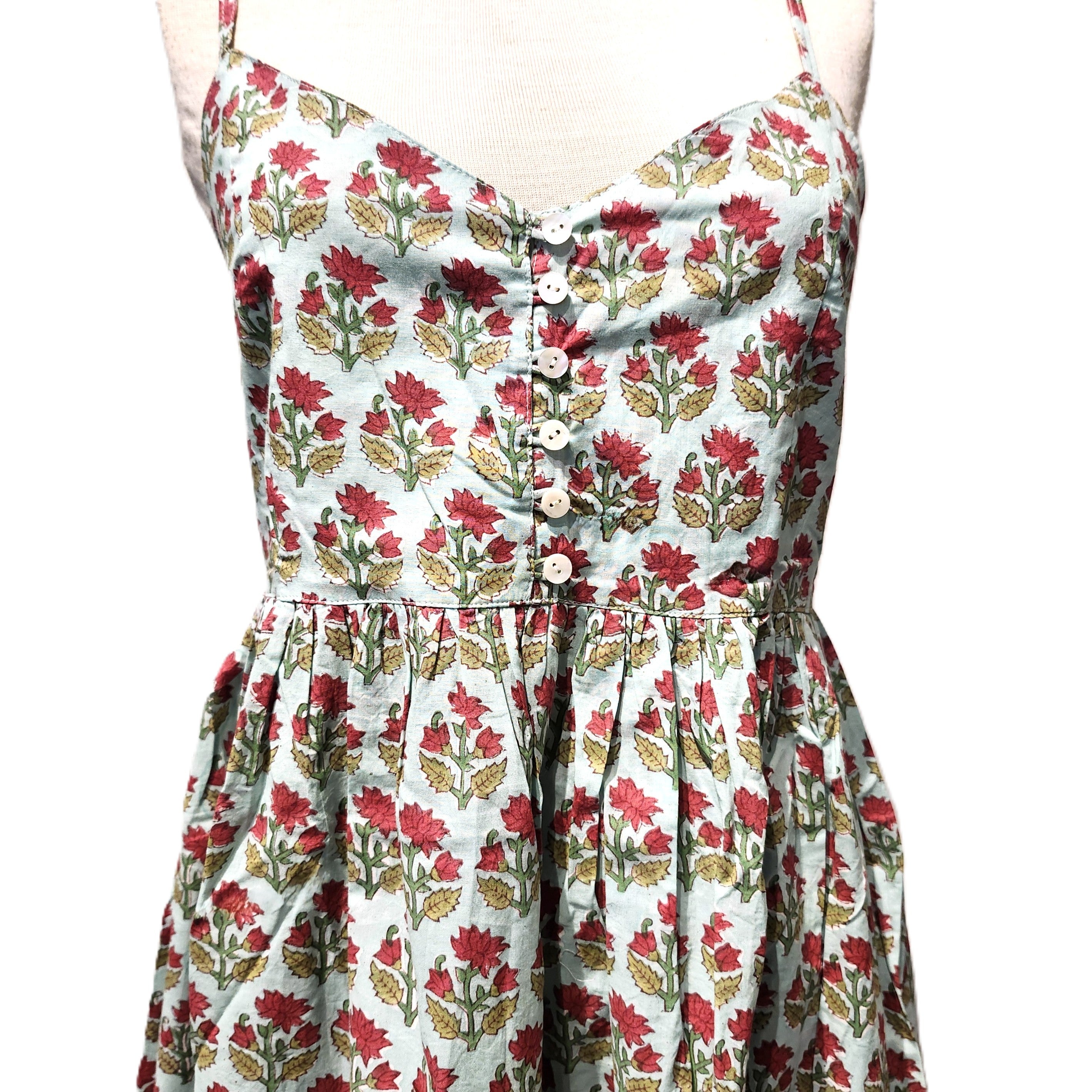 Stay cool and stylish with our block printed sundresses, in assorted patterns. Made from soft cambric cotton, the bodice features six mother of pearl buttons at the front, adjustable straps and an elasticated panel at the back for a snug and comfortable fit, and a loose calf-length skirt.