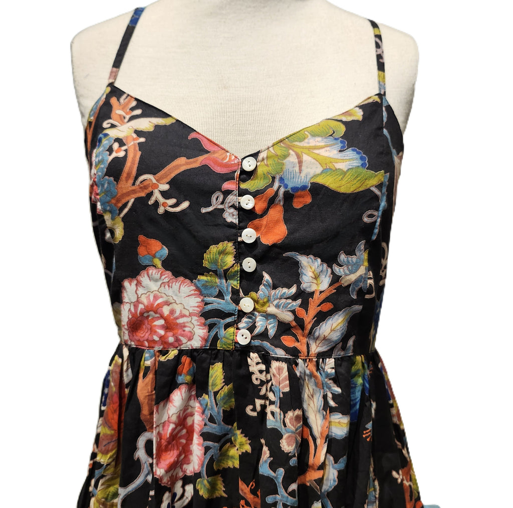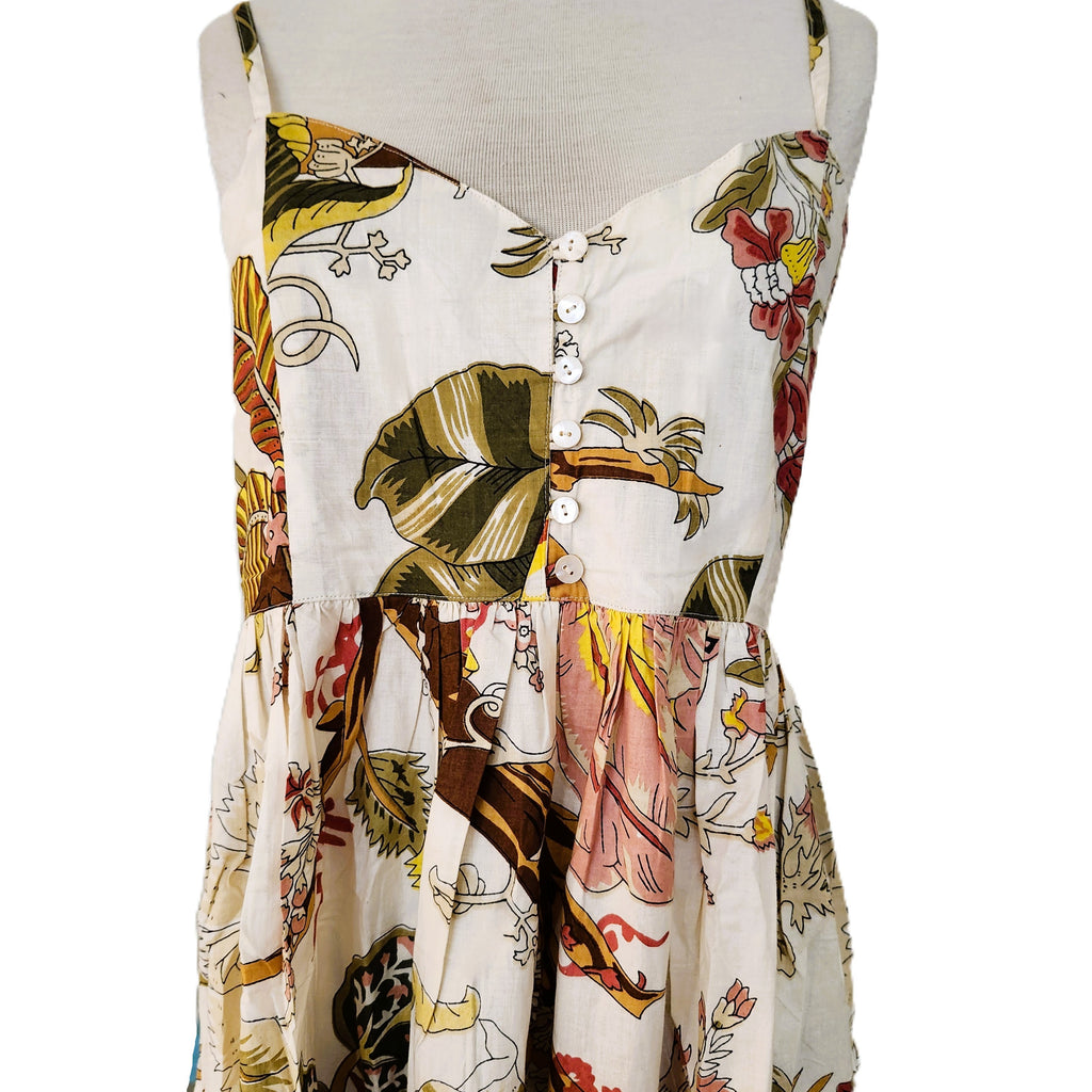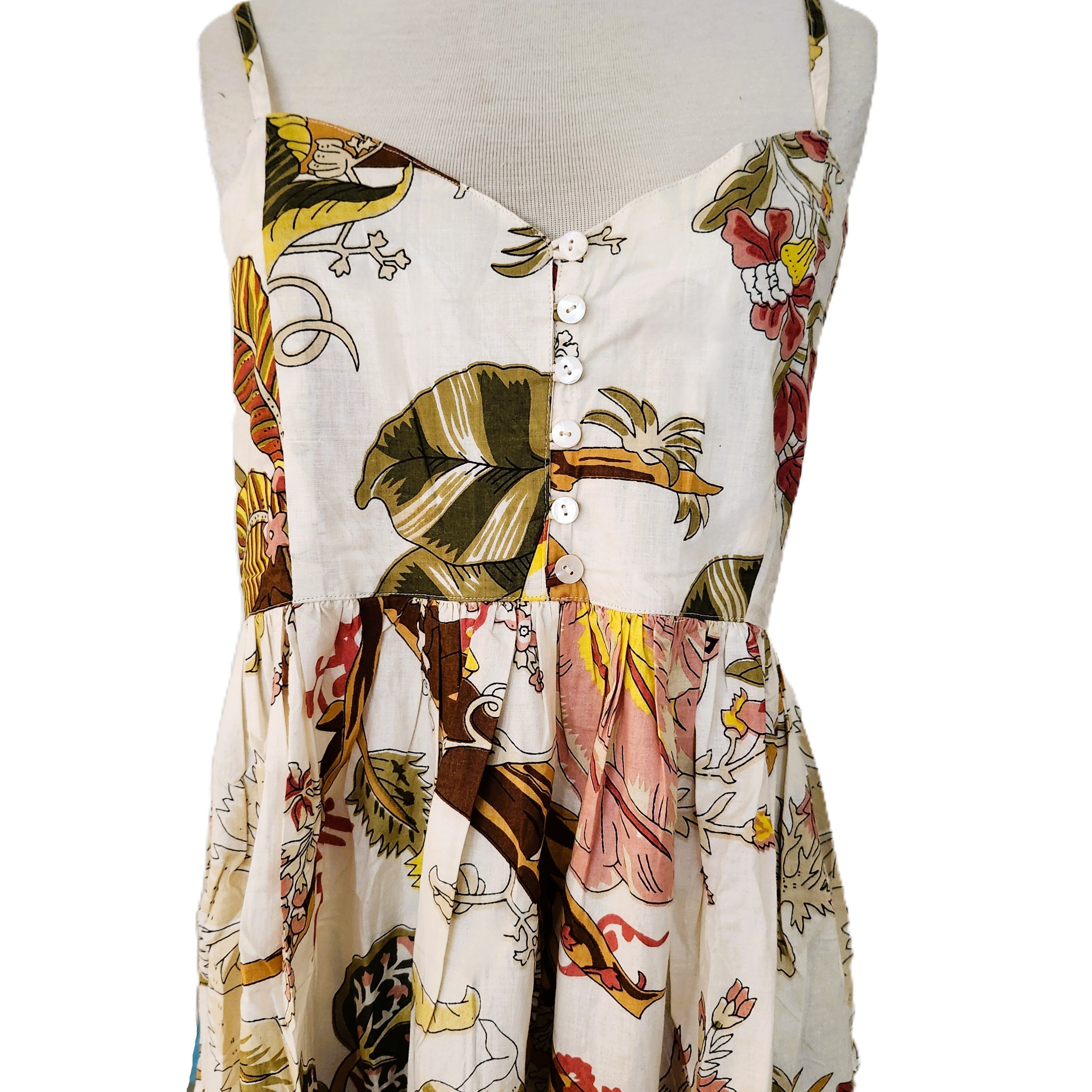 Stay cool and stylish with our block printed sundresses, in assorted patterns. Made from soft cambric cotton, the bodice features six mother of pearl buttons at the front, adjustable straps and an elasticated panel at the back for a snug and comfortable fit, and a loose calf-length skirt.