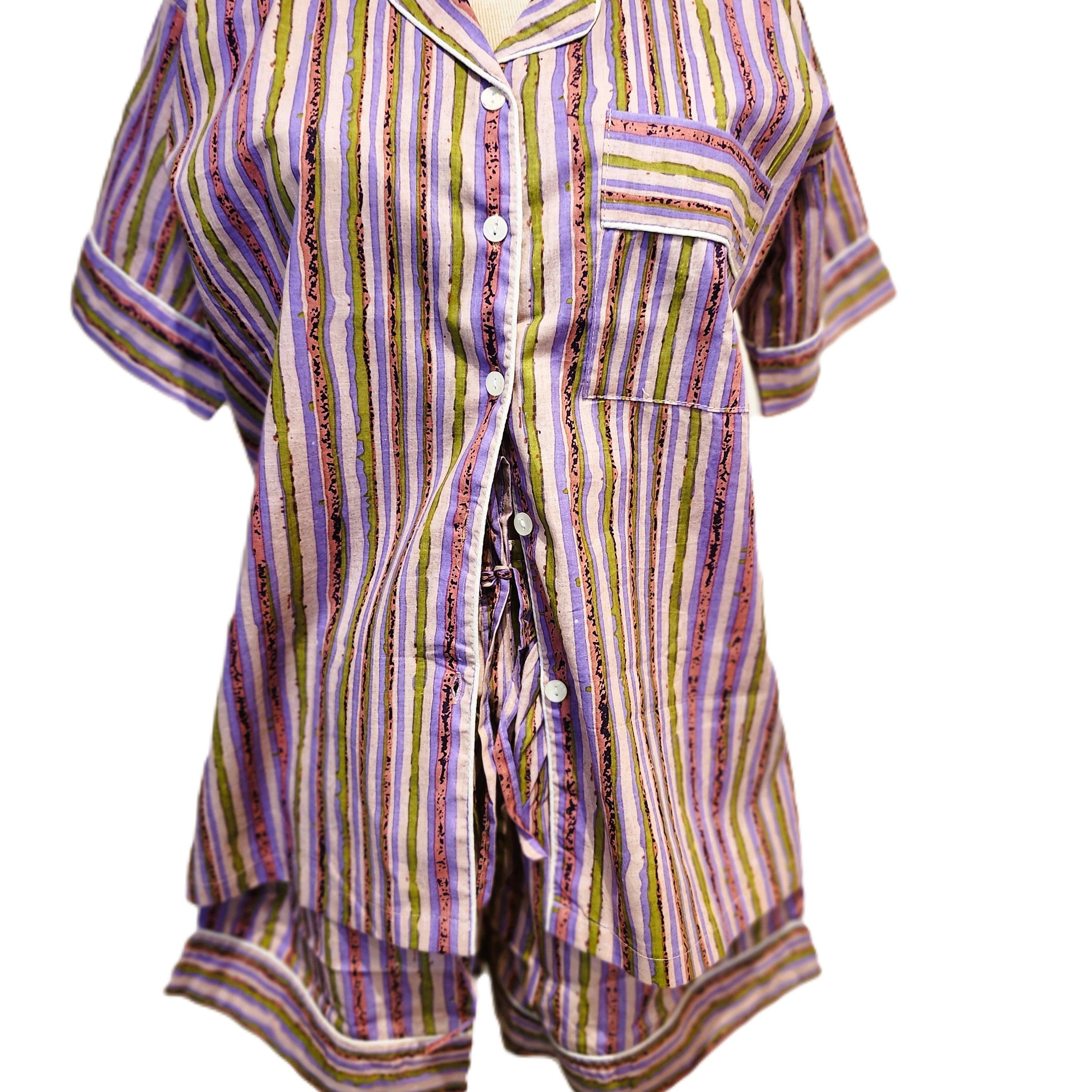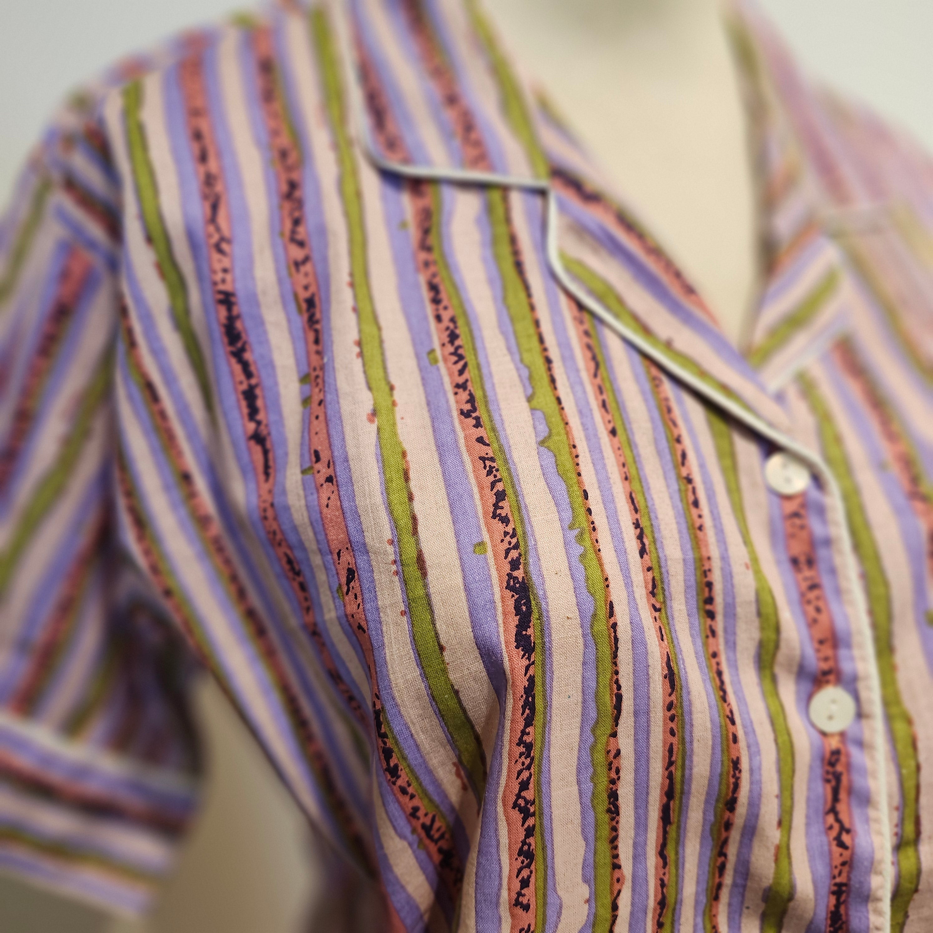 Our ‘shorty’ pyjamas are made from soft and lightweight block printed cotton cambric. A short-sleeved top with buttons and a pocket combines with loose-fitting short bottoms, with a drawstring waist, both with a neat contrast trim. The pair comes in a matching envelope bag, tied with a ribbon: this is a gift too pretty to wrap. Treat yourself or your loved ones to a cozy and comfortable night's sleep - or just something to wear for lounging around at home.