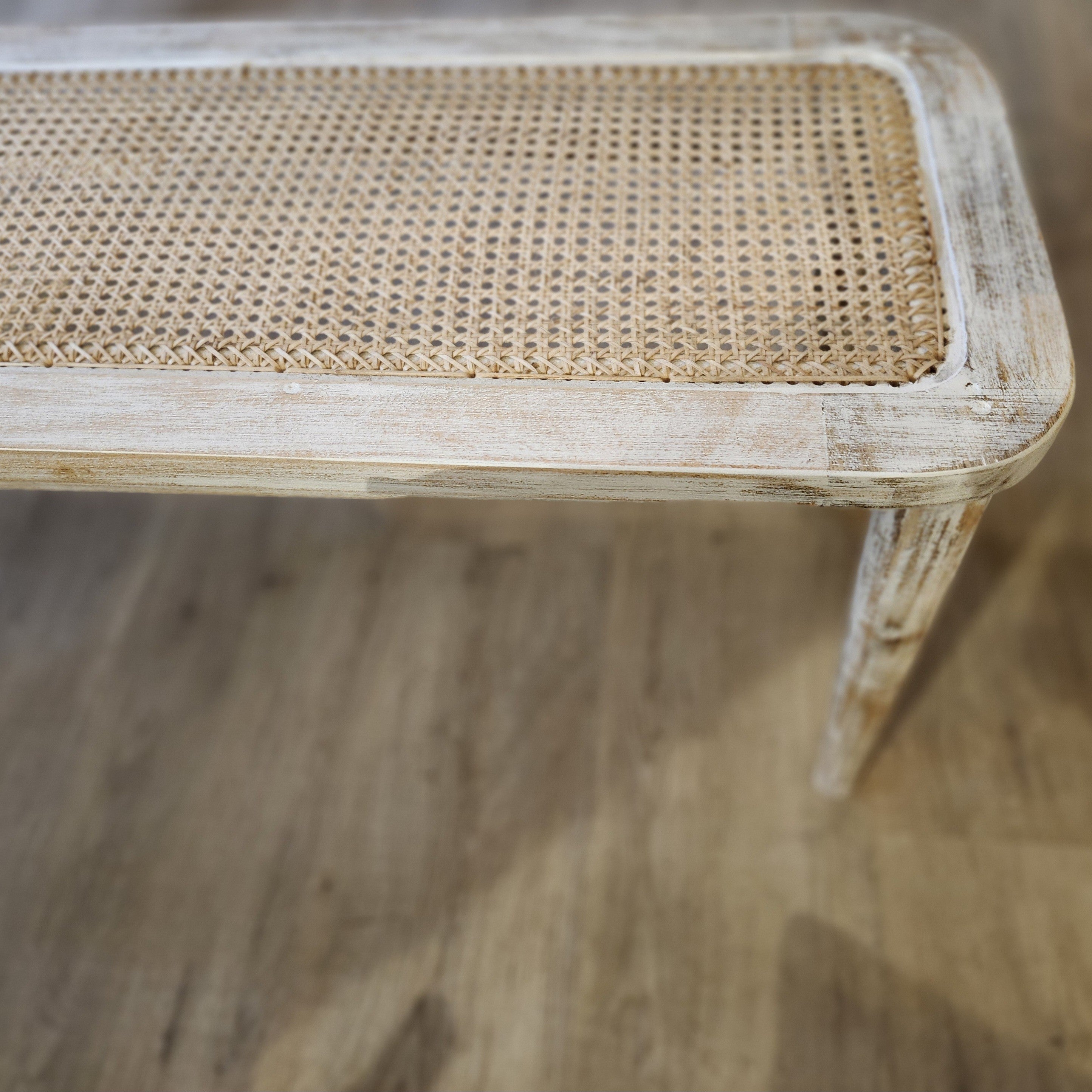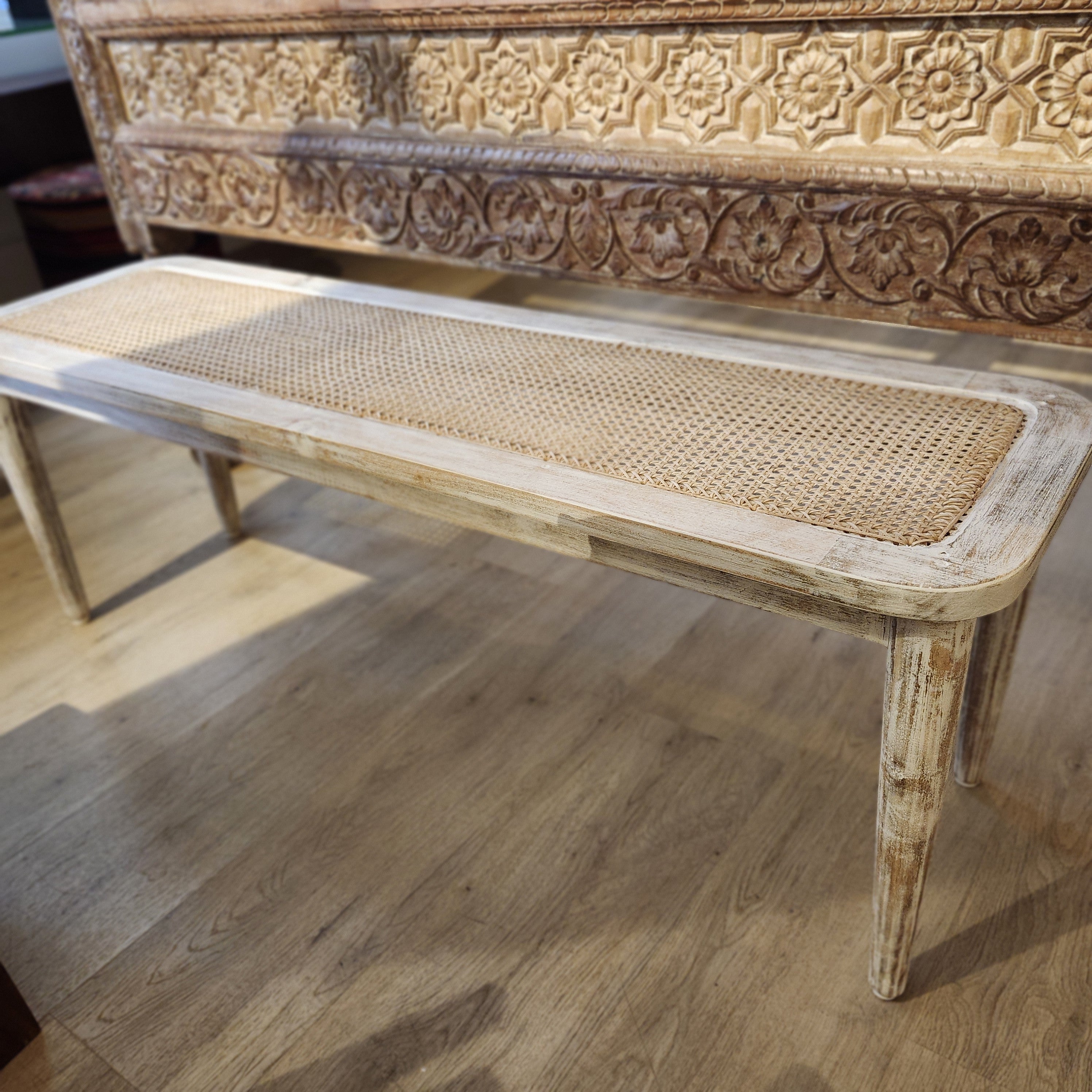 This bench has been crafted from mango wood, with a light limed finish, and a pretty cane top. Fluting on the legs adds a touch of elegance, and it would look fantastic at the end of a bed. We can supply a cushion if needed.