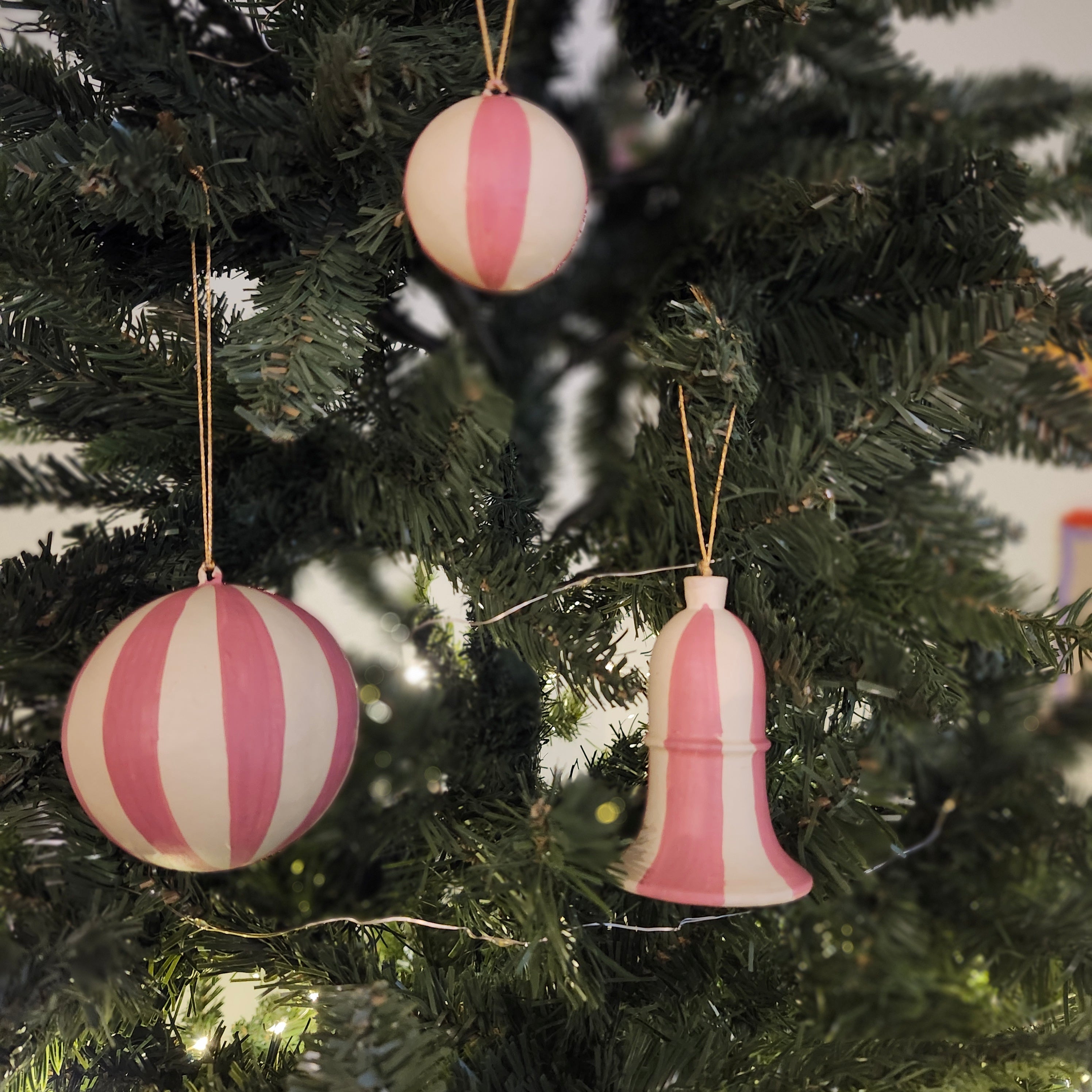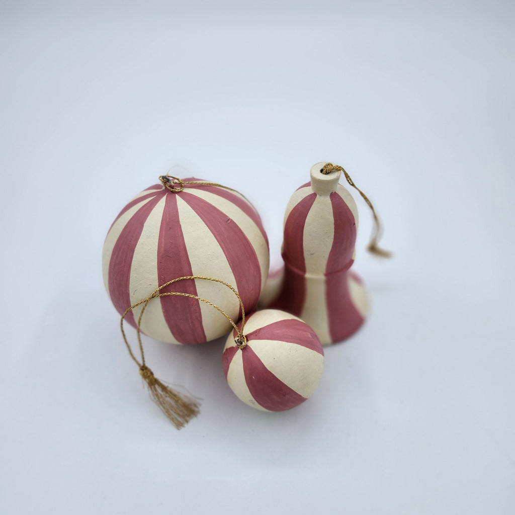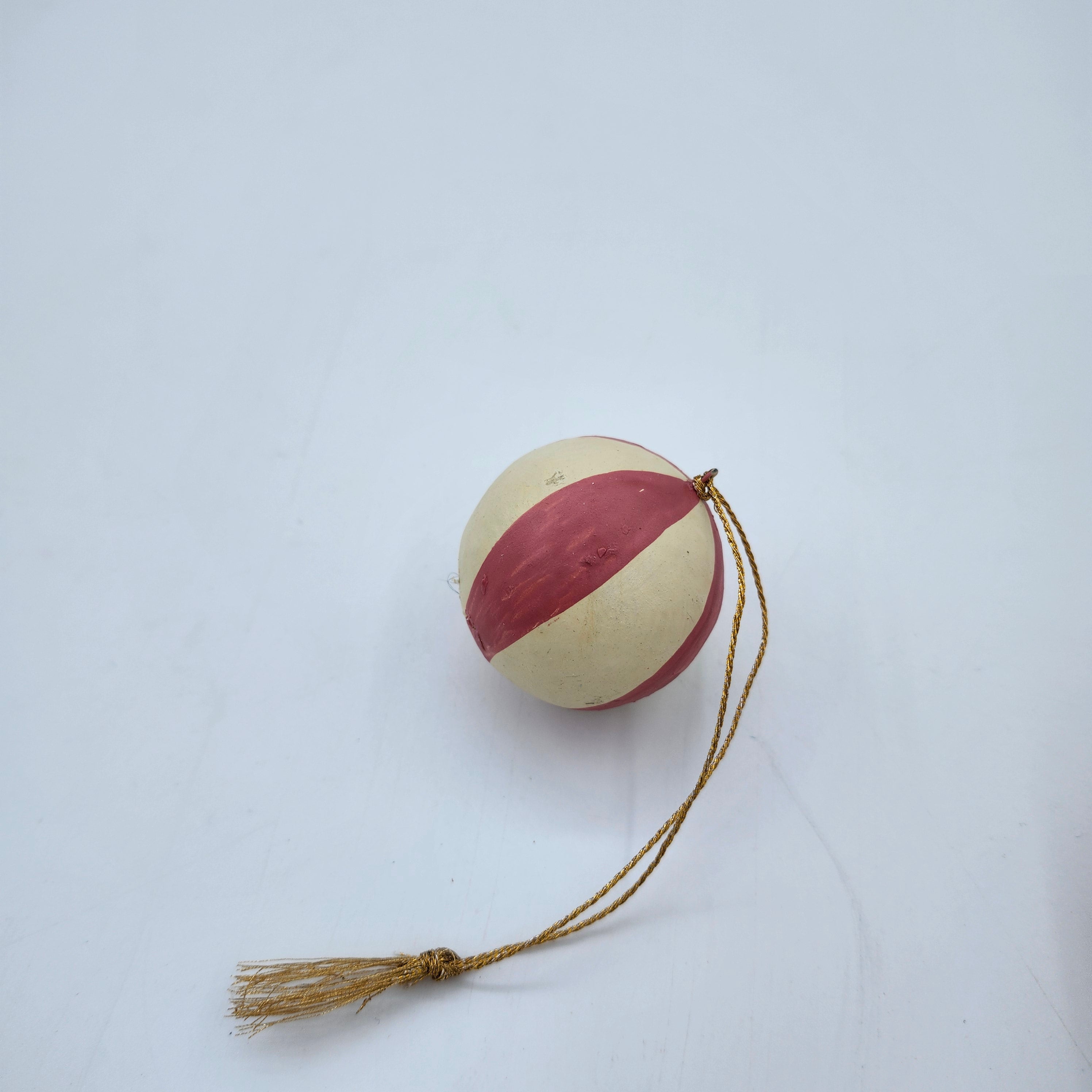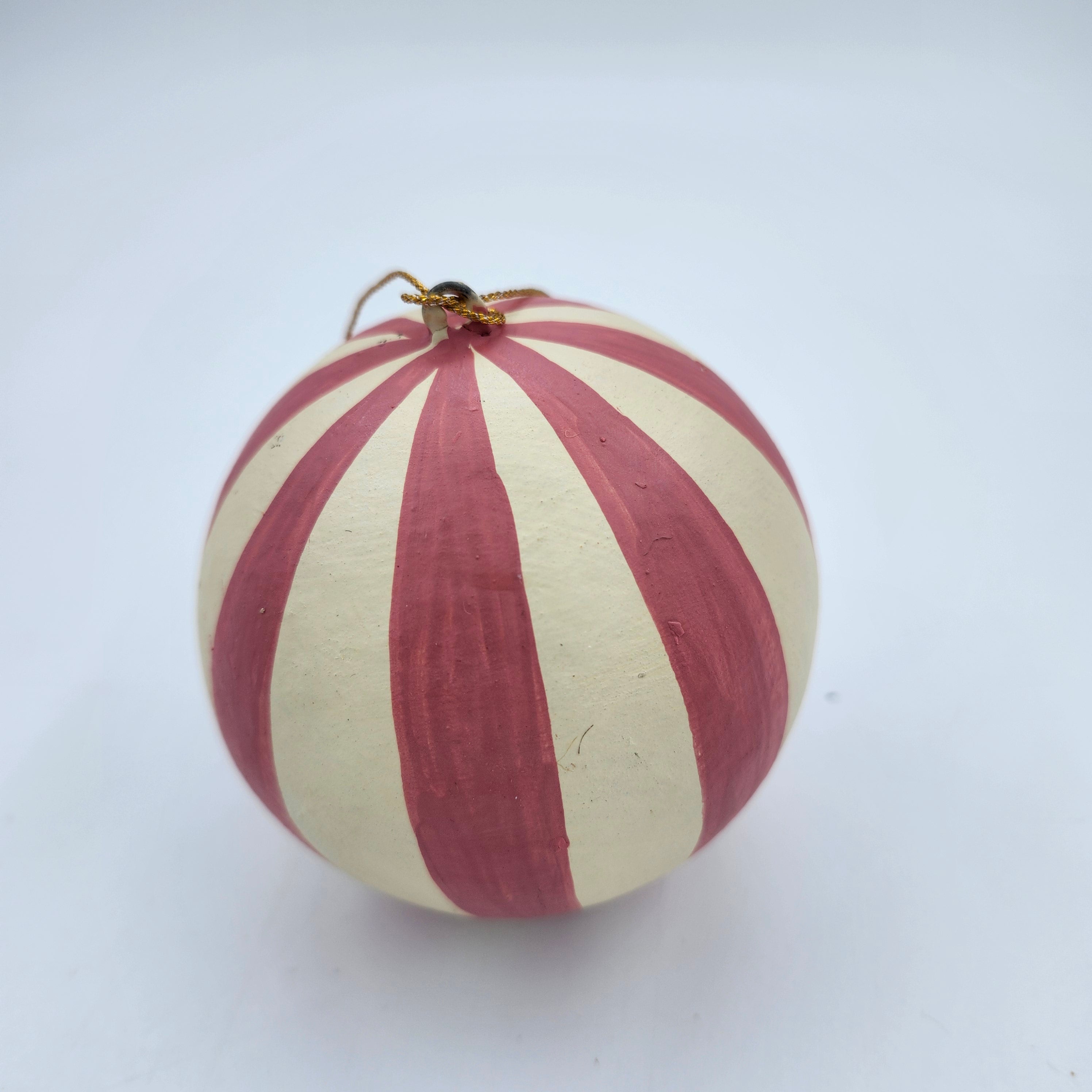 Handmade from papier mache in Kashmir, these delightful Christmas decorations have been individually hand-painted in cream with a broad pink stripe and finished with a matte varnish. They have a plain gold thread with a small tassel for hanging.