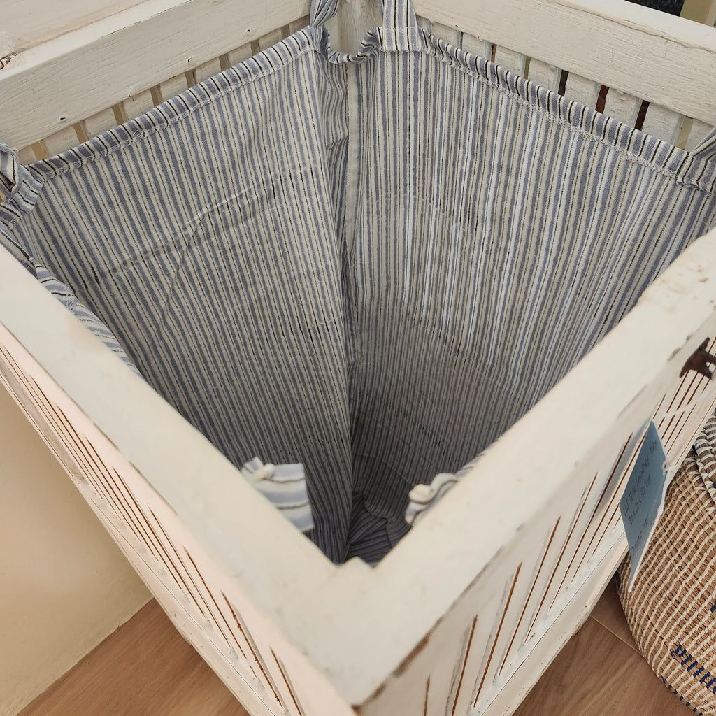 A high quality, upcycled piece with vintage and rustic style adding character to your bath/bedroom. The laundry box is crafted from teak wood finished with white paint. Slats at the top provide ventilation. The set includes a block printed canvas cotton liner in a white and grey stripe.