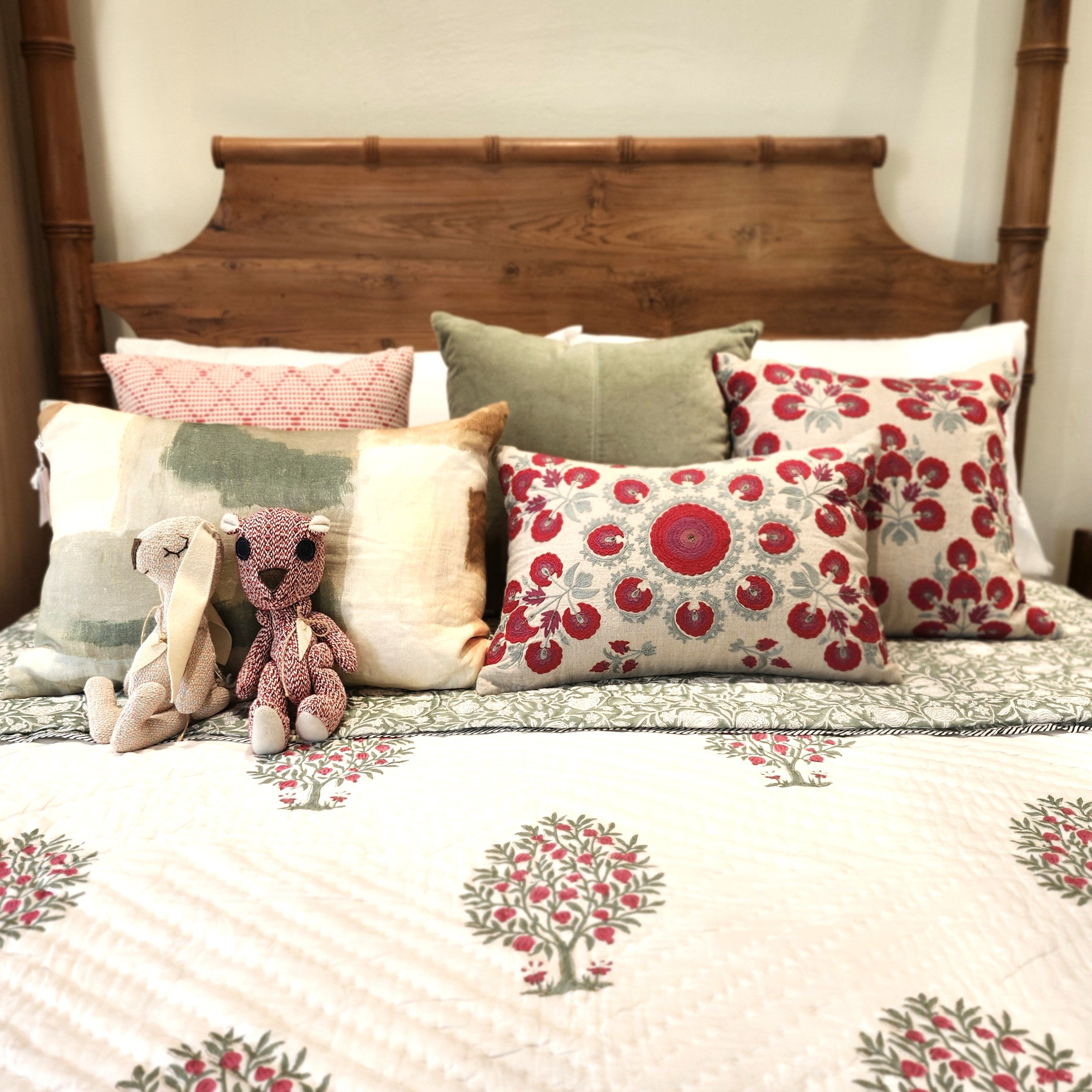 A stunning vintage four poster bed in queen size. The posts have been turned to resemble bamboo, and are topped with a finial. It features a curved headboard, with a bamboo effect trim.