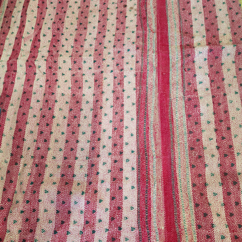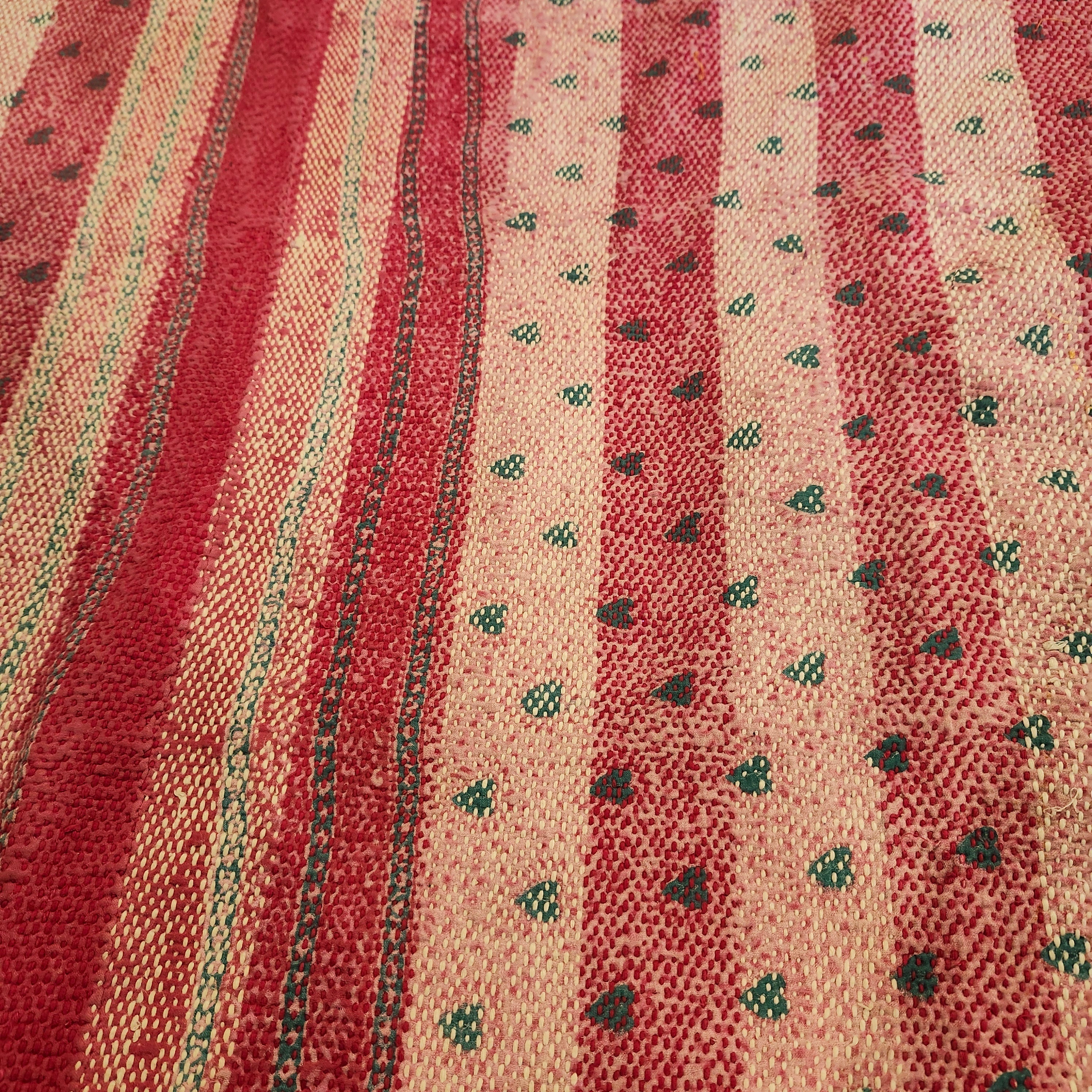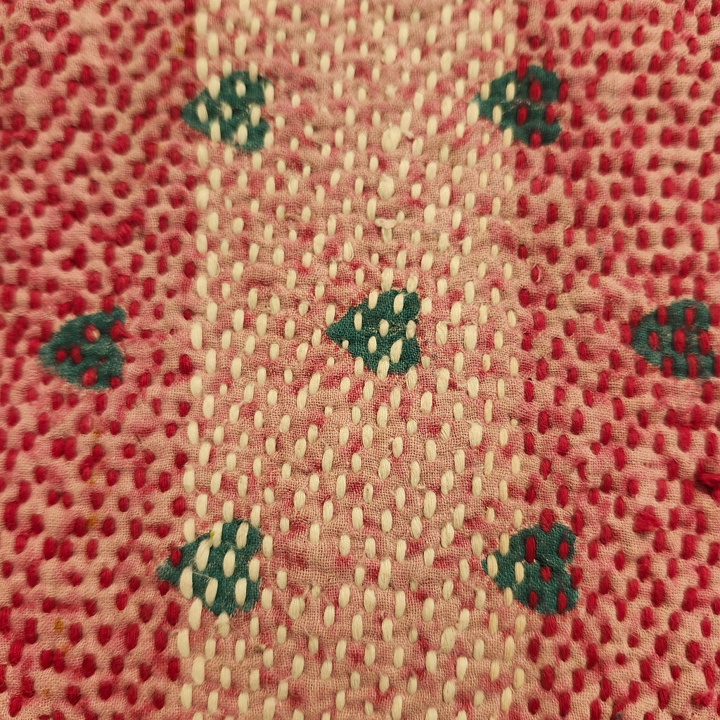 Our vintage kanthas have been chosen for the exceptional quality of the handiwork, the fine stitching and the beautiful faded colours and patterns. Each piece is handmade and absolutely unique, and the appearance is different on each side. There are obvious areas where another piece of fabric has been patchworked in, but this is part of the charm. We're calling this one 'Rasberry' because it's so....rasberry.