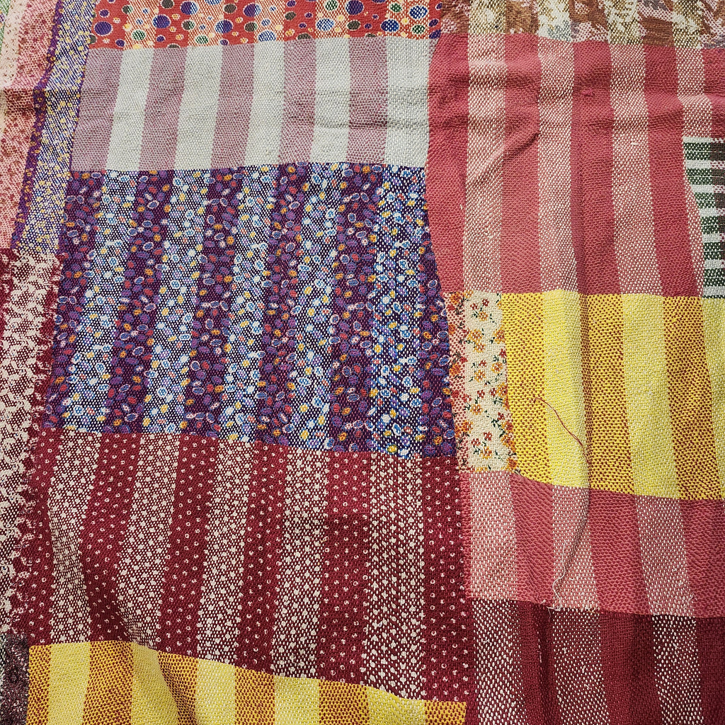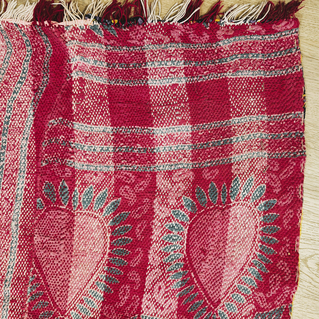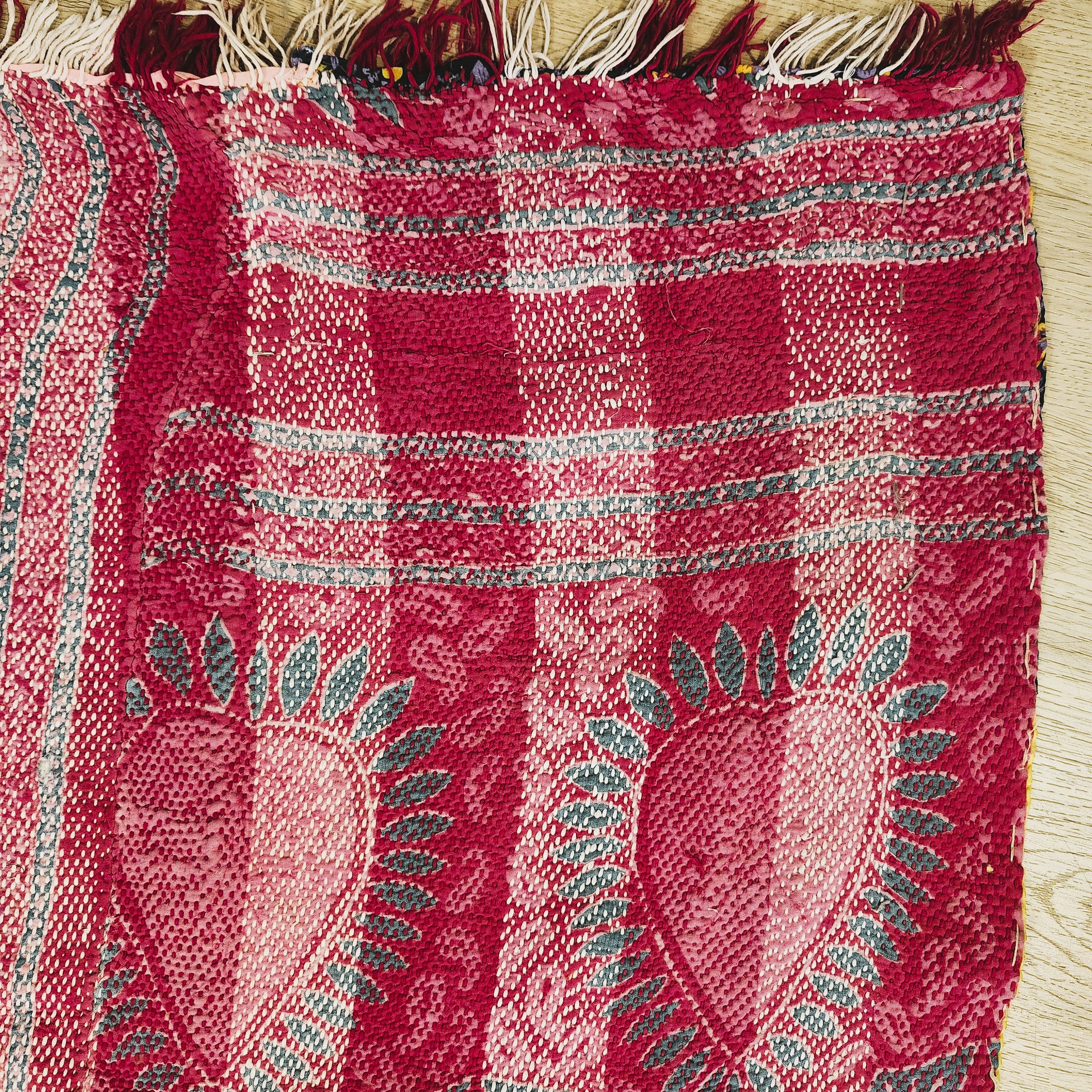 Our vintage kanthas have been chosen for the exceptional quality of the handiwork, the fine stitching and the beautiful faded colours and patterns. Each piece is handmade and absolutely unique, and the appearance is different on each side. There are obvious areas where another piece of fabric has been patchworked in, but this is part of the charm. We're calling this one 'Rasberry' because it's so....rasberry.
